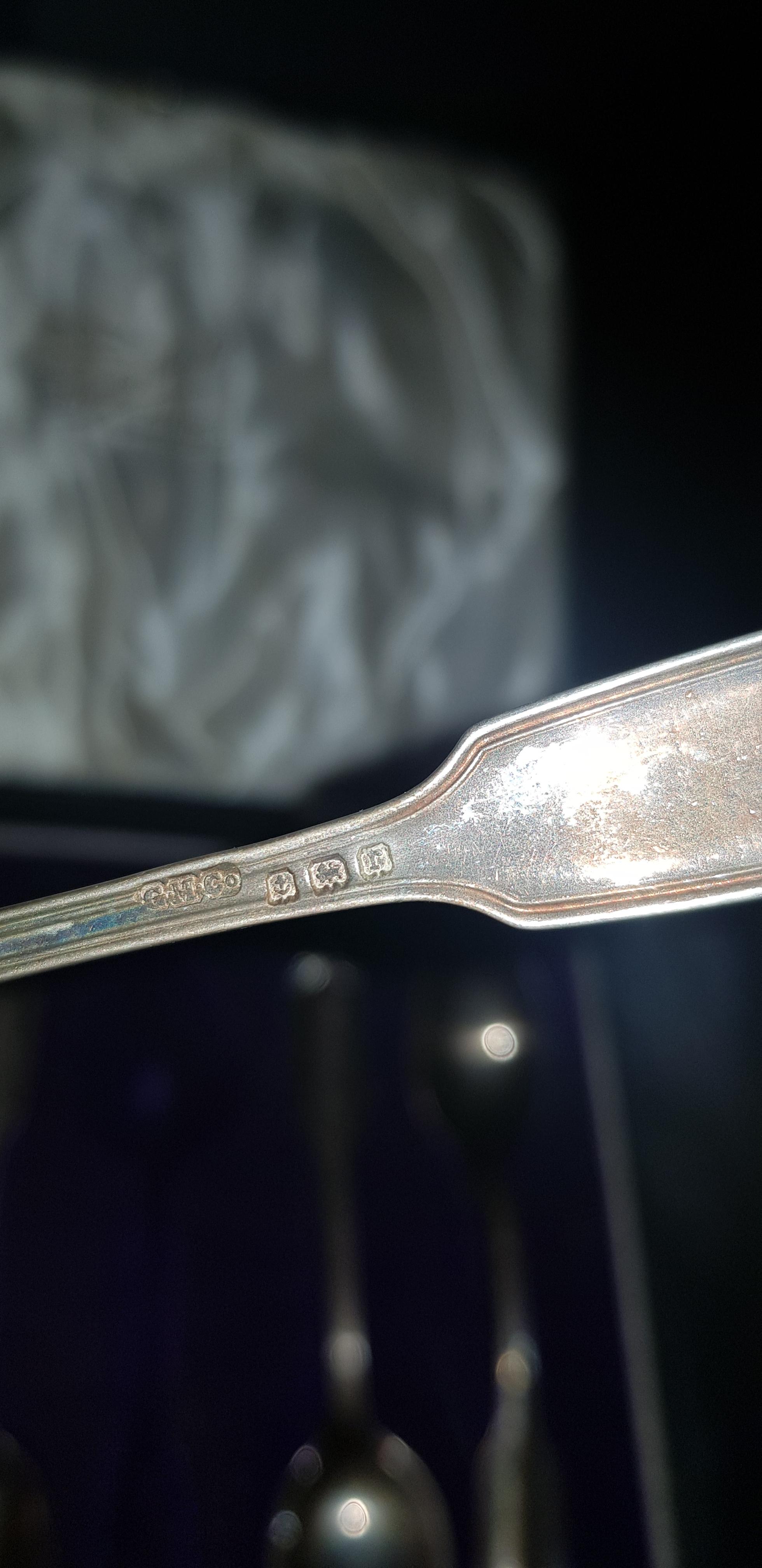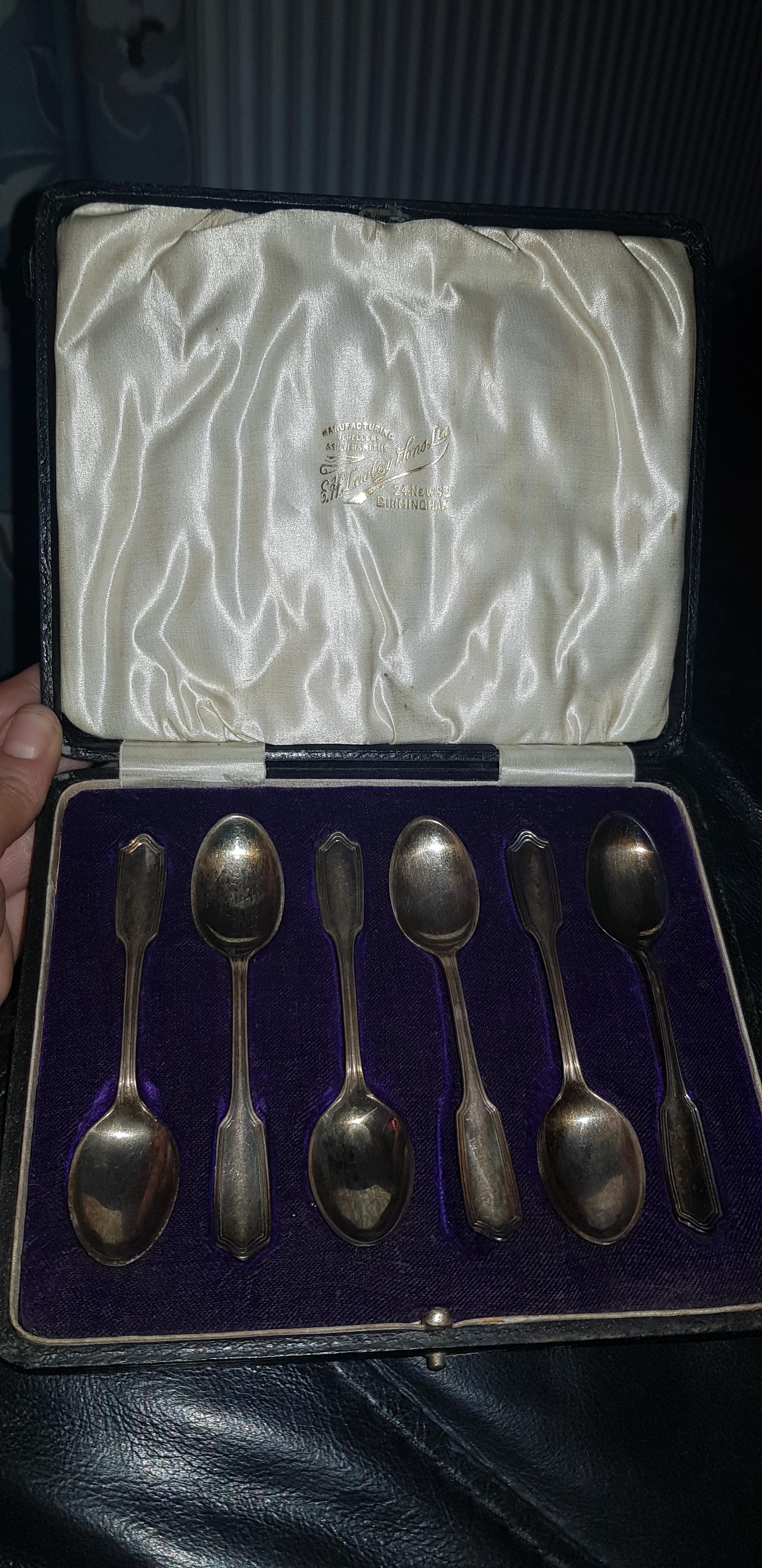 6 piece teaspoon vintage set with hall mark GMCo in original box silk cushioning embroided with E.H Lawley Honsles. How much are these worth and what age era