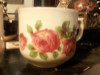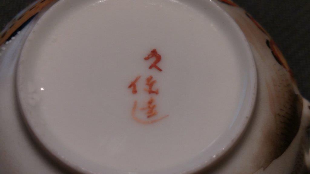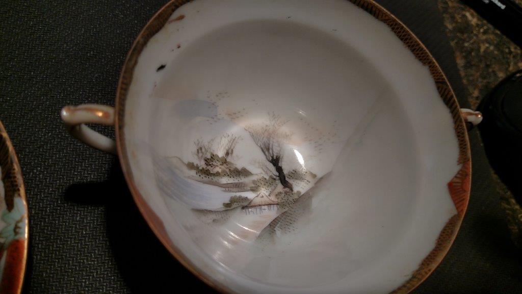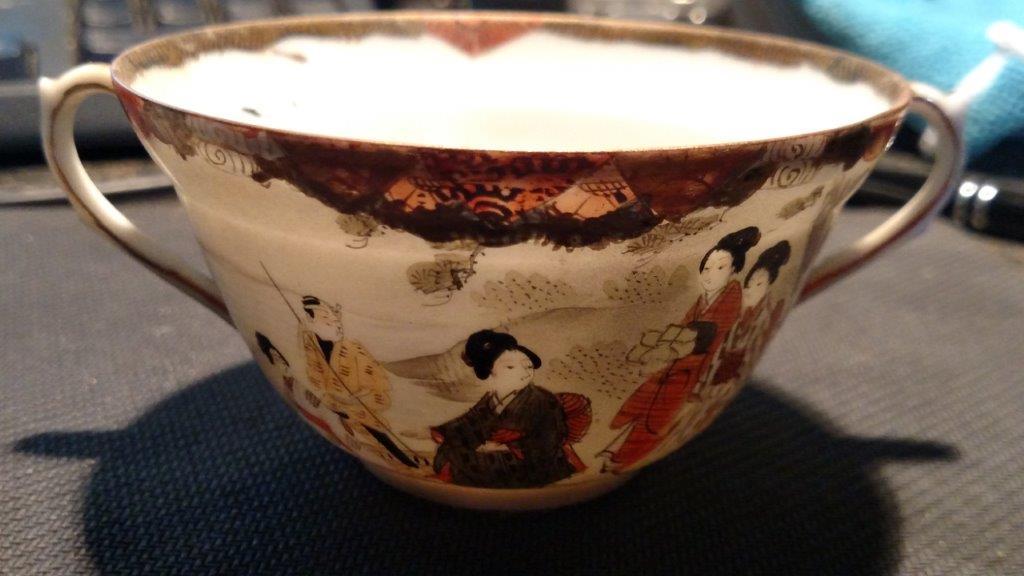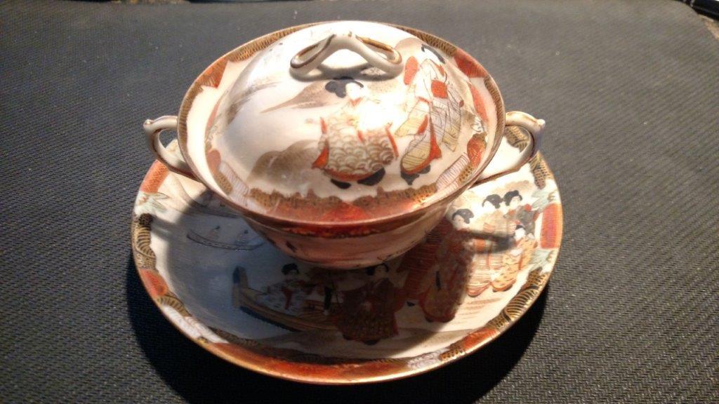 Geisha themed hand painted tea cups with saucers and lids. The tea cups are dual handled