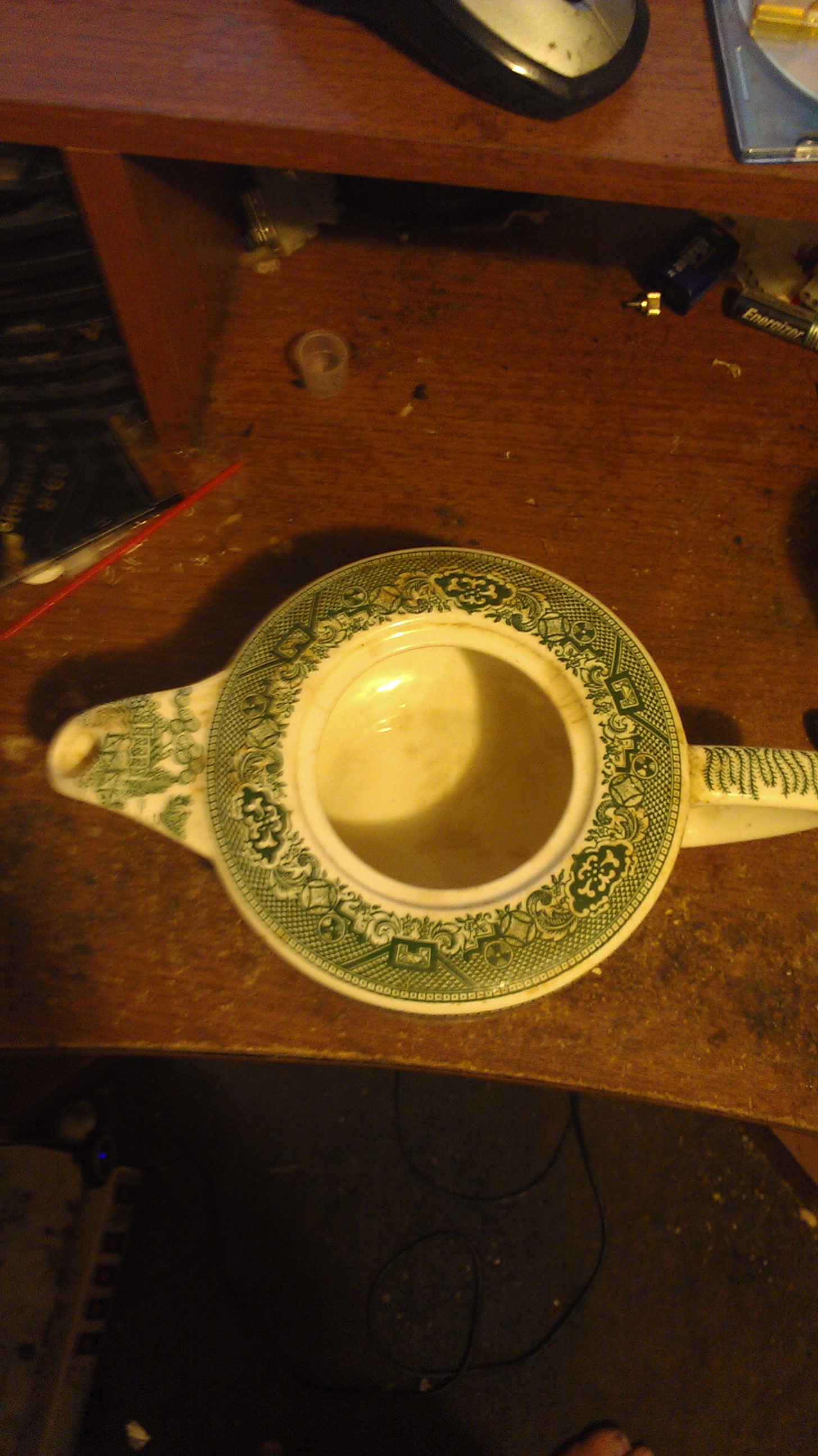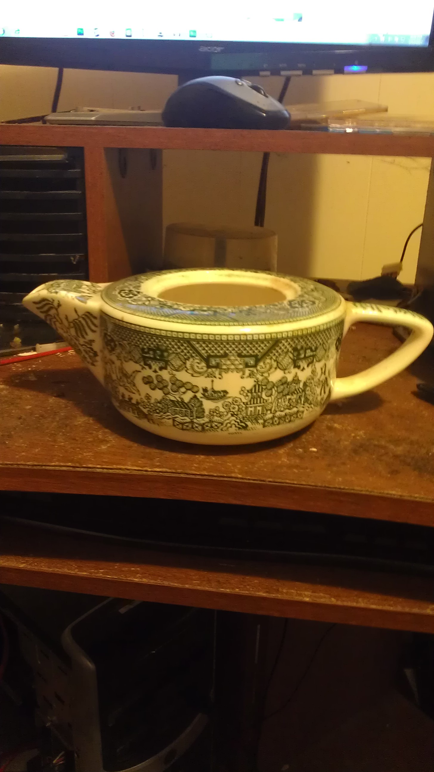 I have what looks like a small teapot. It's a mirror image of the Royal China WillowWare piece pictured on EBay (link: http://tinyurl.com/c5fyw6f), except for two things - my piece has a green design, while this and most other WillowWare pieces I've seen have blue designs, and the spout isn't completely flat - it droops down a bit at the end. I can't really find one like it at any of the three antique stores in my area, nor can I find anything like it on Google, which is leading me to believe it's either rare, or a reproduction. Really, I'm just wanting to know if it's a reproduction - this piece is too beautiful for me to want to part with, plus it's my great-grandma's. :)