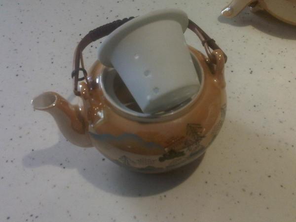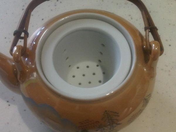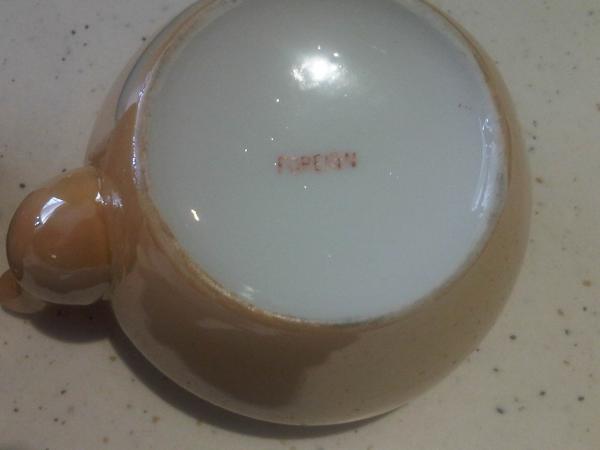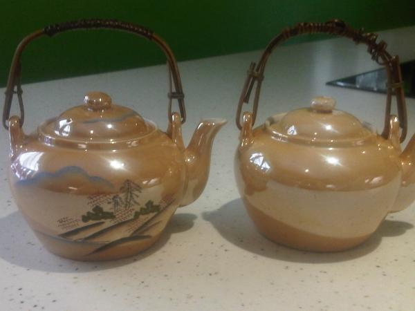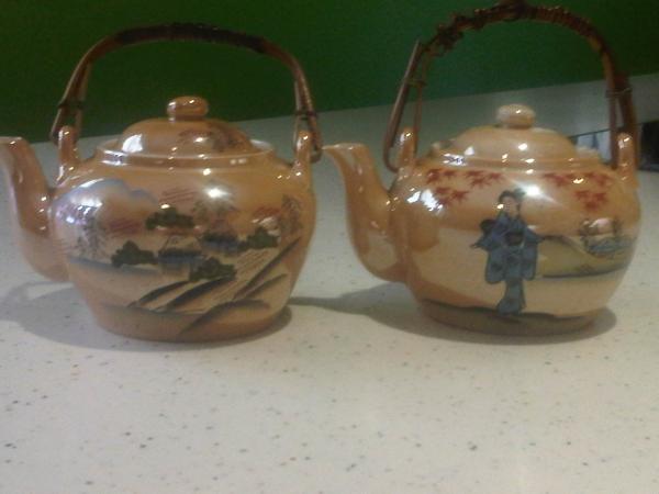 Two Tea pots with Japanese disigns on them. Wicker wood handles. On pot has a removable pot tea strainer with it. They are both Marked with the word foreign on the base. I have no idea where the pots were made as there are no distinguishing marks on them.