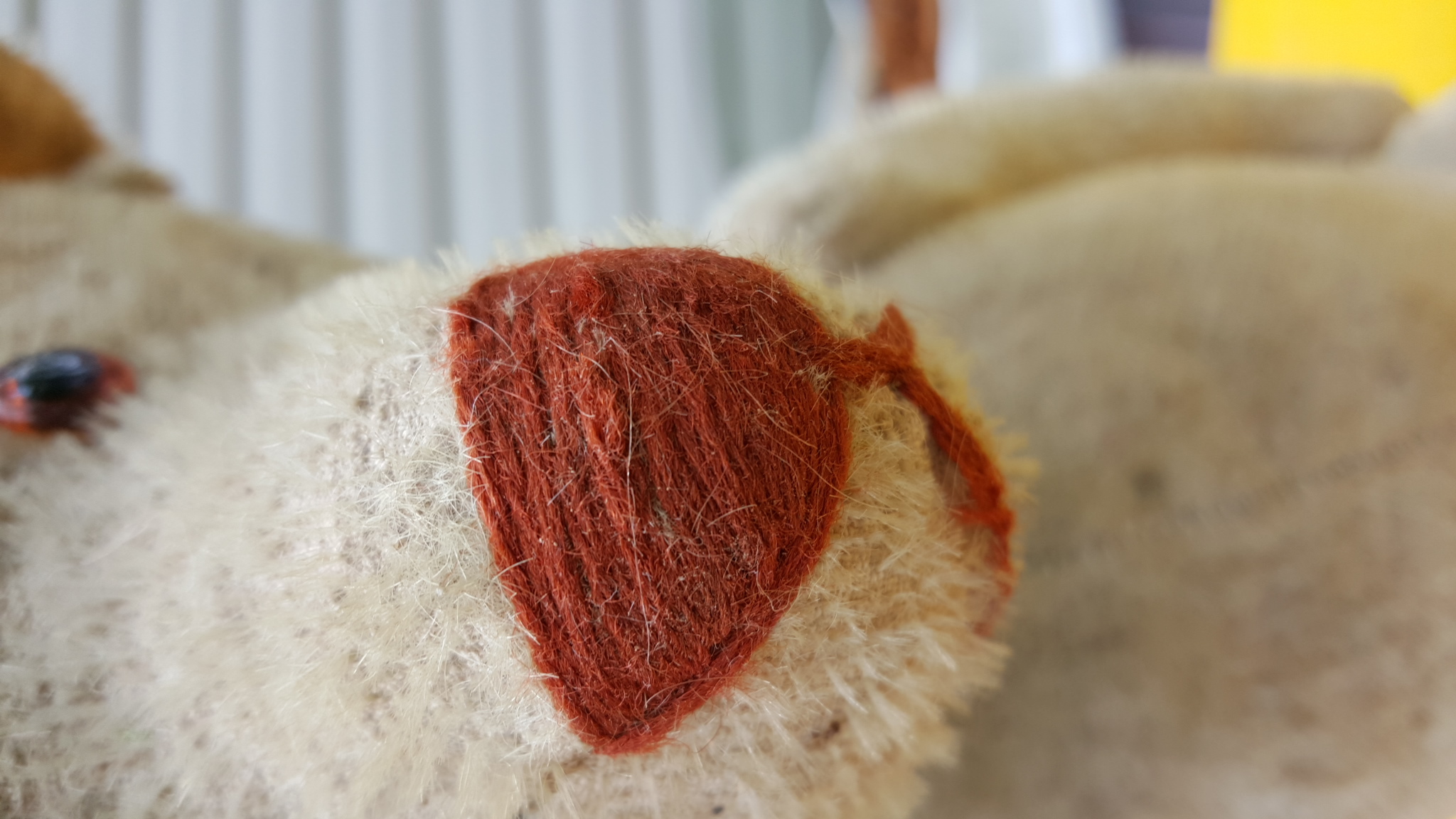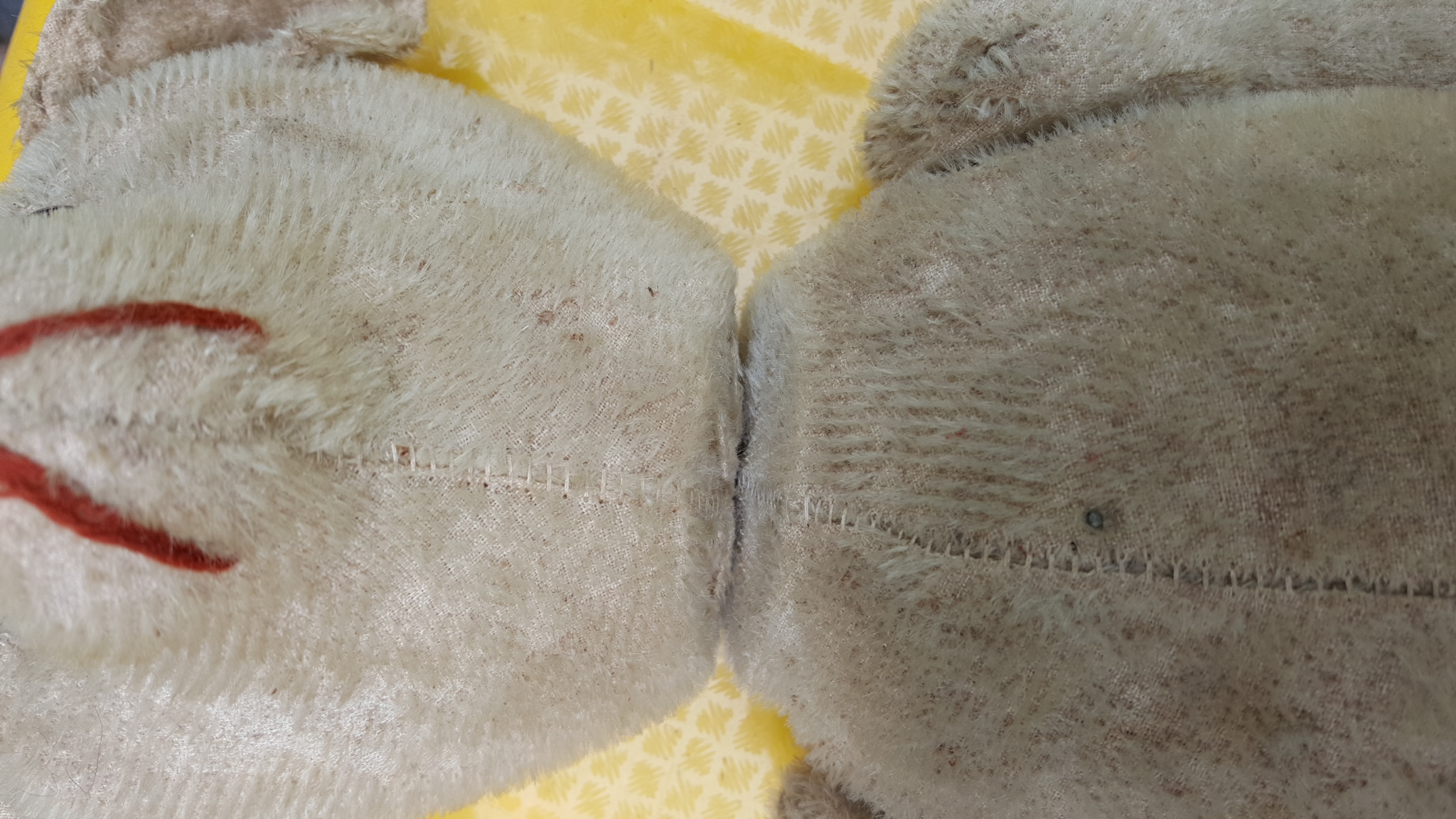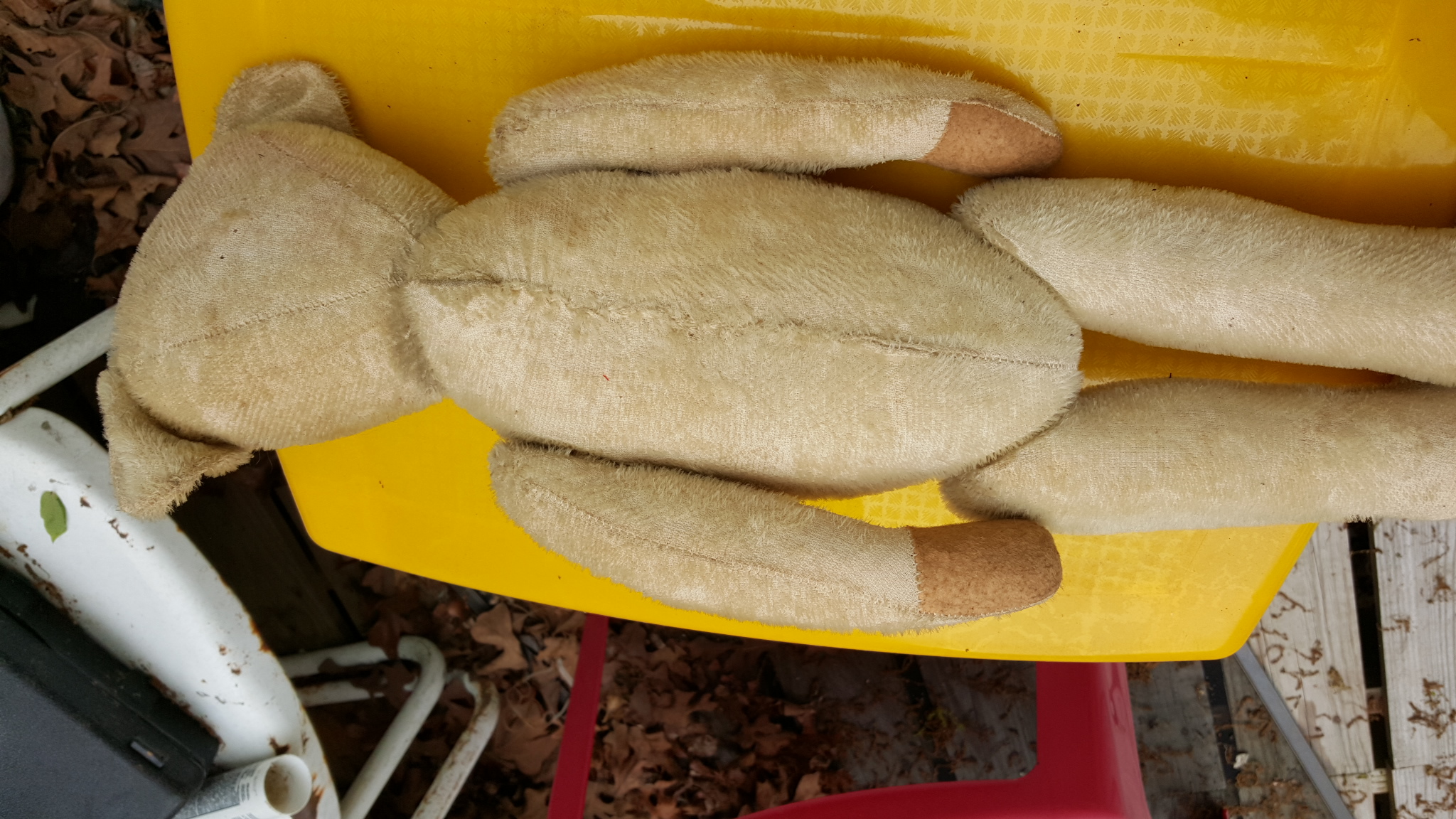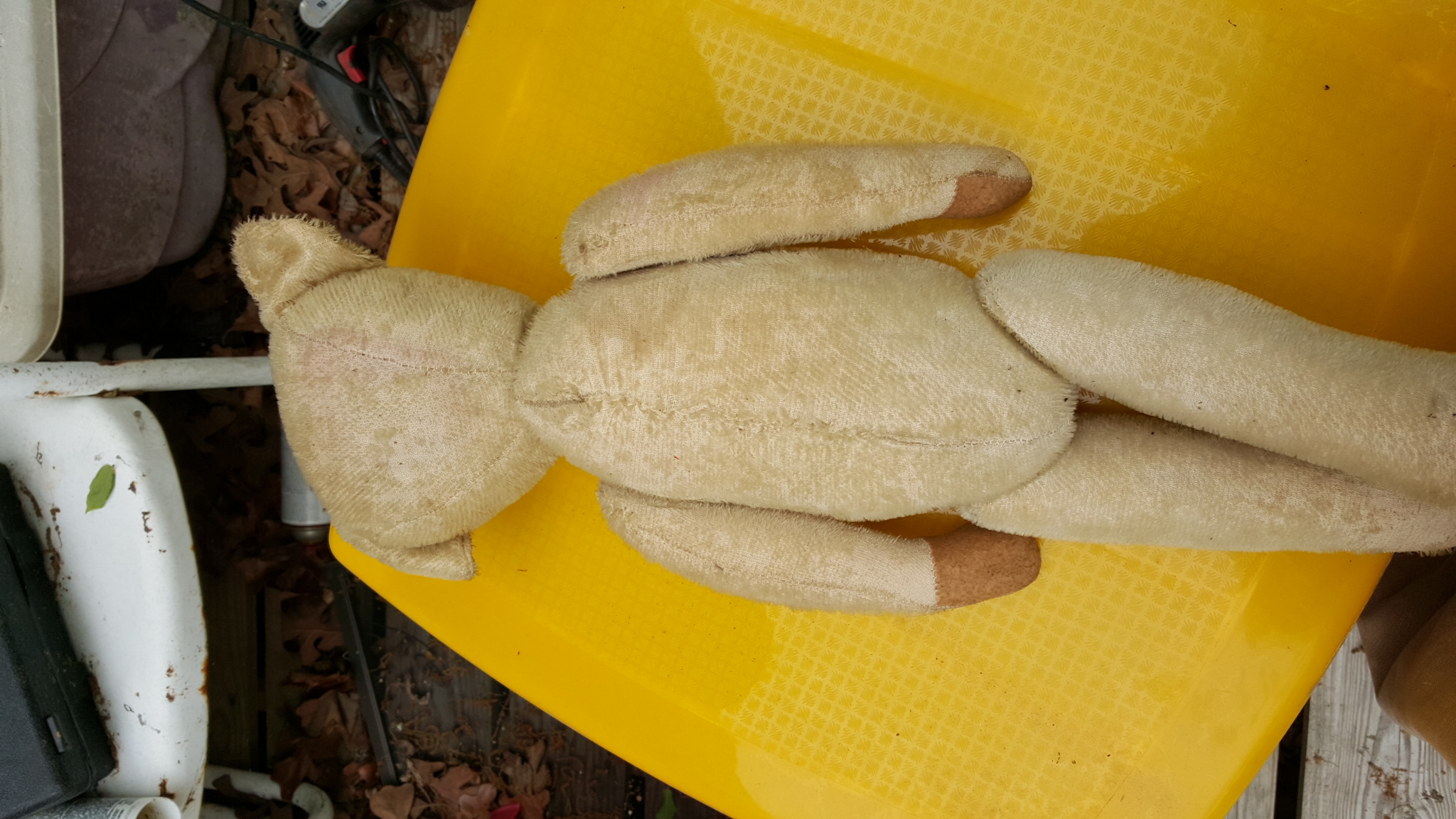 The bear is 20 inches in height it has slight worn hair on back of head and some on arms has a wire running from arm to arm and up to neck and also from leg to leg the nose is a red stich button eyes all original