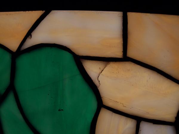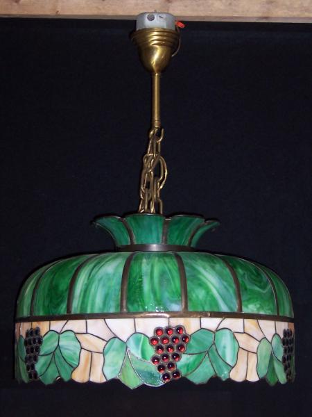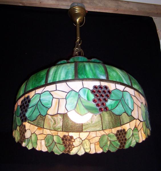 This 100 year old lamp lamp (as seen in the photos) is basically in very good condition. A few (five) pieces of glass do have minor hairline cracks, but none are loose or separated. (One of the photos shows the worst of these.) No identifying marks are present, and the maker is unknown.