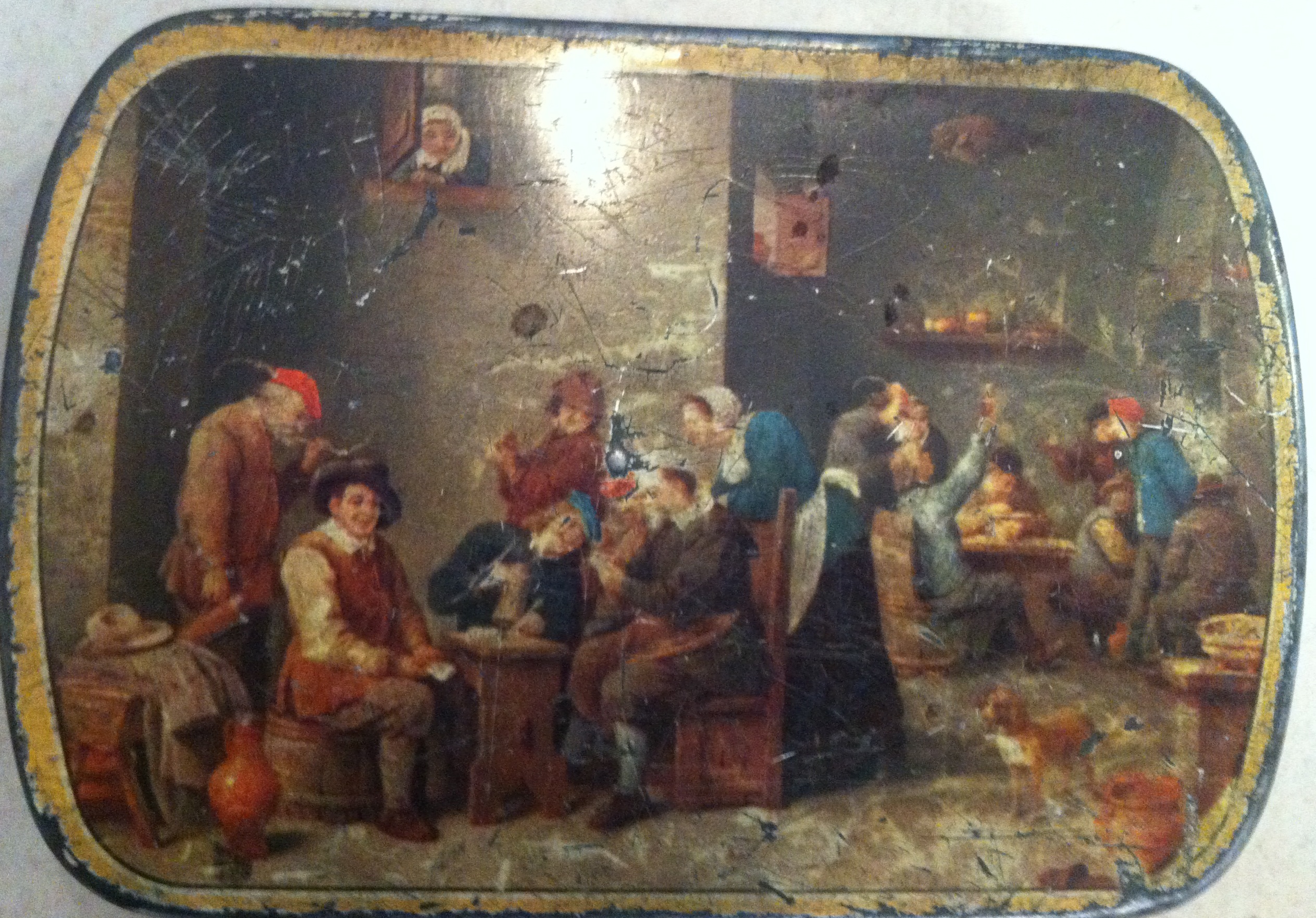 Possible tobacco tin with brown bottom and painting on lid. After some online research, we believe it could be a D. Teniers print on a tobacco tin, with the typical tavern scene, including a dog and a man with a red cap that has a feather in it. approximately 3 in x 2.25 in x 1 in.