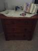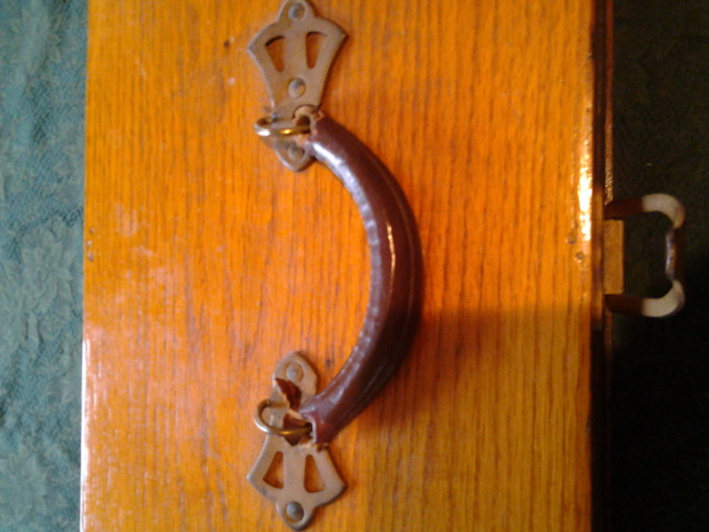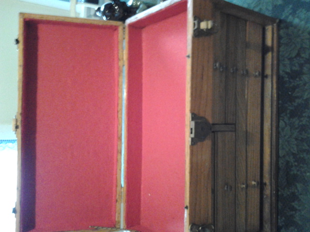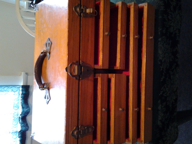 tongue and groove display chest it has 8 drawers no screws, leather strap handle in prestin condition