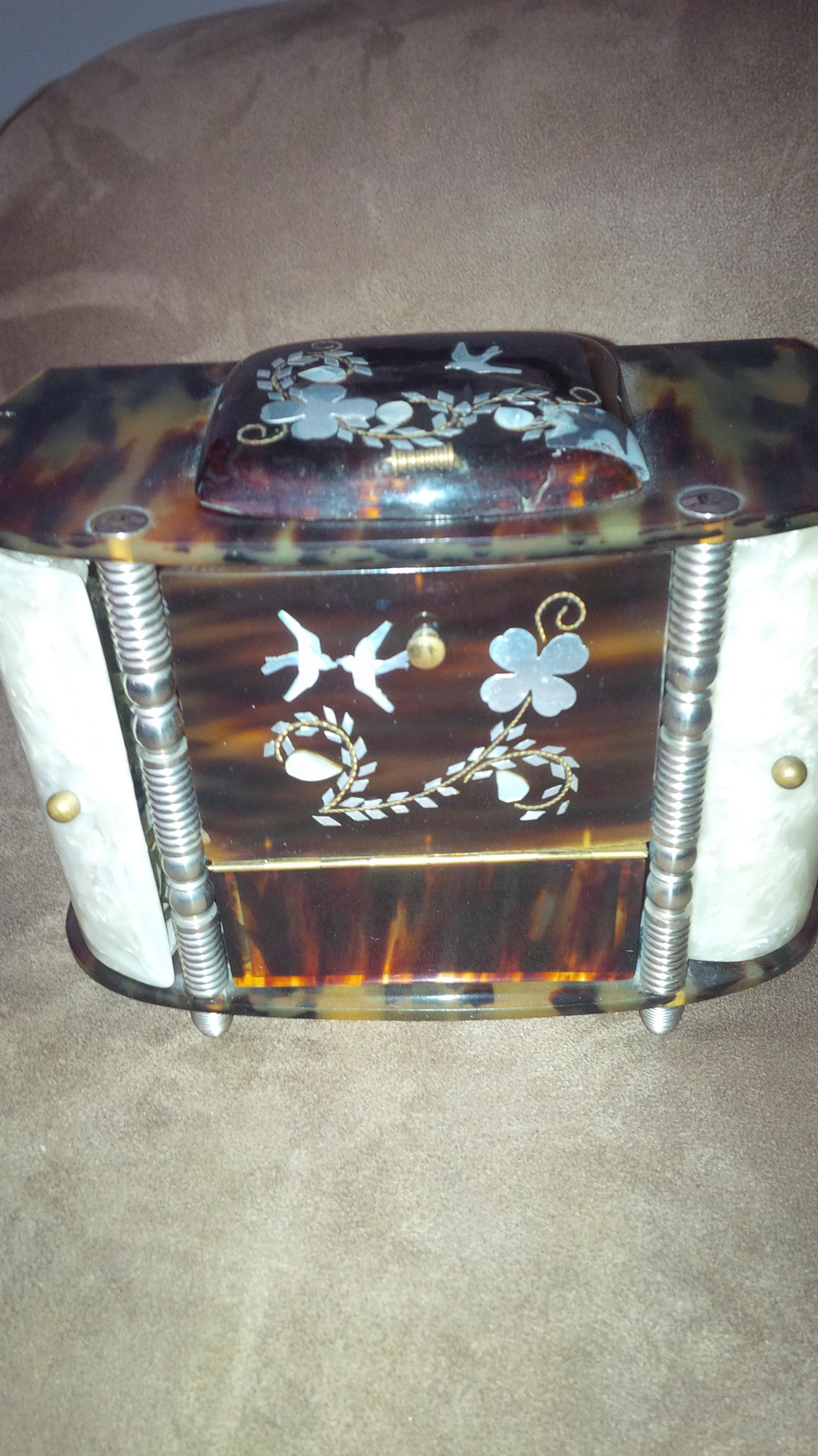 I have an antique tortoise shell, mother of pearl and silver leaf music box that my grandparents bought in Europe at least 40 years ago. The only markings on it are a red diamond shaped sticker reading "MARCA DI FABBR." and a DDF emblum. Any idea on where to start to get information? It looks to be a jewelry box and opens to a stage with two ballerina type ladies twirling.