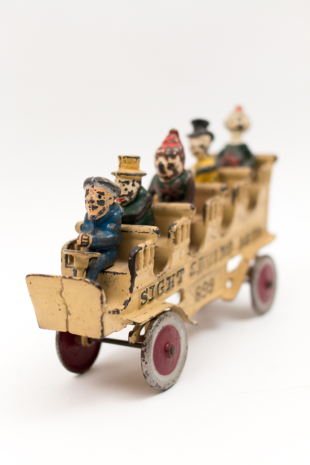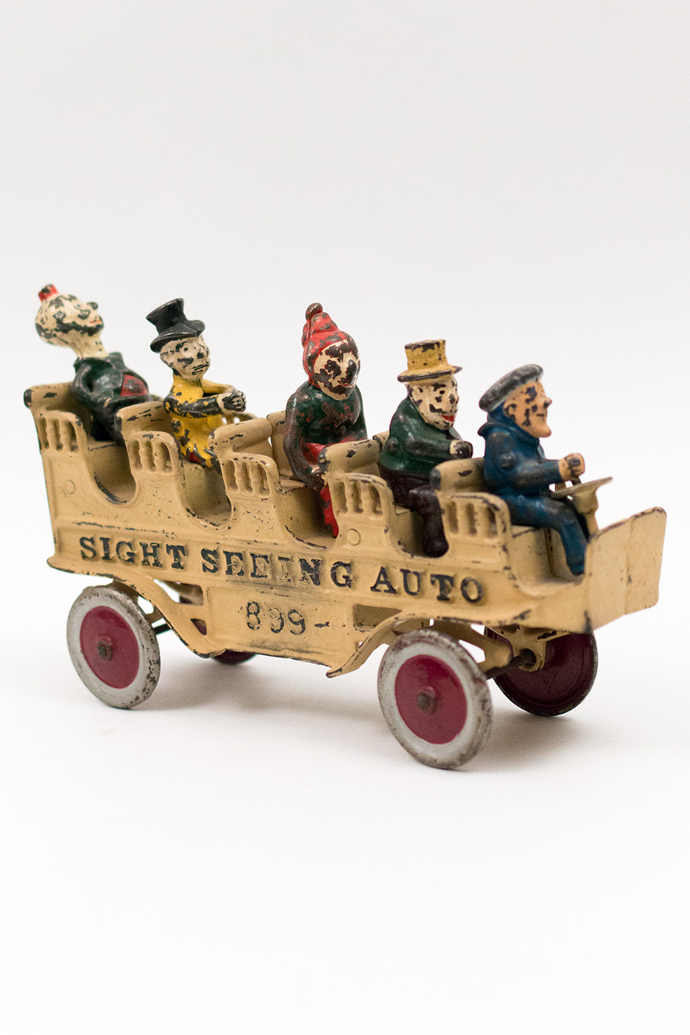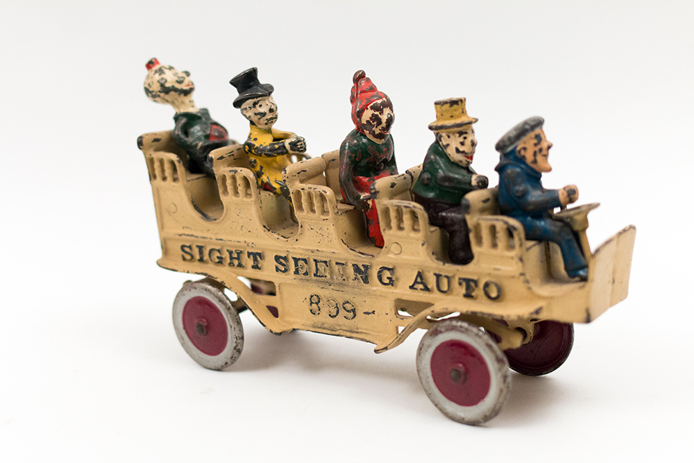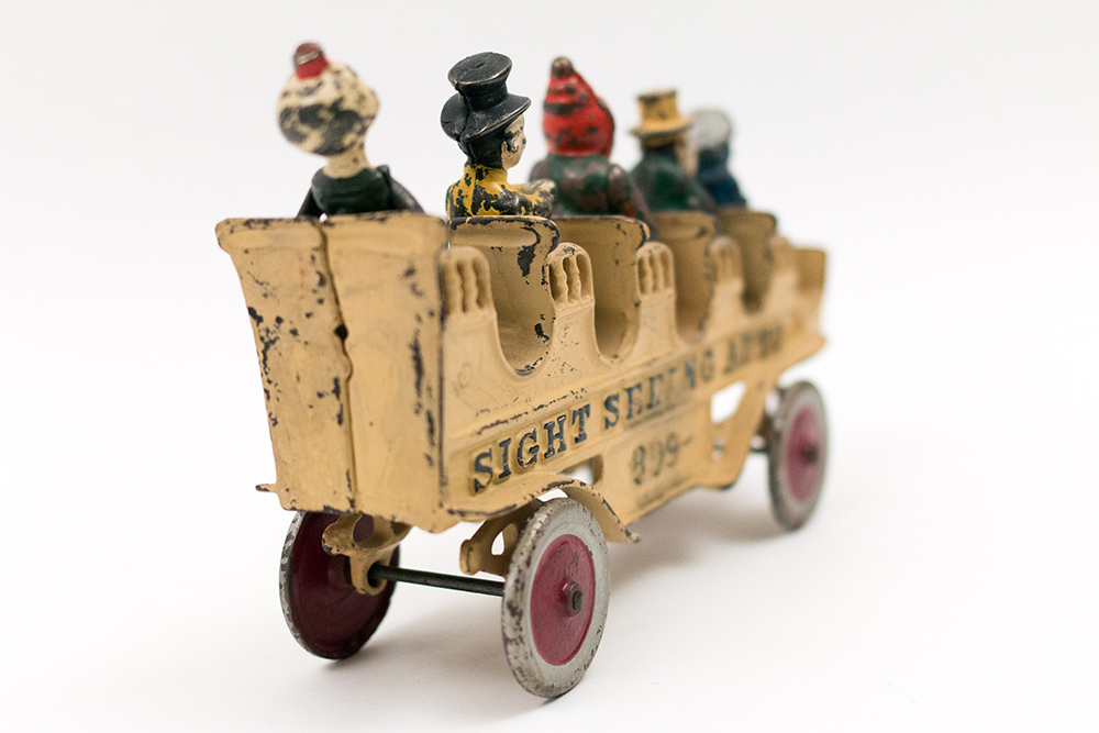 This toy likely dates back to the early to mid-20th century, a period characterized by a boom in toy manufacturing. The "SIGHT SEEING AUTO" was produced by a well-known toy company, possibly in the United States, which specialized in tinplate toys. These toys were often designed to reflect contemporary societal trends, such as the rise of automobiles and leisure travel.