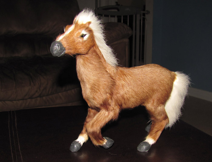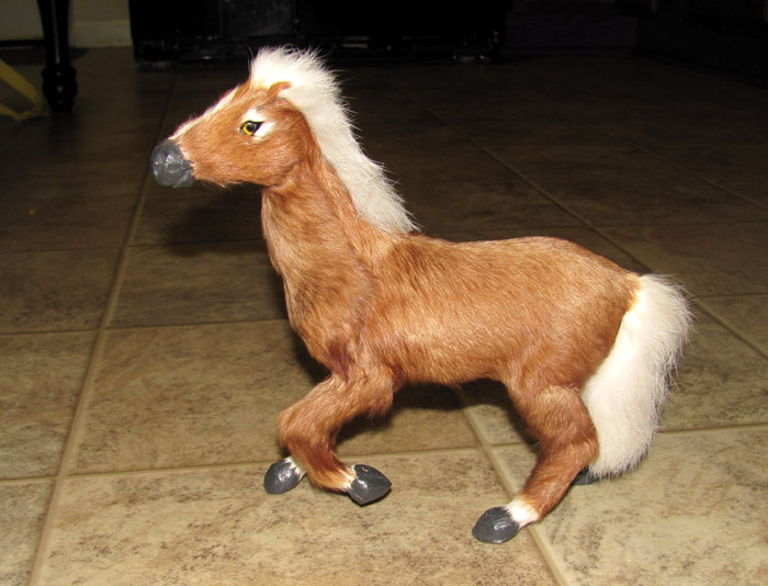 Antique toy horse made from authentic horsehair, has glass eyes, a white mane and brown hair.