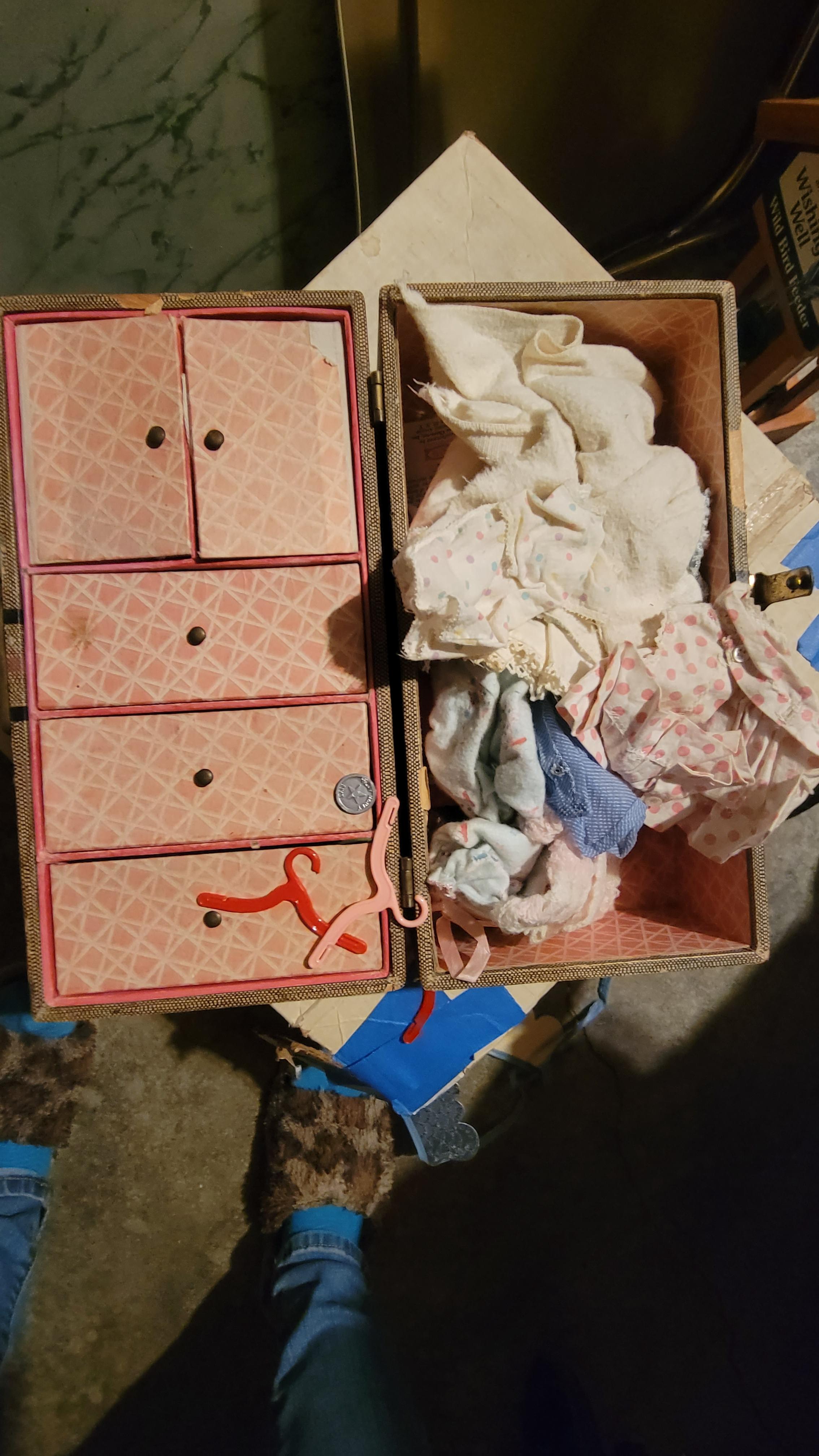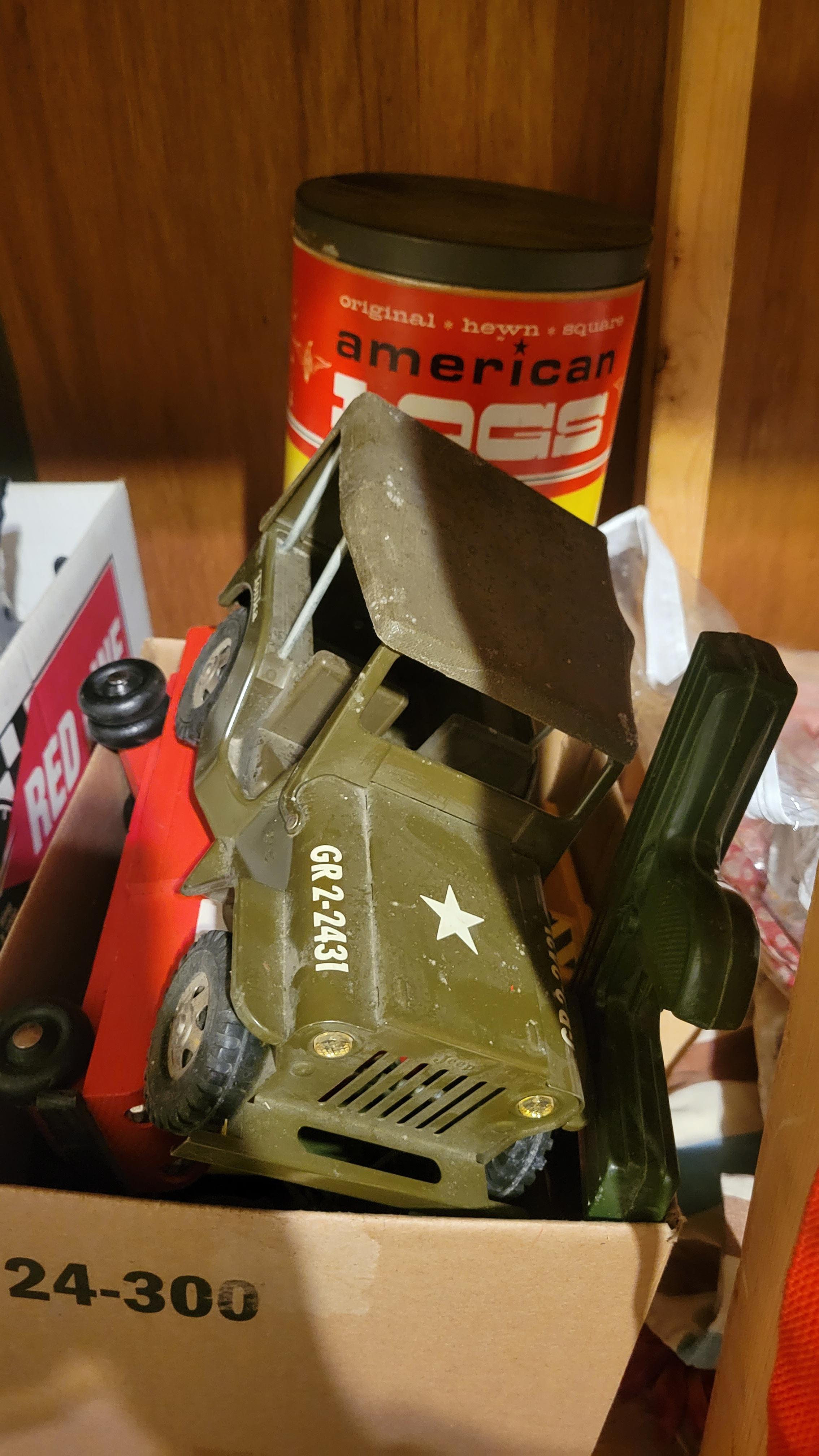 Army truck toy. Lincoln logs. View finder. Doll clothes/box.