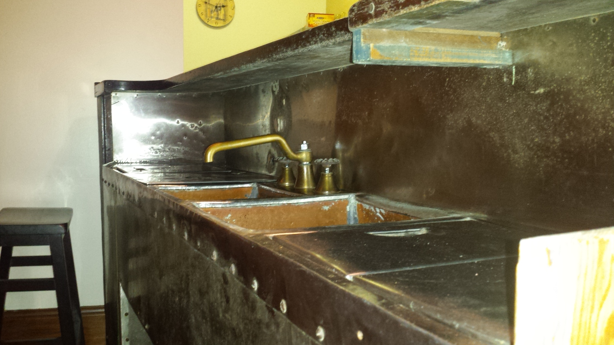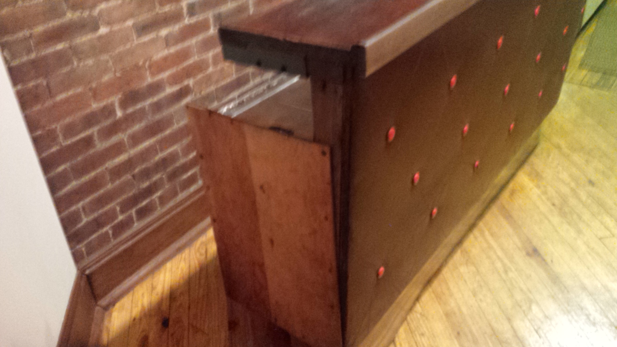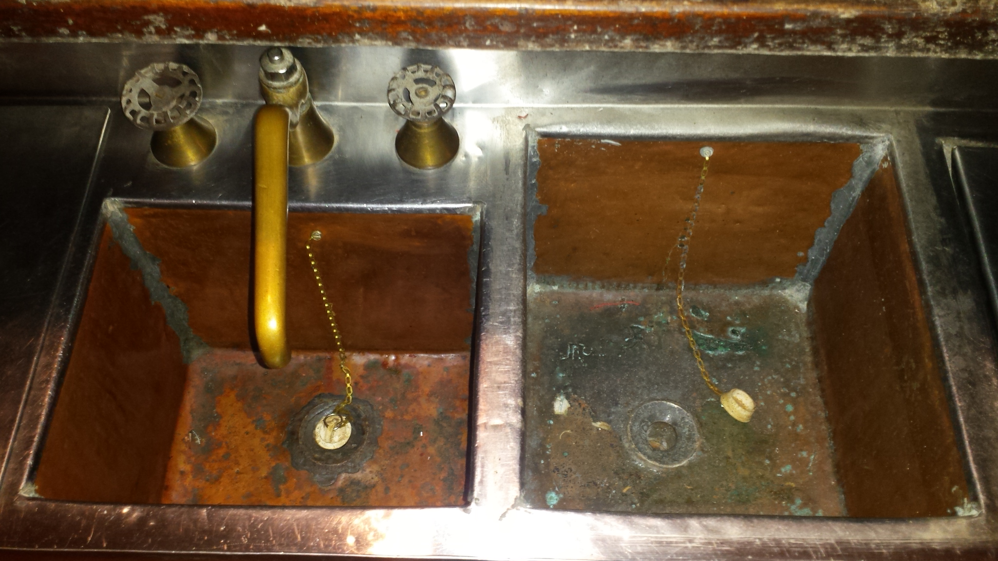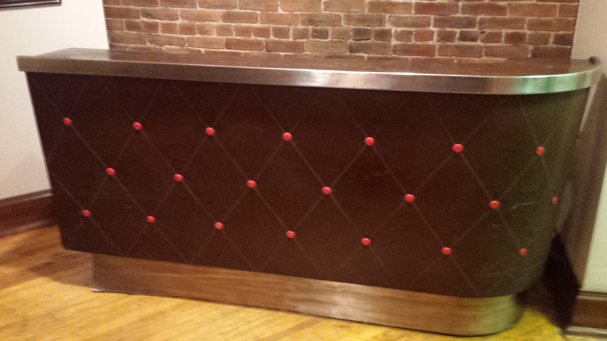 Antique bar 7 feet long. Brown leather front with red leather buttons. 1" thick wood bar top could be mahogany. bar contains 5 copper sinks/ ice bins each with a drain. Plumbing connects all drains underneath the center sink. Faucet is all brass.