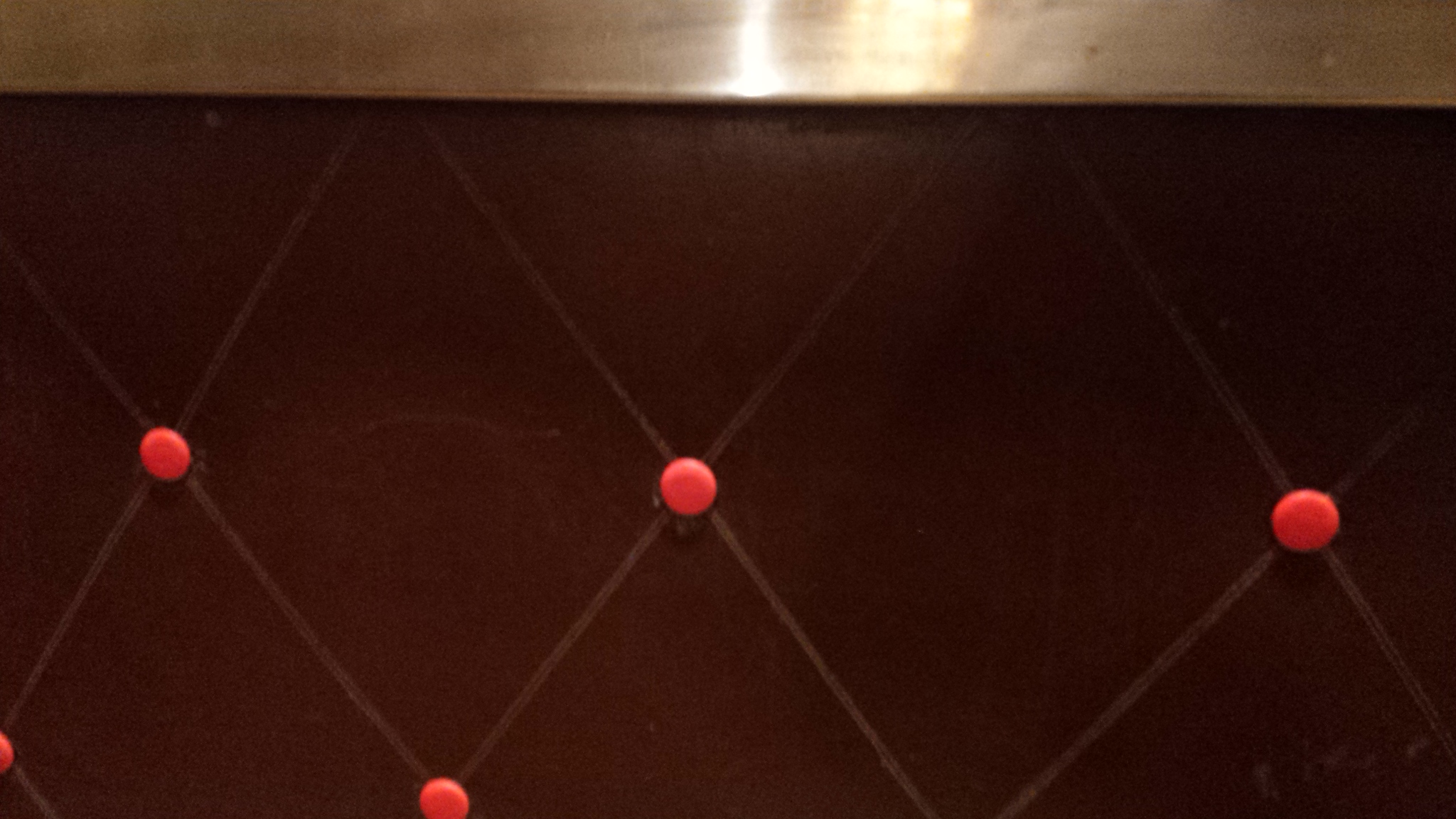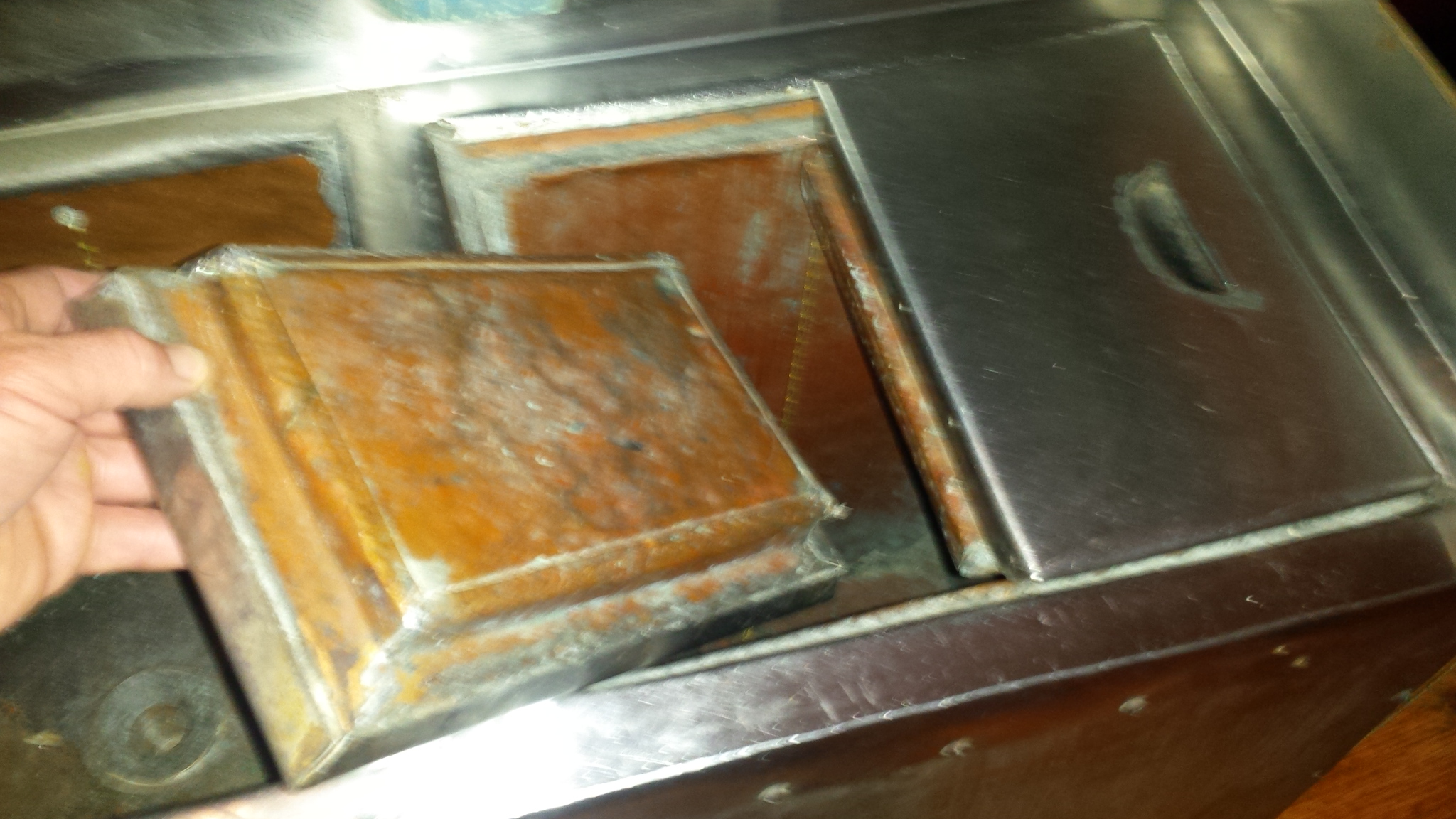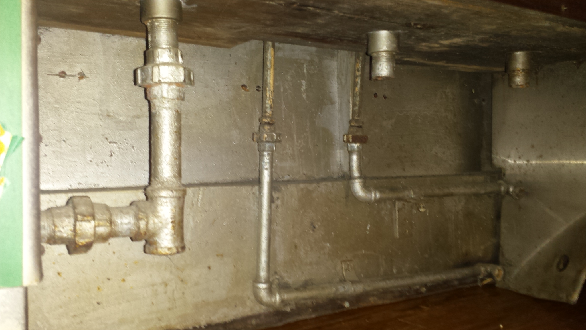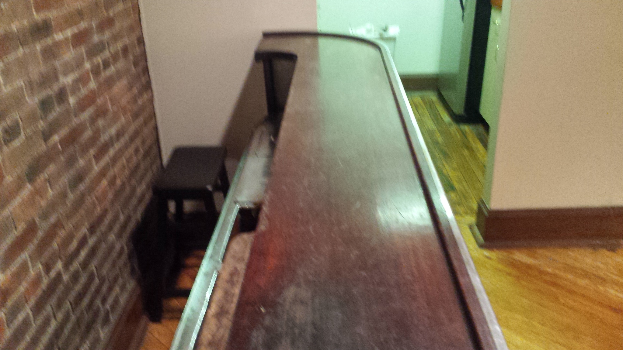 Antique bar 7 feet long. Brown leather front with red leather buttons. 1" thick wood bar top could be mahogany. bar contains 5 copper sinks/ ice bins each with a drain. Plumbing connects all drains underneath the center sink. Faucet is all brass.