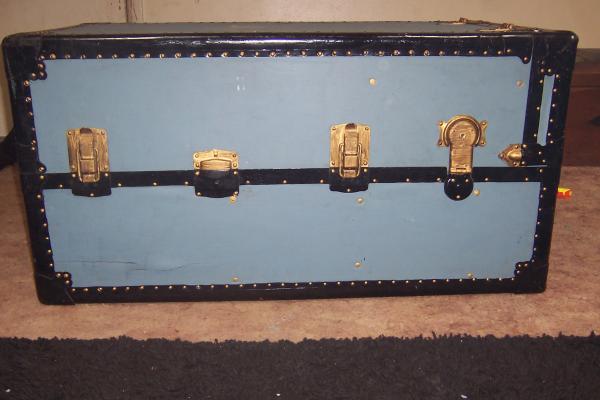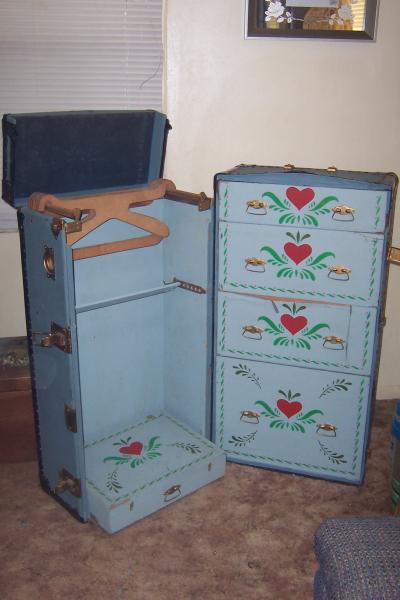 It is a old chest. opened upright it is a chester drawer and has wood hangers with a wood slat to hold clothing down during shipping.It has been painted before the railroad tag was put on, it has a little paint on the leather straps.