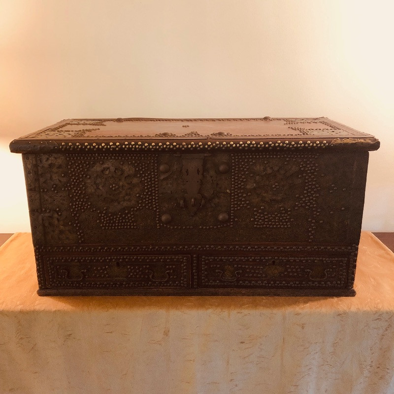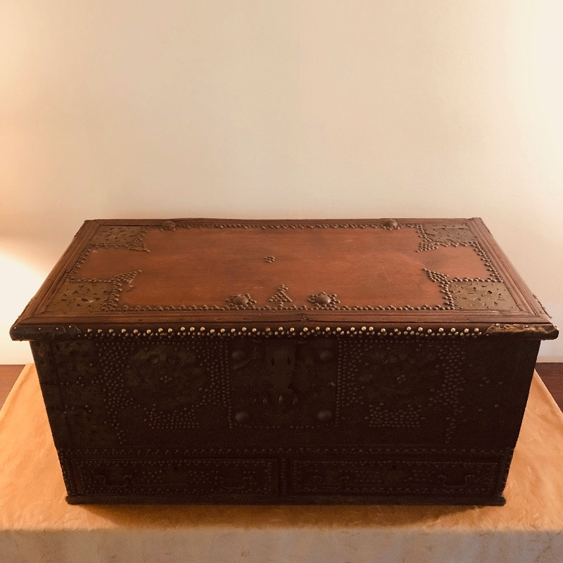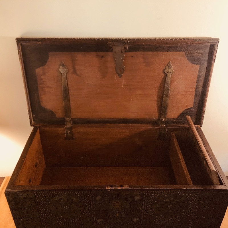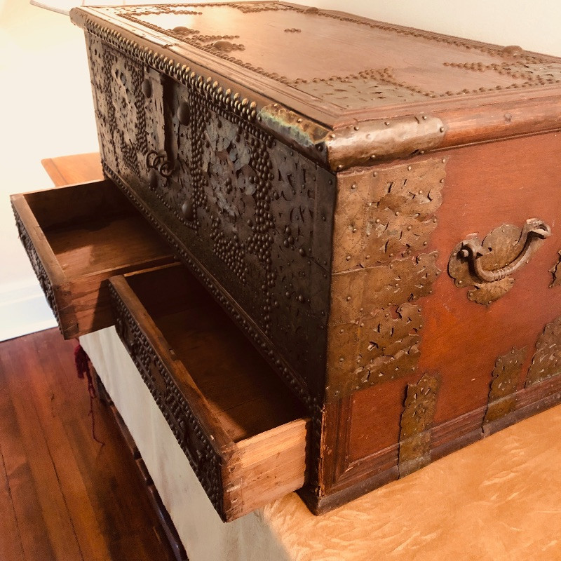 Antique Trunk. My guess is that it would have been a travel trunk. It has a nice compartment inside and two more outside, at the bottom. Outside from two small chips in the wood and a chip in the iron, it seems to be in great condition. I was tols it is Indian, but I am positive that it could be Moroccan. Size is 36 x 18 x 17.5”h. I saw a very similar one in the Kovel's book going for $1250, but I am still not sure about its real value.