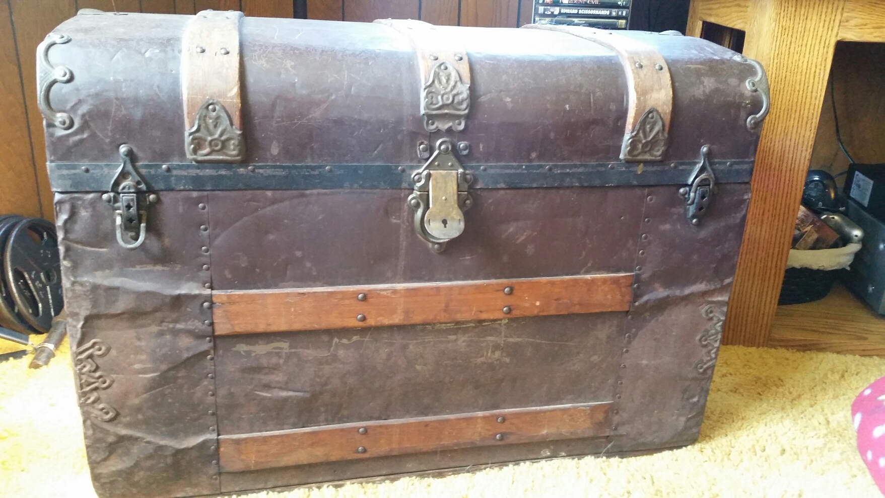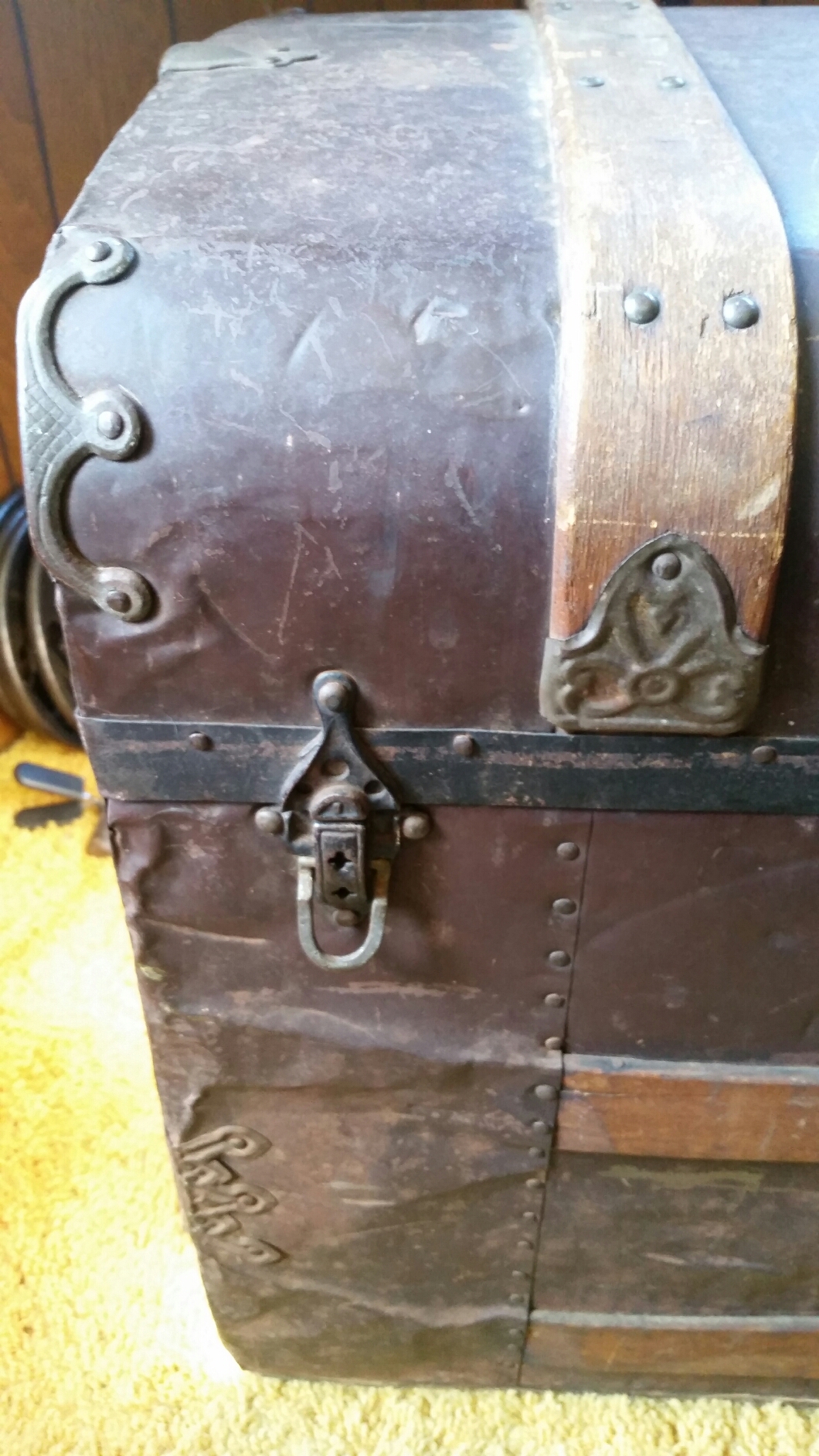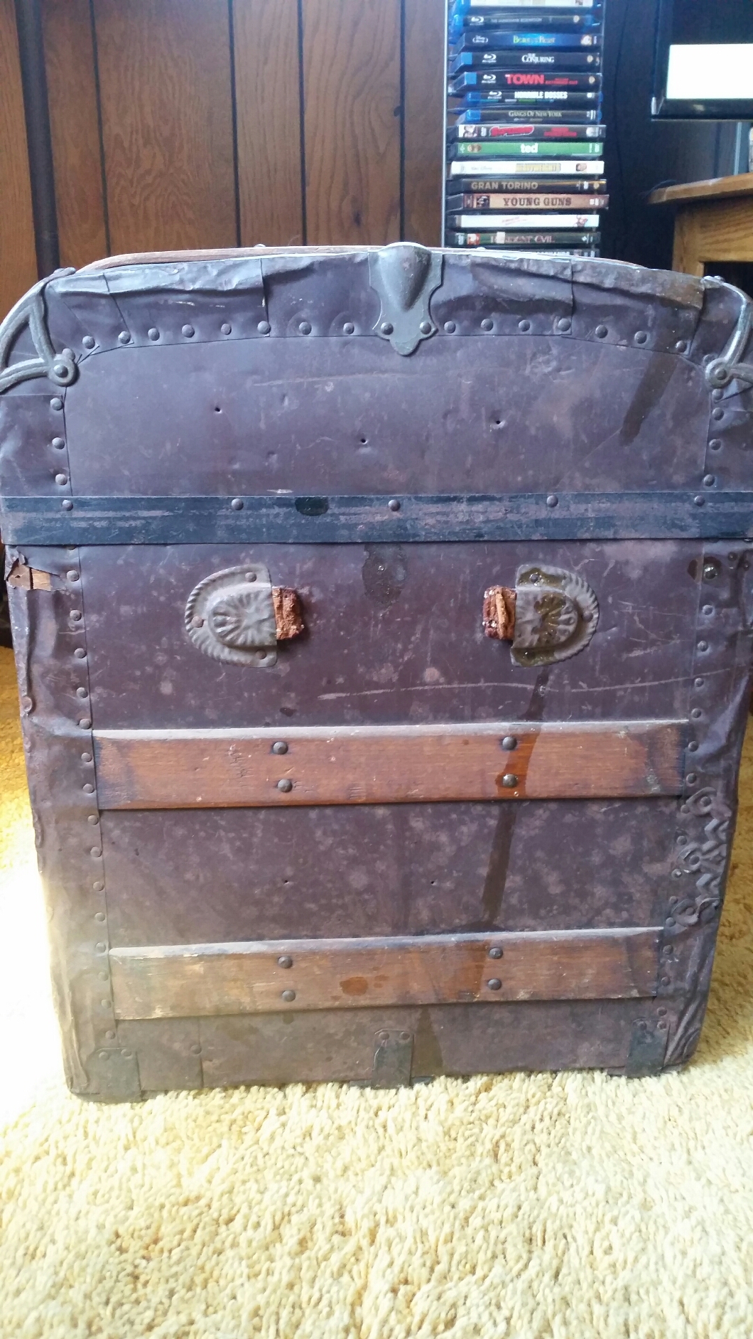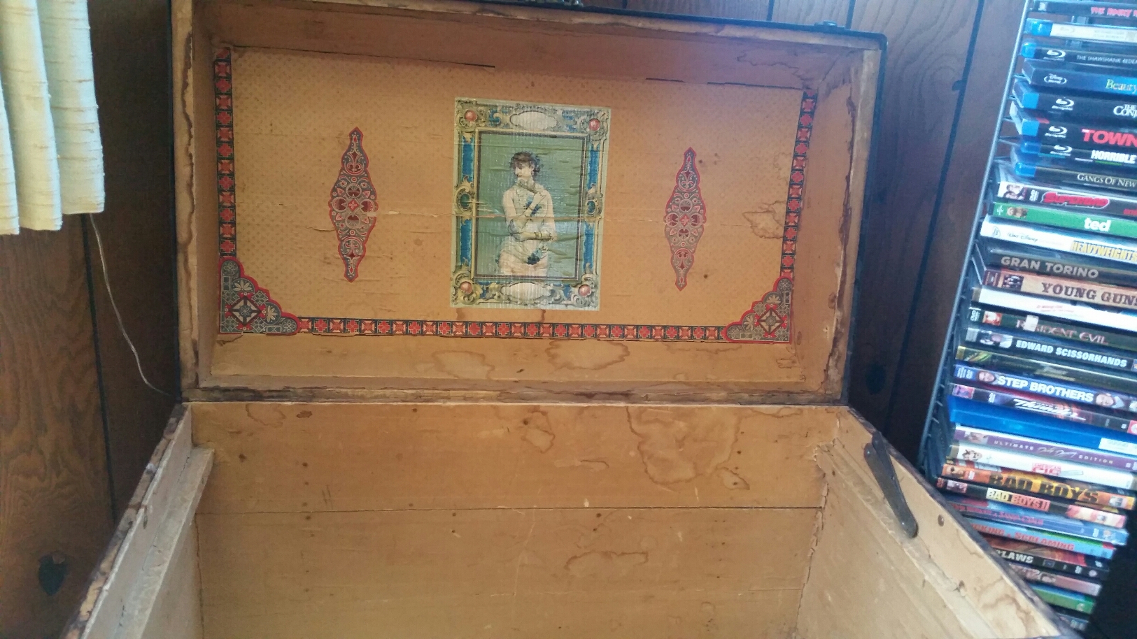 Antique trunk I found at a garage sale a few years ago. Beautiful metal detailing and curved wood. 2 working wheels in bottom and beautiful picture of woman and 2 designs in inside lid