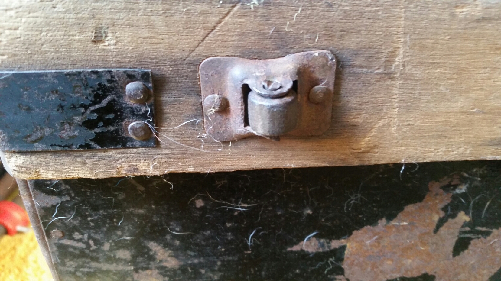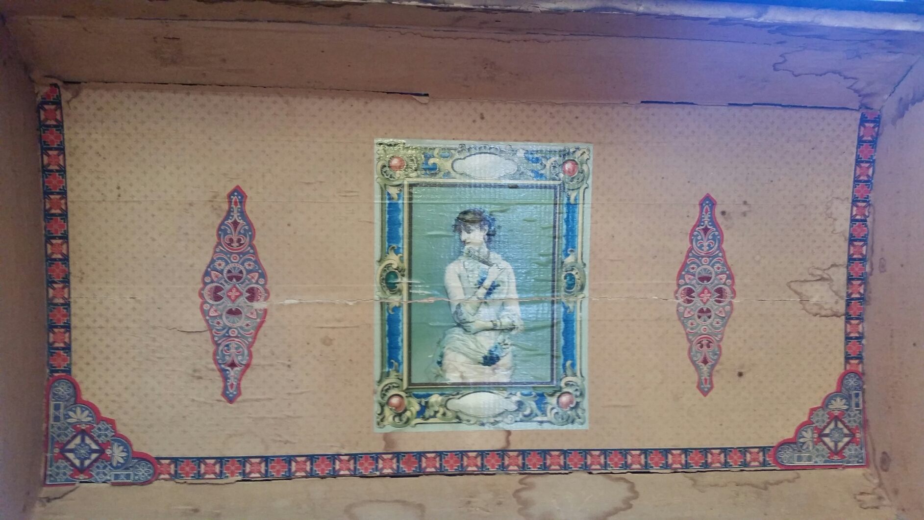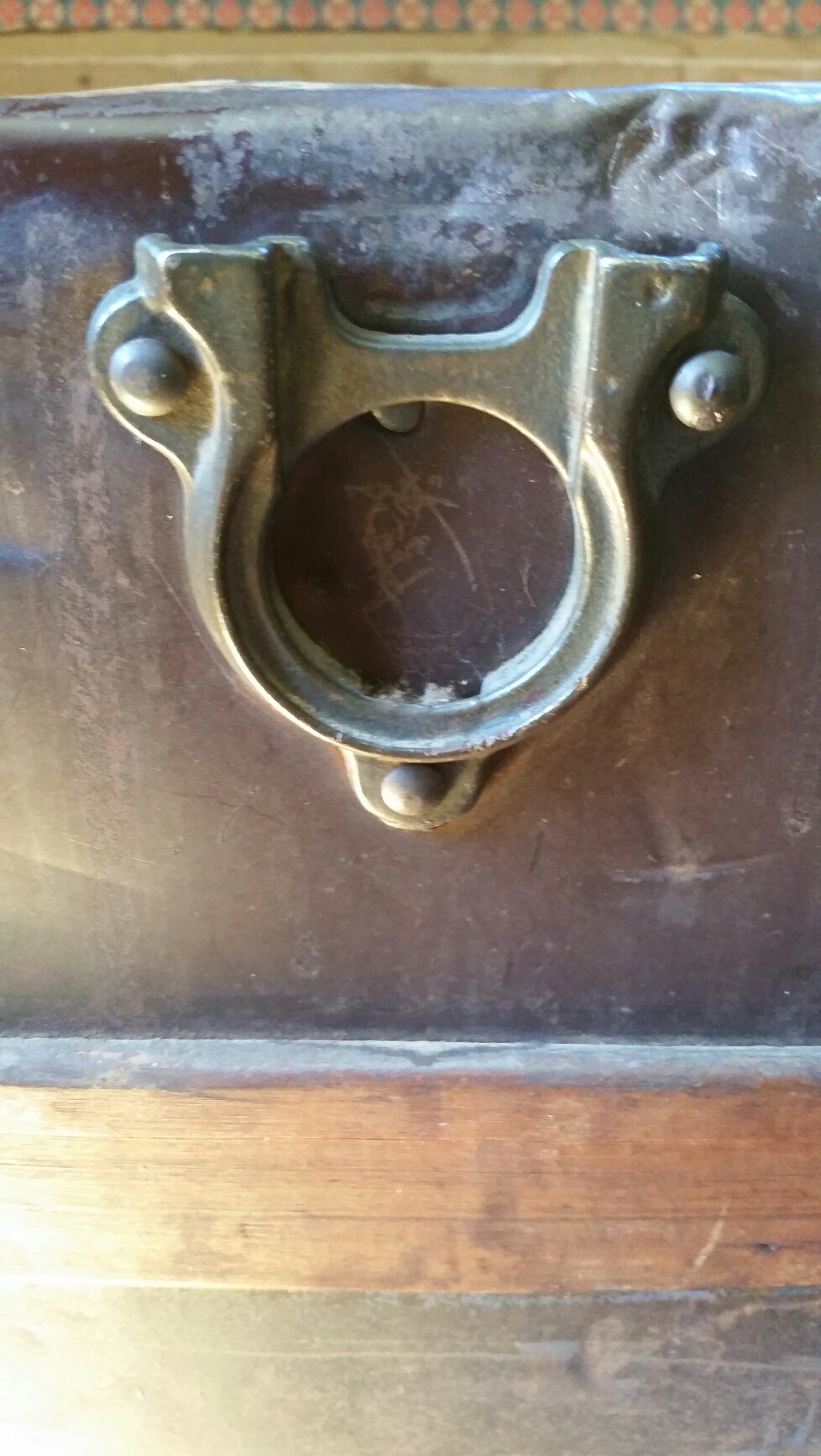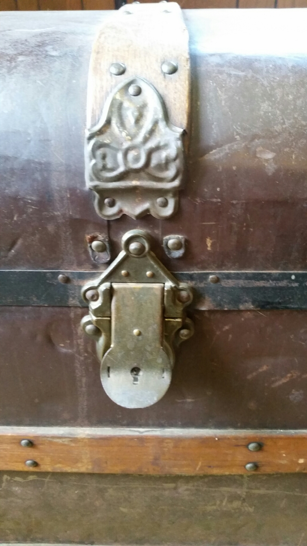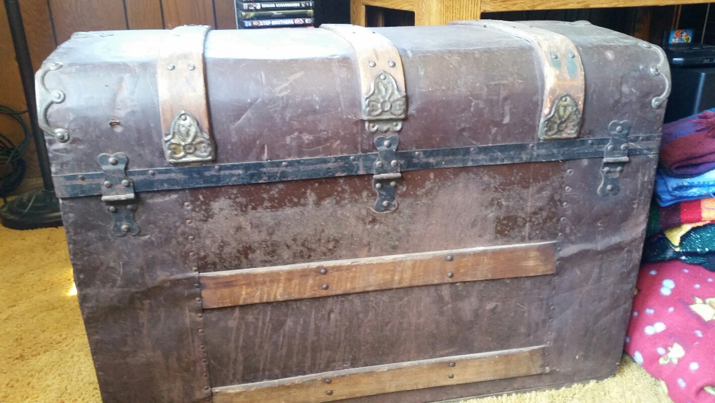 Antique trunk I found at a garage sale a few years ago. Beautiful metal detailing and curved wood. 2 working wheels in bottom and beautiful picture of woman and 2 designs in inside lid
