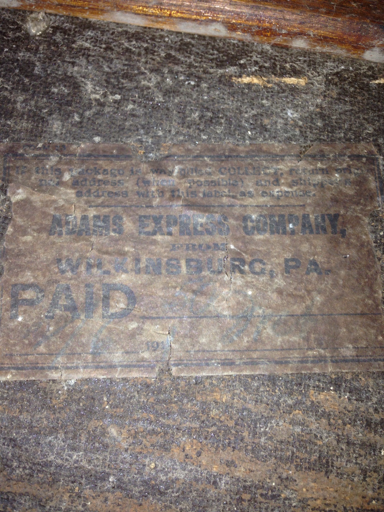terryville.conn.us with adams lock on it missing tray but in ok shape..leather straps have detriorated and metal or tin on bottom rusting has working wheels and interesting stamps from travel.. found in attic of new home one owner of house that was built over 65 yrs ago the other trunk is a round top this is square flat top