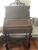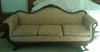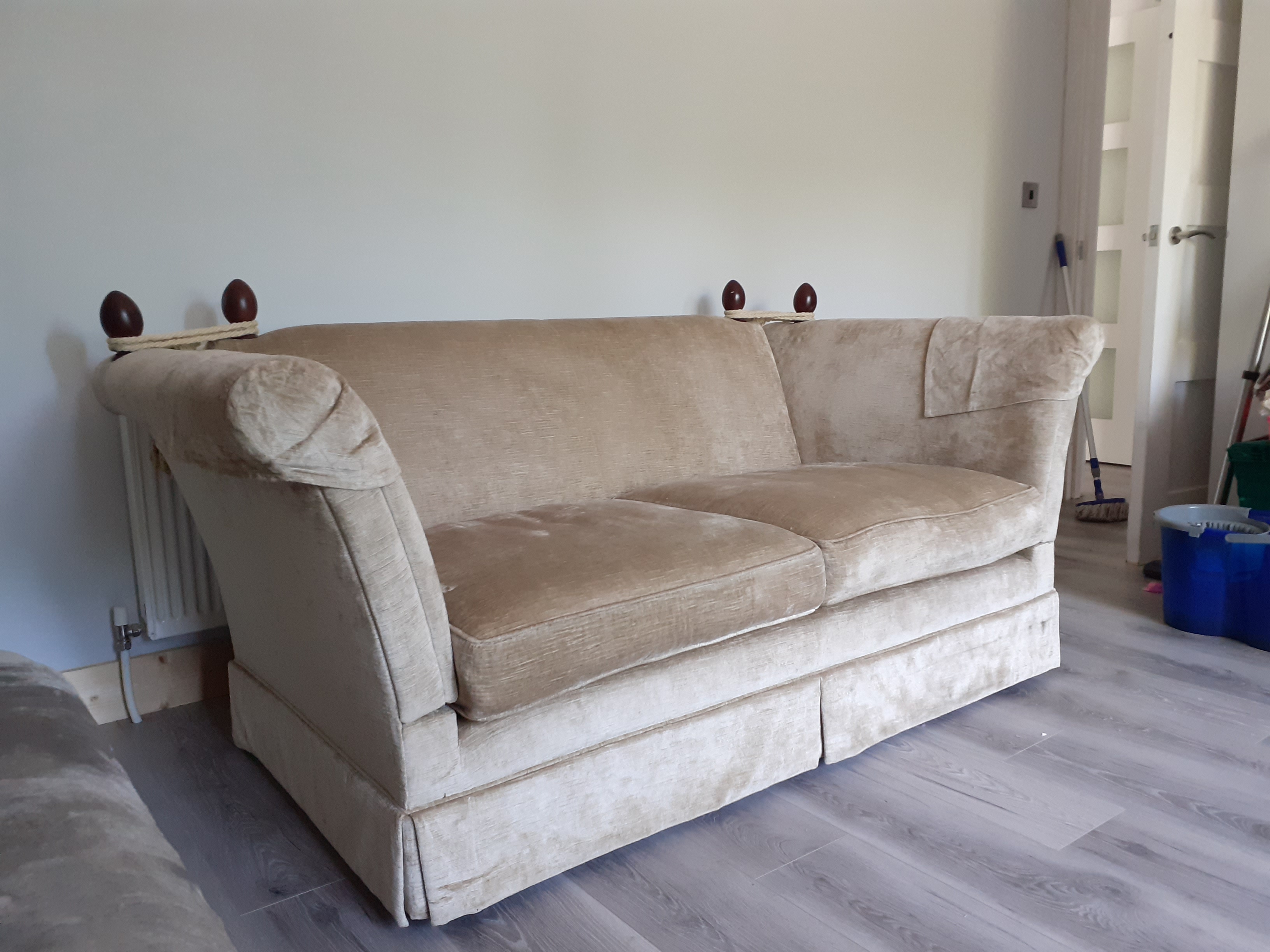 English Knole sofa. A large two-seat Knole settee with adjustable arms, deep seating, gold coloured fabric with skirting. The traditional Knole settee is raised up on castors with drop arms and heavy decorative braid tie backs with elaborate tassels and upholstered restraining pegs on the back and sides. The Knole sofa is an impressive piece of furniture, the high back and sides were probably designed to help keep out draughts.