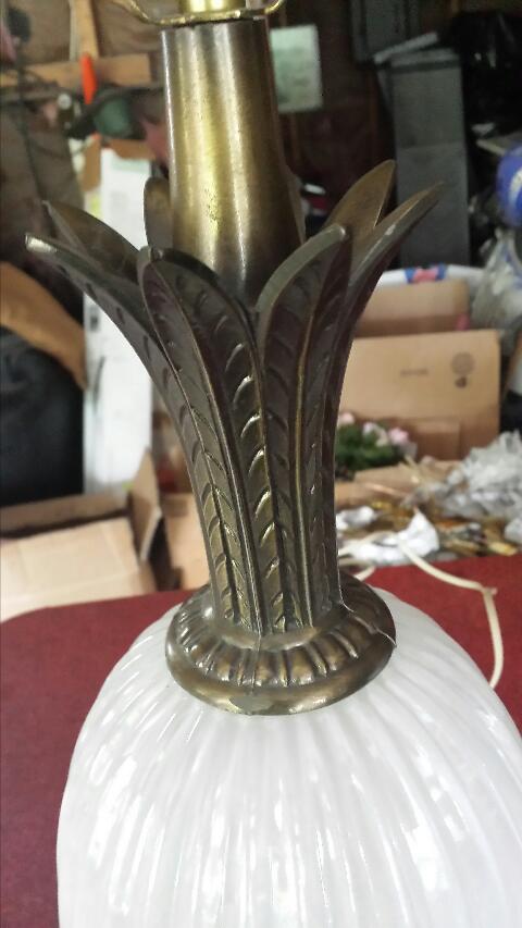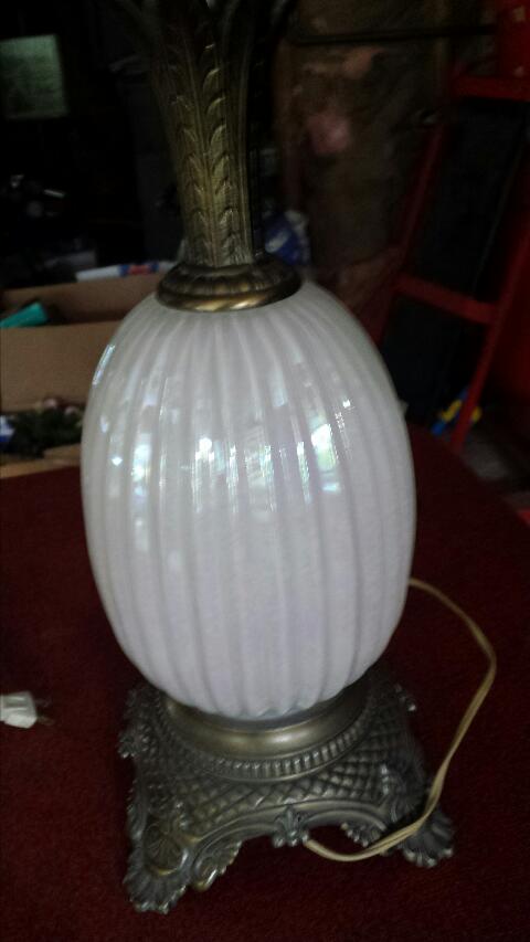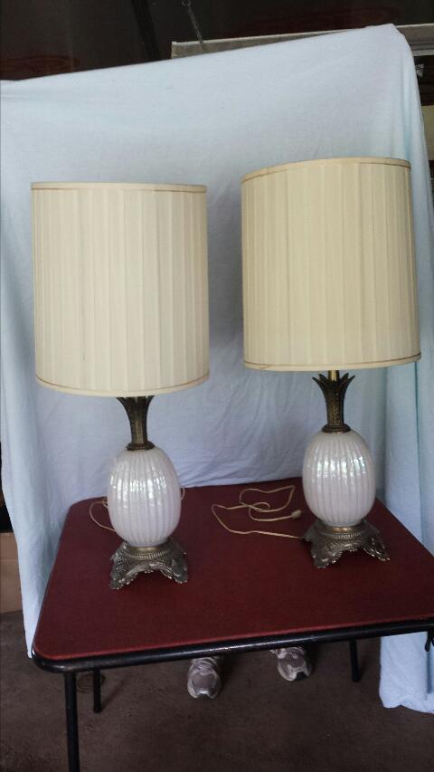 Trying to find out information on the set of Lamps.  What are they made of?  What Year are they from?  What is the current Value?   I recieved them from a friend that did not know much about them.  They look like brass but not really sure what that part of lamp is made of.  There is a glass part and there is two light parts.  It lights in the glass part with a small bulb  and the on top with a reg 60 watt bulb.  I am hoping that some one could give me some information  on the lamp set.