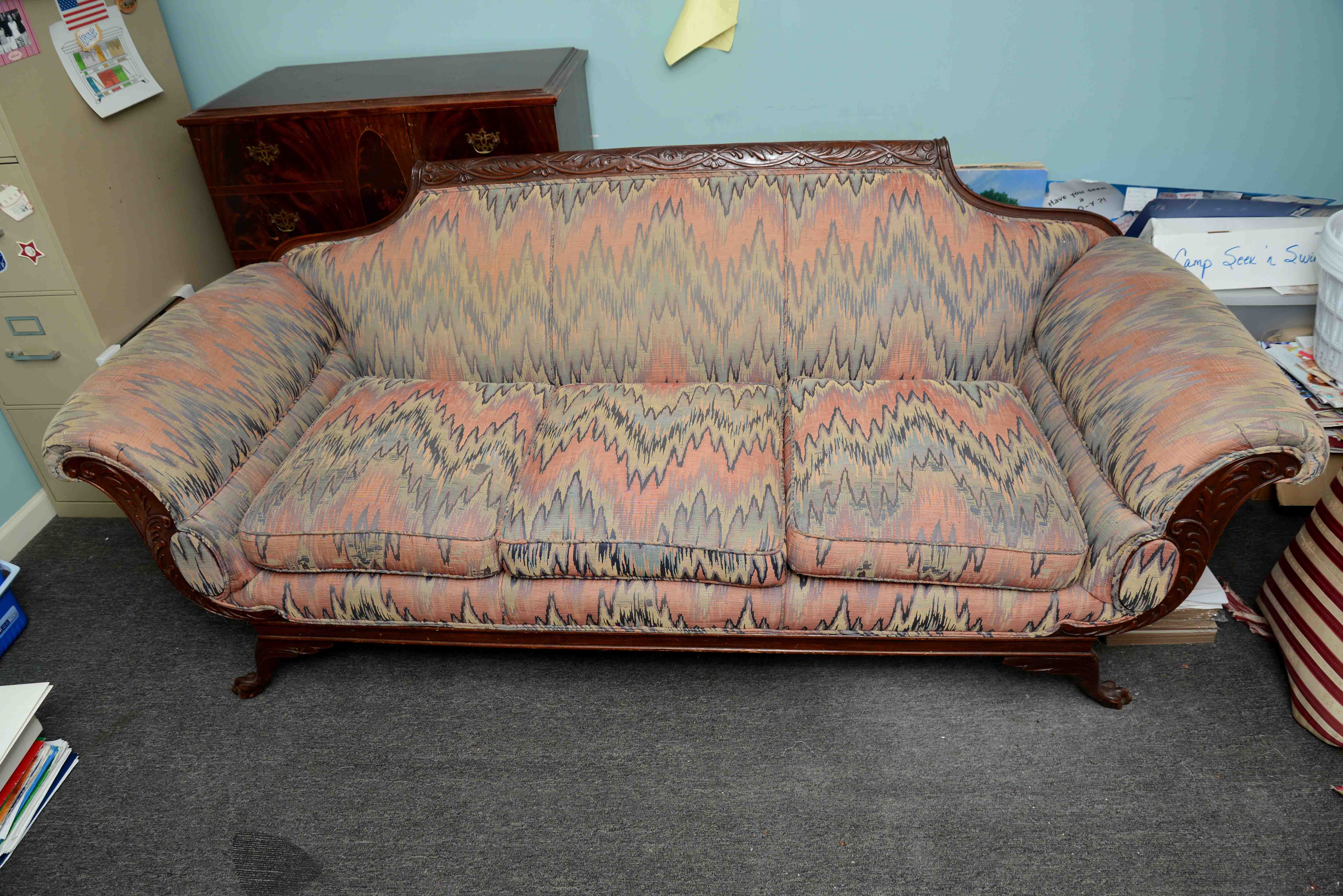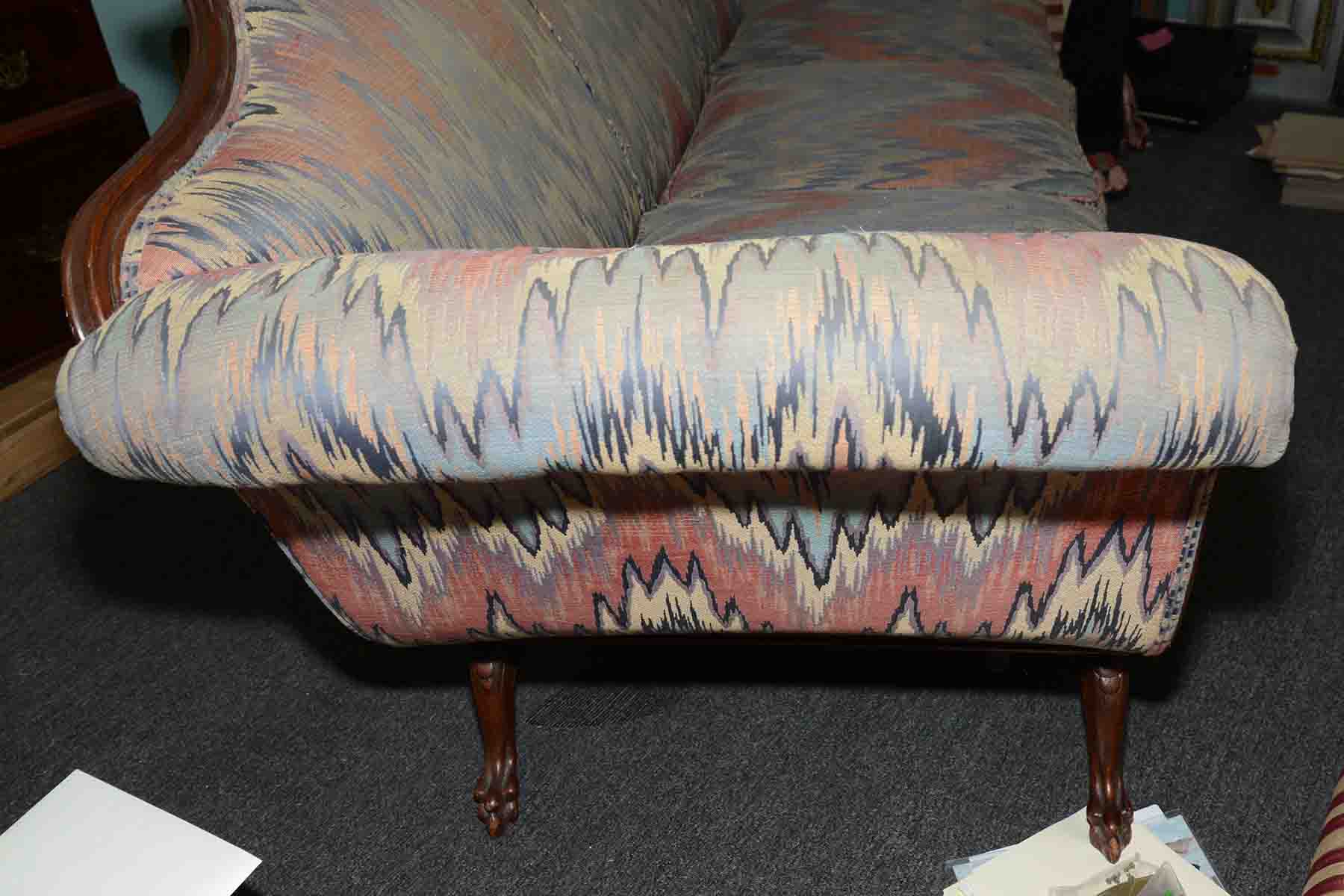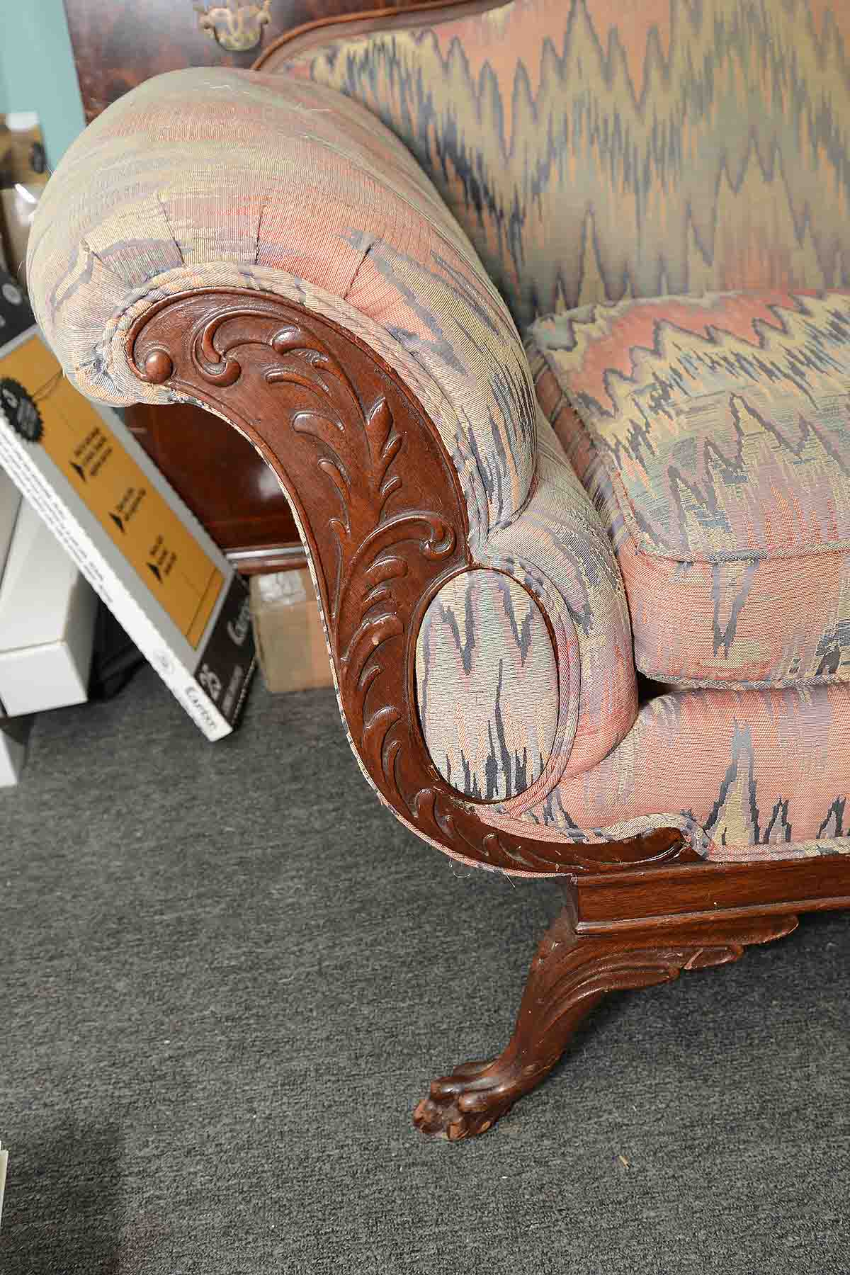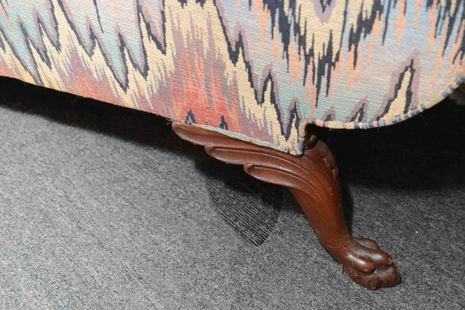 Antique walnut claw foot sofa. Three horse hair seat cushions. Fully upholstered - back, arms and front. Believed to be around 1900.