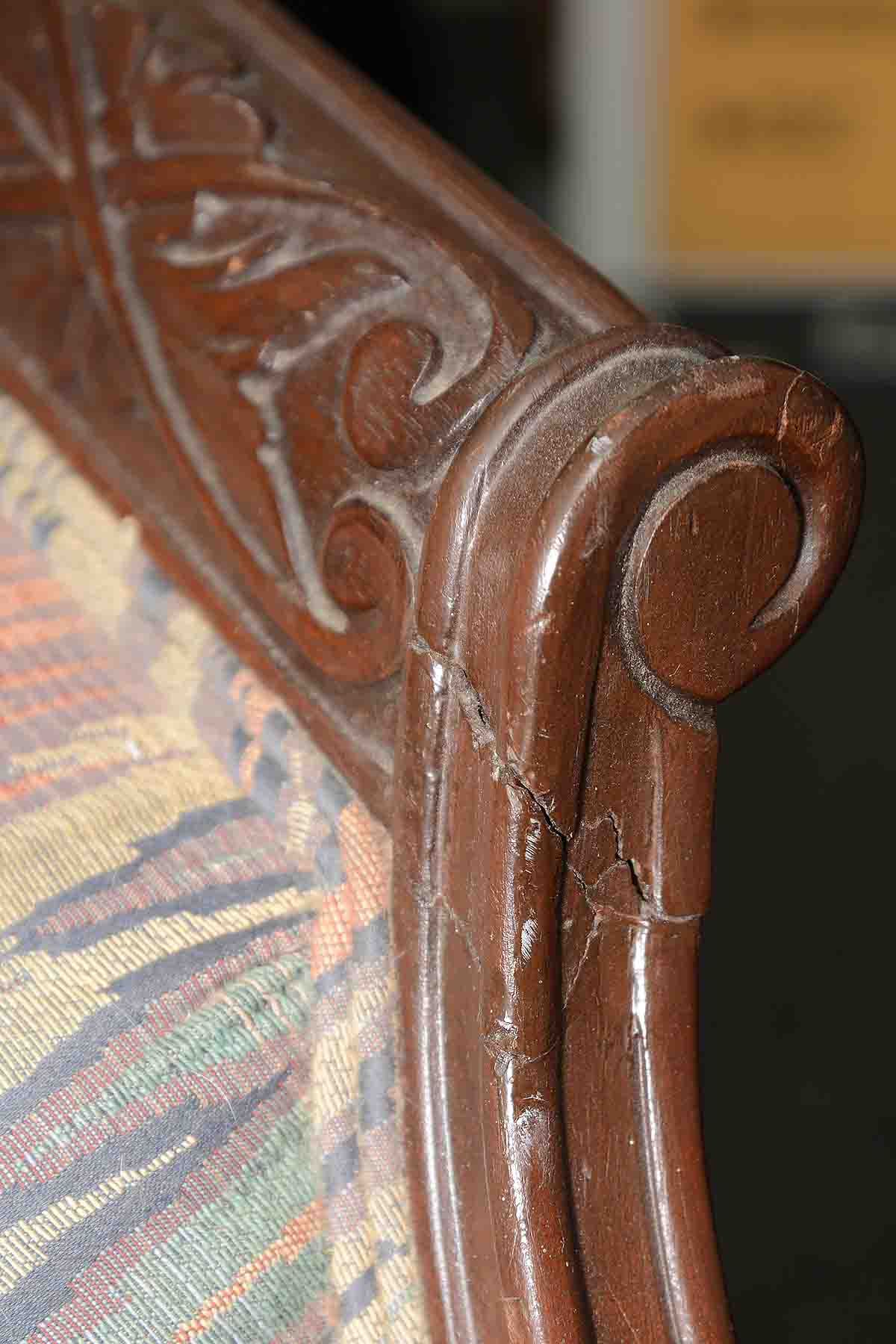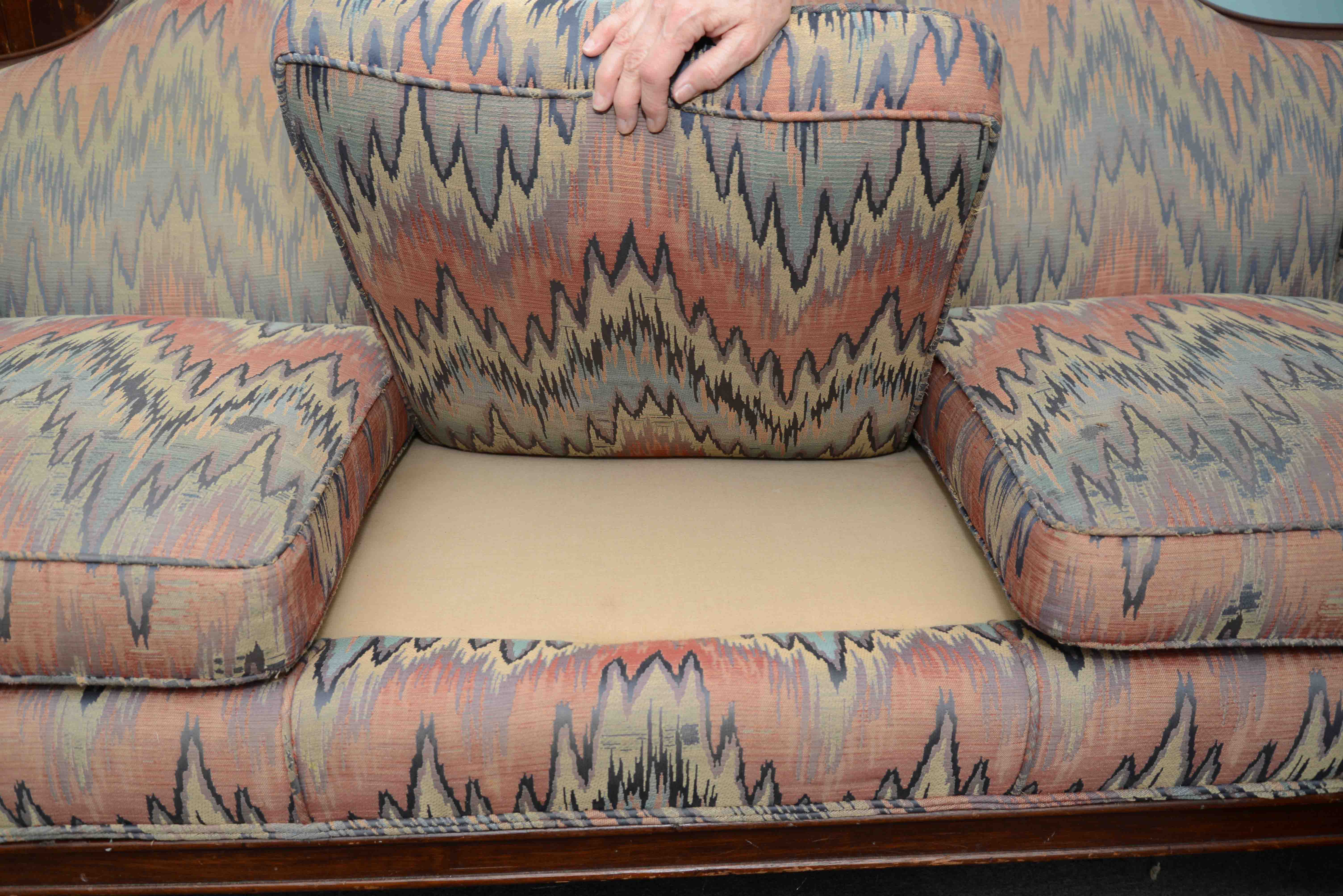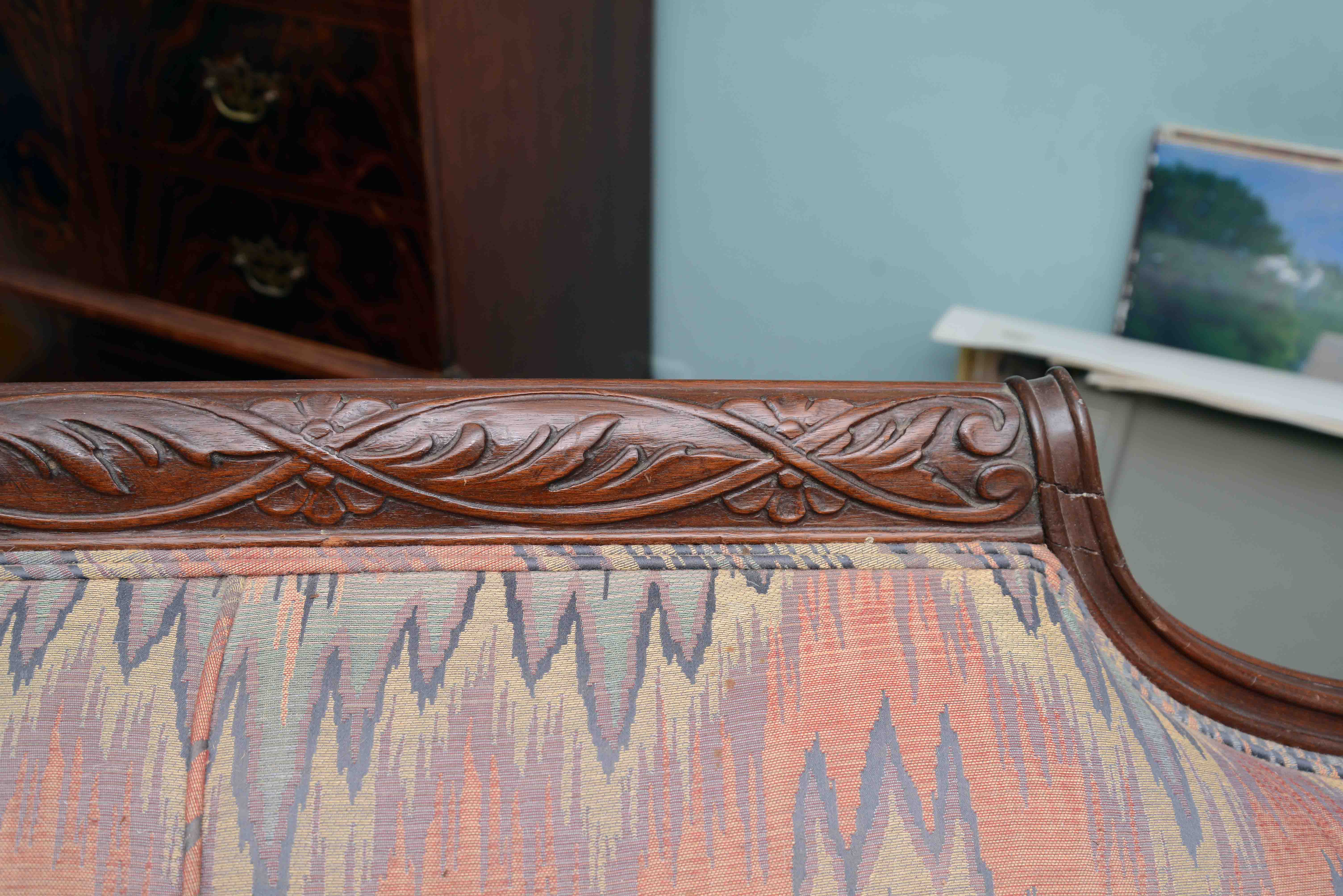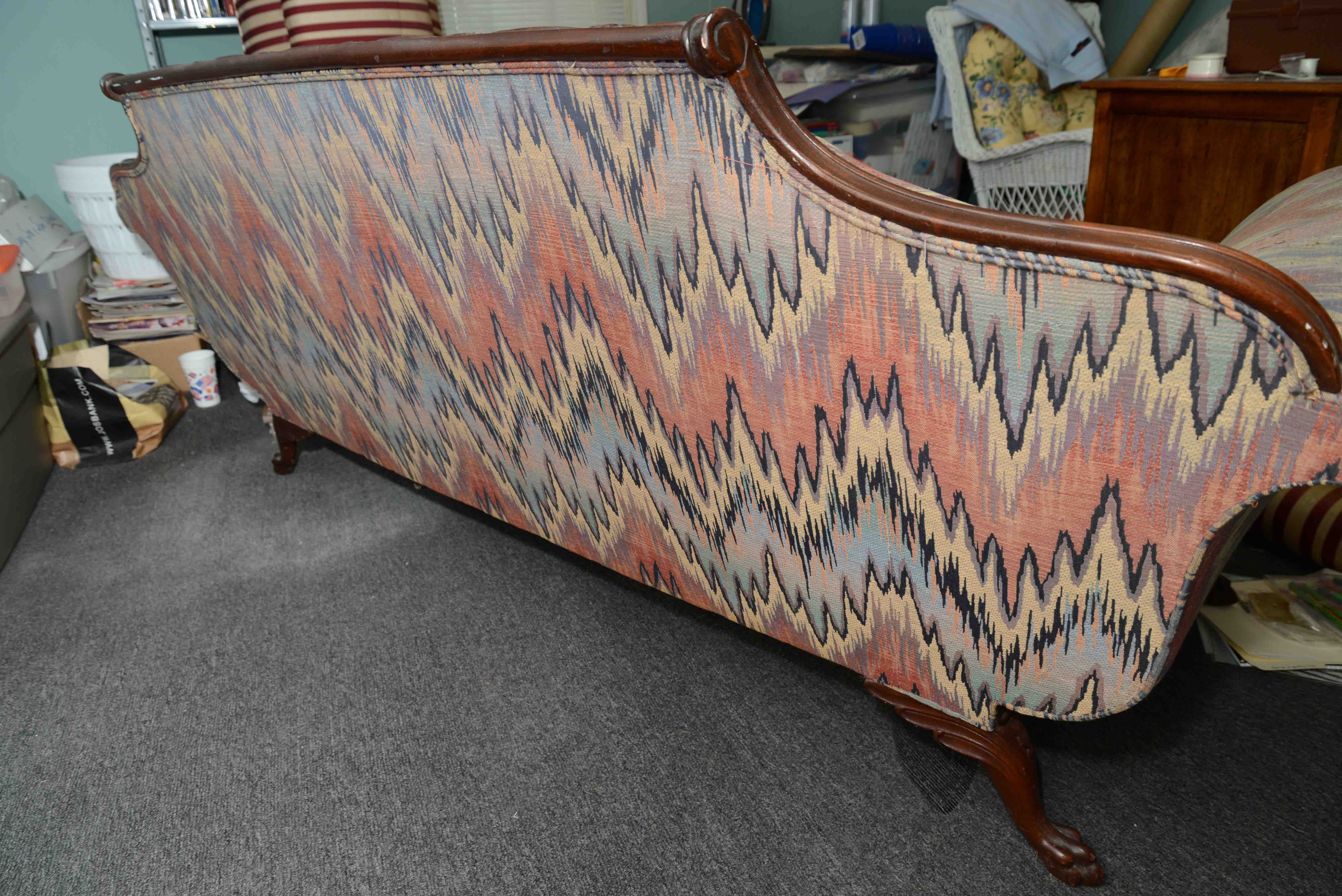 Antique walnut claw foot sofa. Three horse hair seat cushions. Fully upholstered - back, arms and front. Believed to be around 1900.