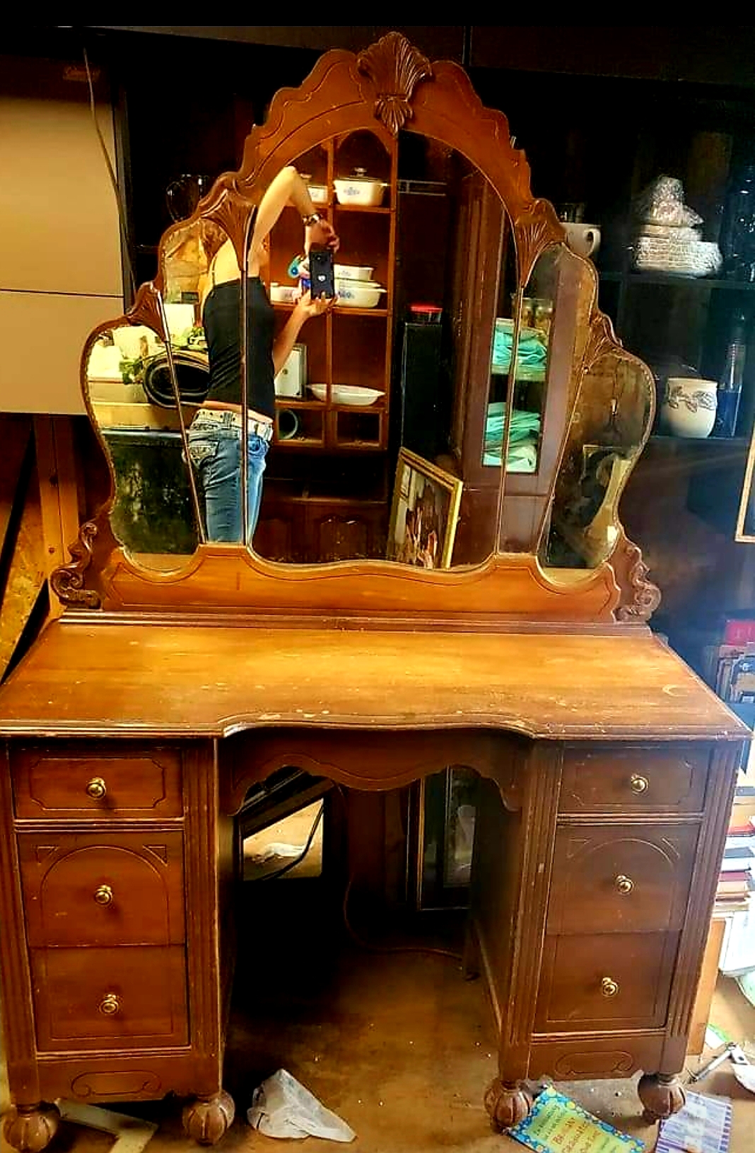 Beautiful antique vanity. It has a 5 piece mirror with unique etching on the edges and wooden rollers. That's all I really know about this piece.