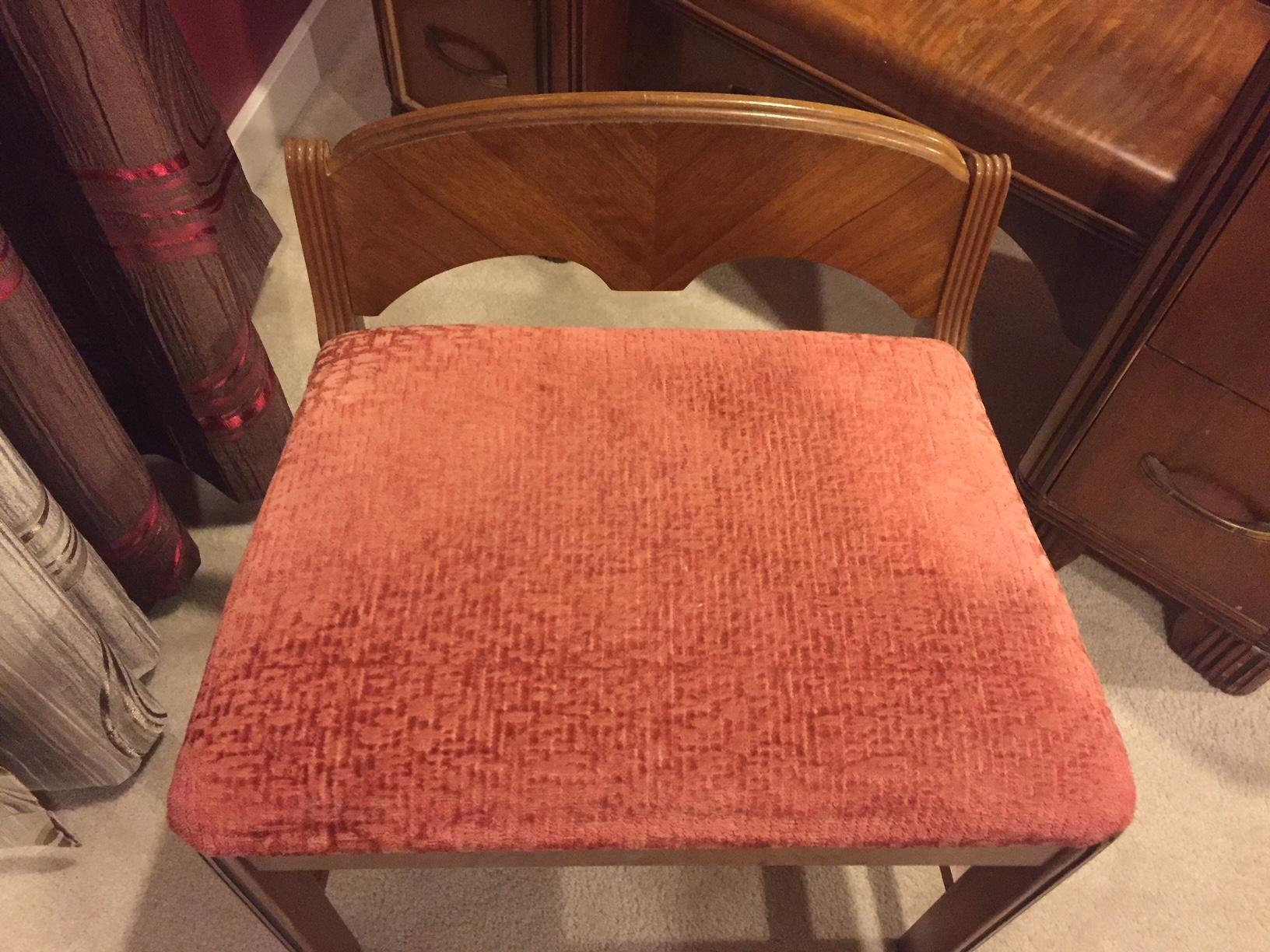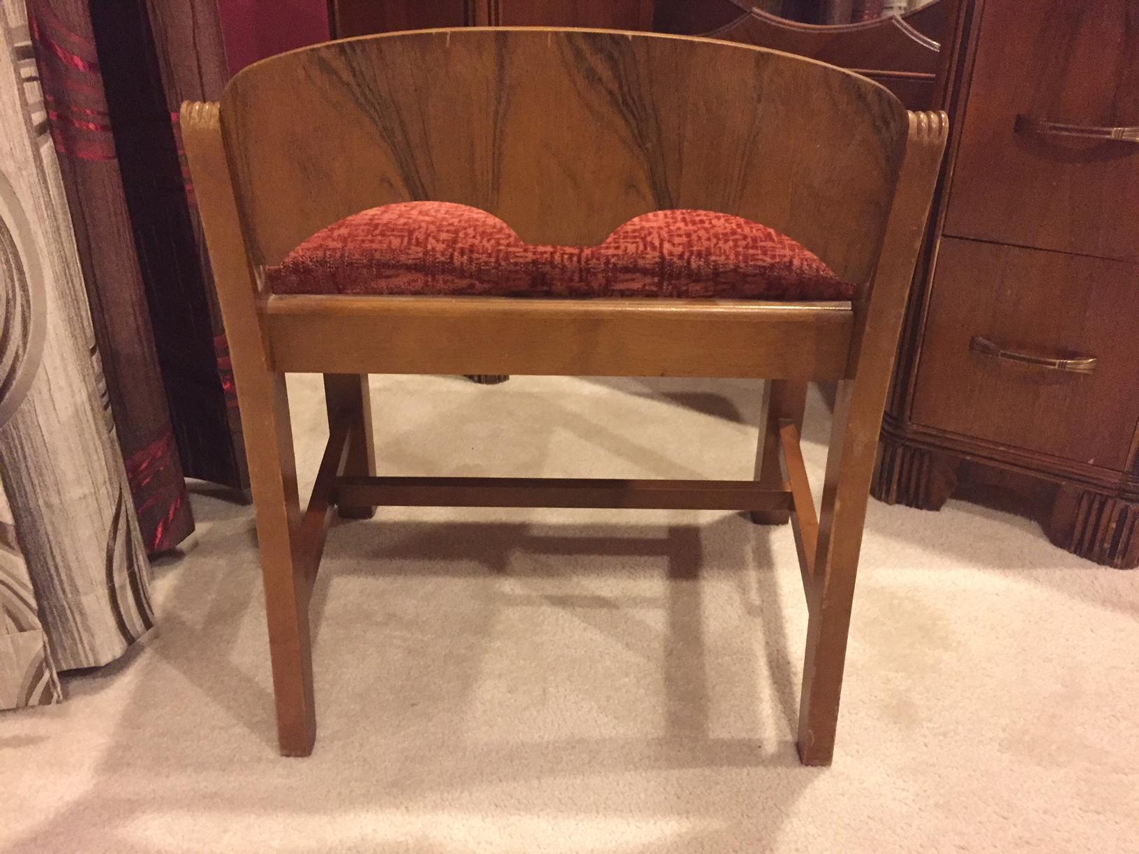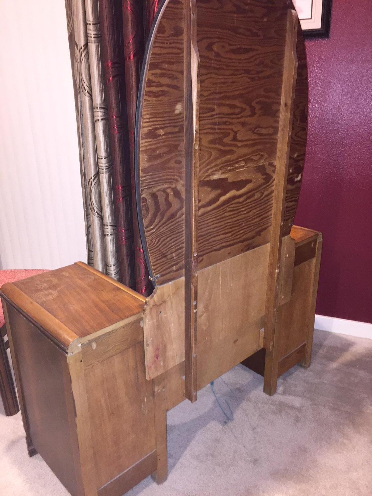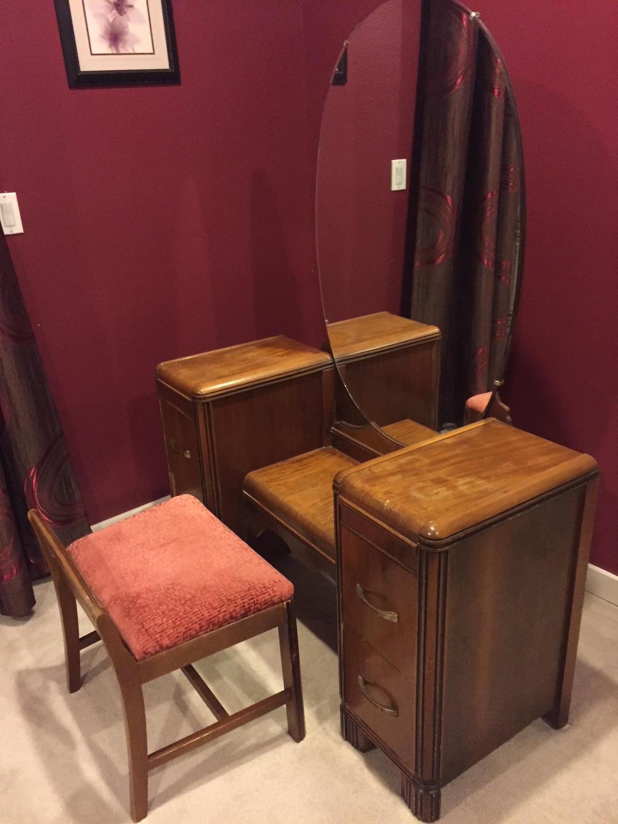 Your vanity is an Art Deco styled piece from the 1930's, these were made in huge numbers prior to World War Two (1939) . Values for them tend to ber modest, especially if they have any sort of veneer damage. Most comparable sell for under $100.00 at auction. some will have labels and markings to identify a maker, but most do not.