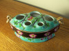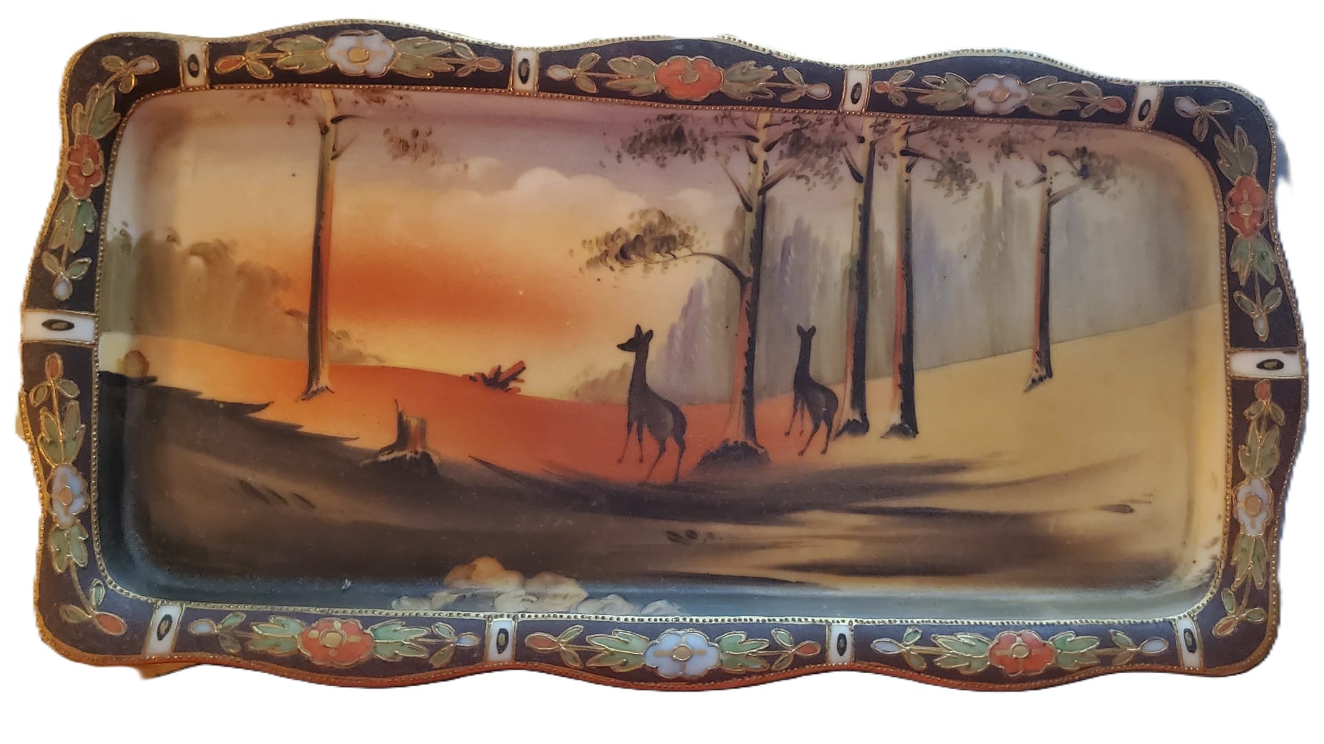 Description vintage vanity tray (?) 6"x12" unglazed, appears hand painted. Painting shows a forest,sunset & deer. It has a makers mark on the back with green wreath, two red letters in the center - one is a T. Some faded red writing above and below the wreath.