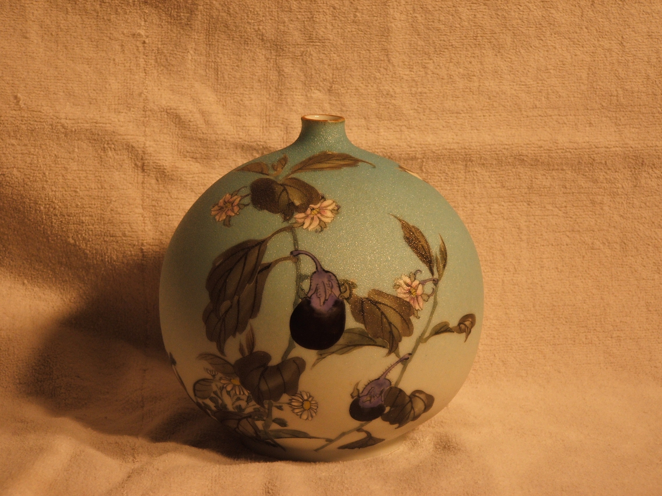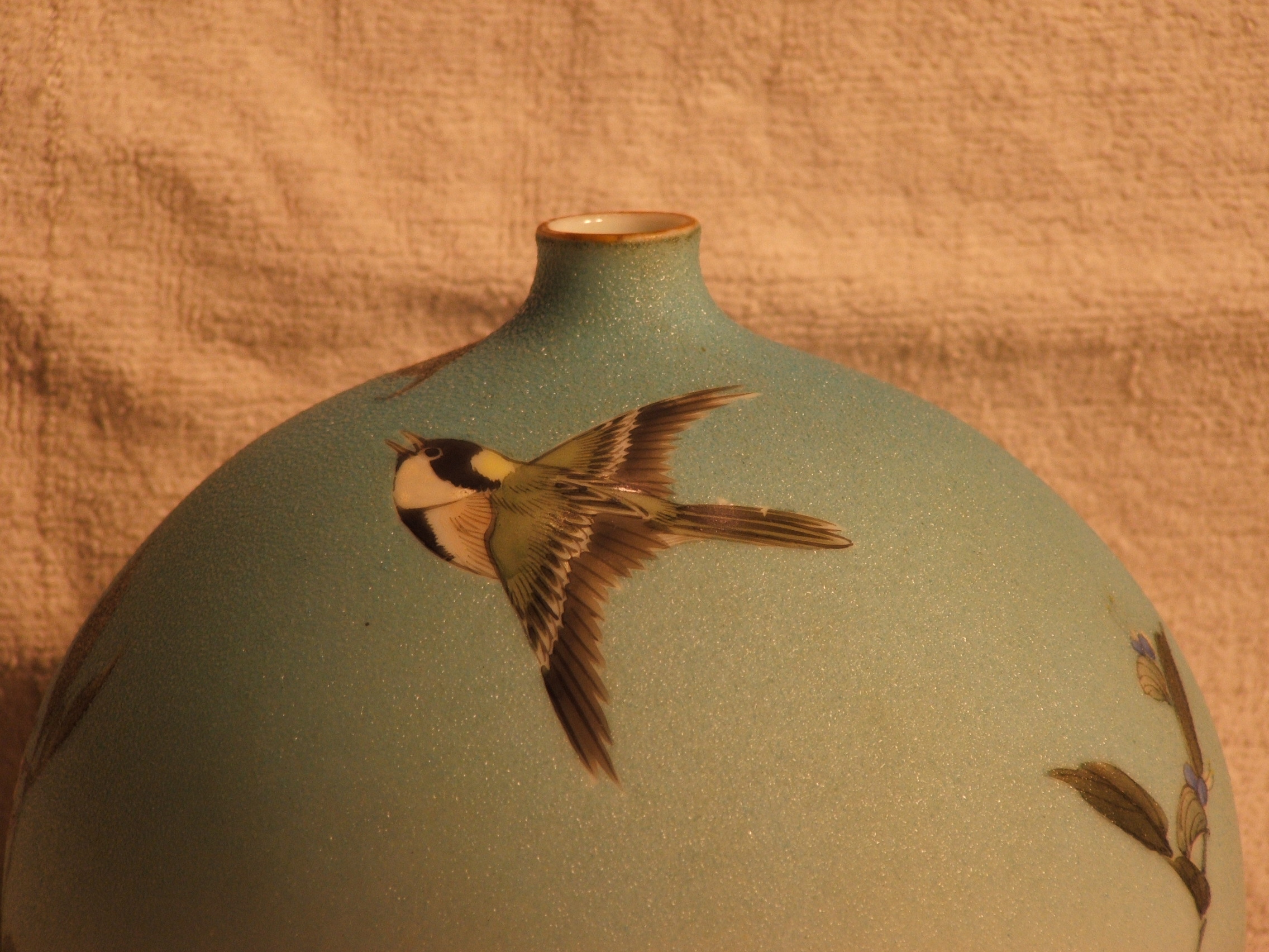 This vase is from my great grandmother I do not know how or where she got it. any information would be helpful ,I have never seen another one like this. It has an almost bumpy texture ,it's blue and white with birds and eggplants on it.