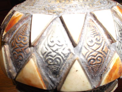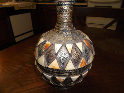 This is a vase that may have been made in Asia. It is copper with ivory triangles. At first glance, it looks like an Urn from India