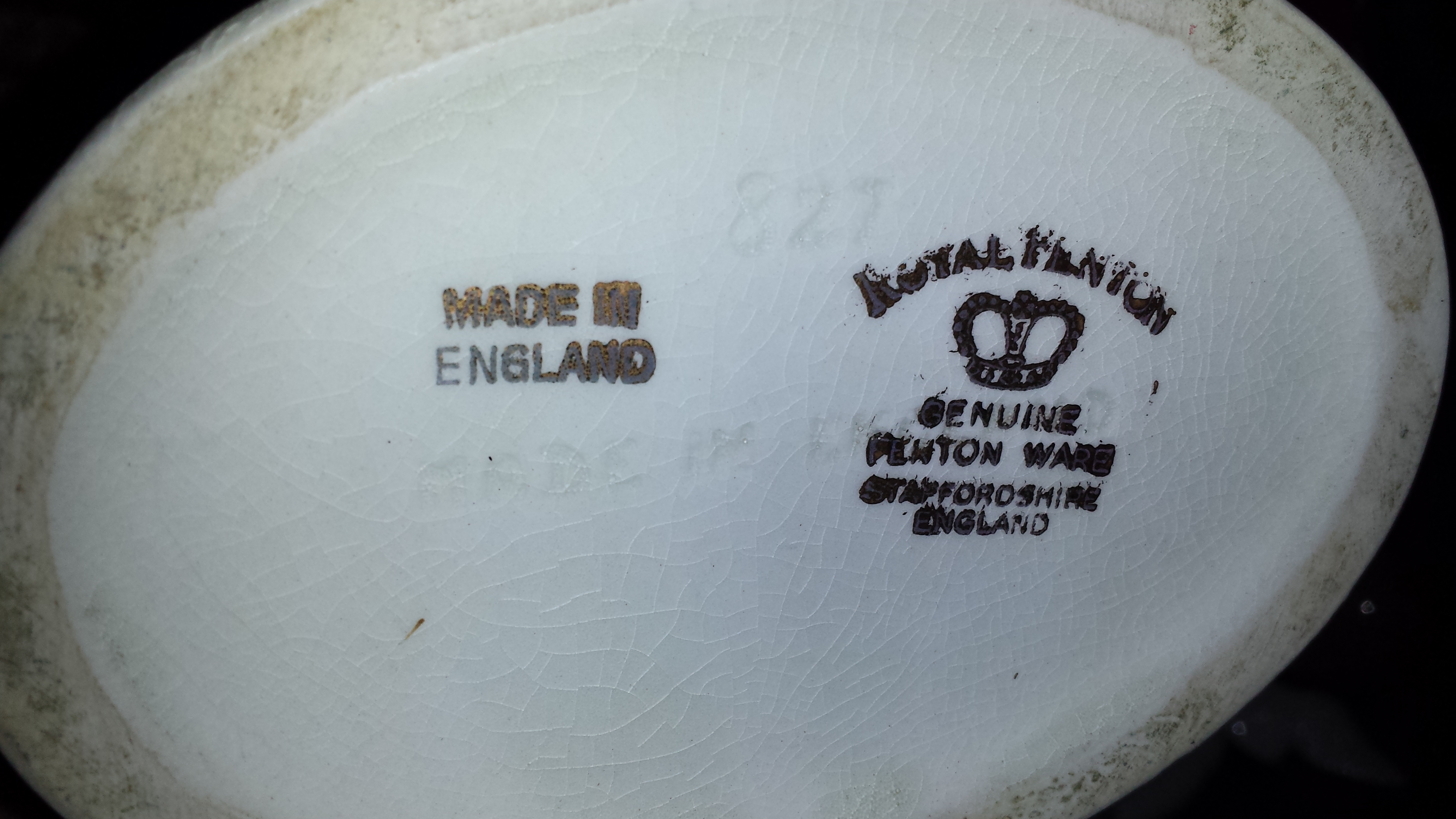 Can you please tell me what this worth . On the bottom it has royal Fenton genuine Fenton ware Staffordshire England and the number 827 on bottom it is in excellent condition can someone please help me with the value of this item thanks Ron