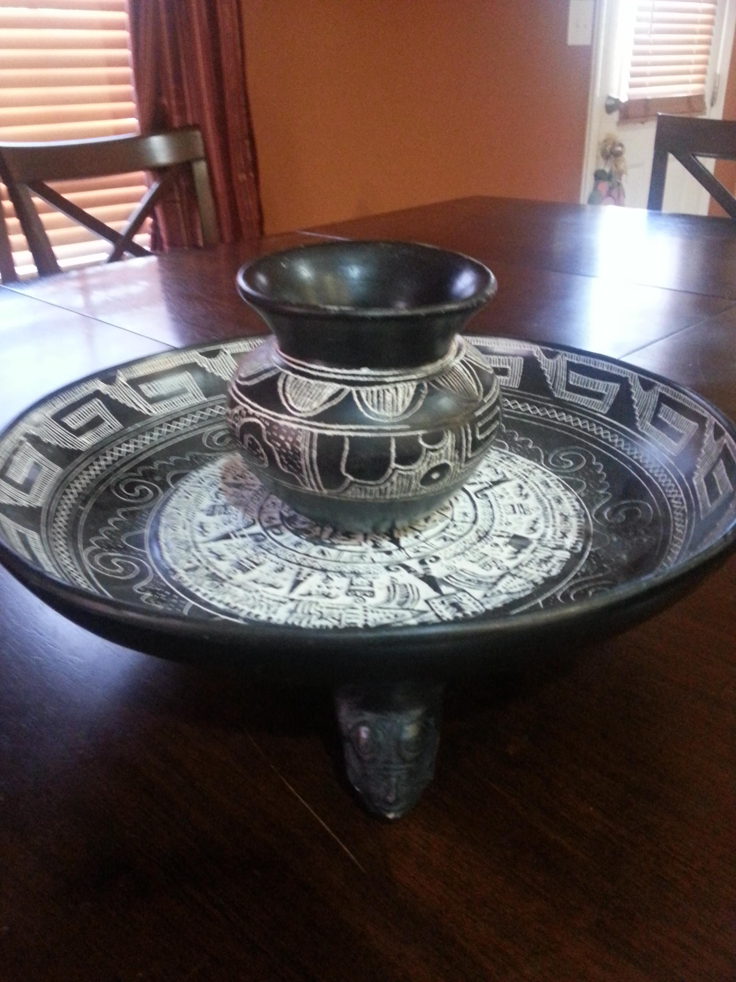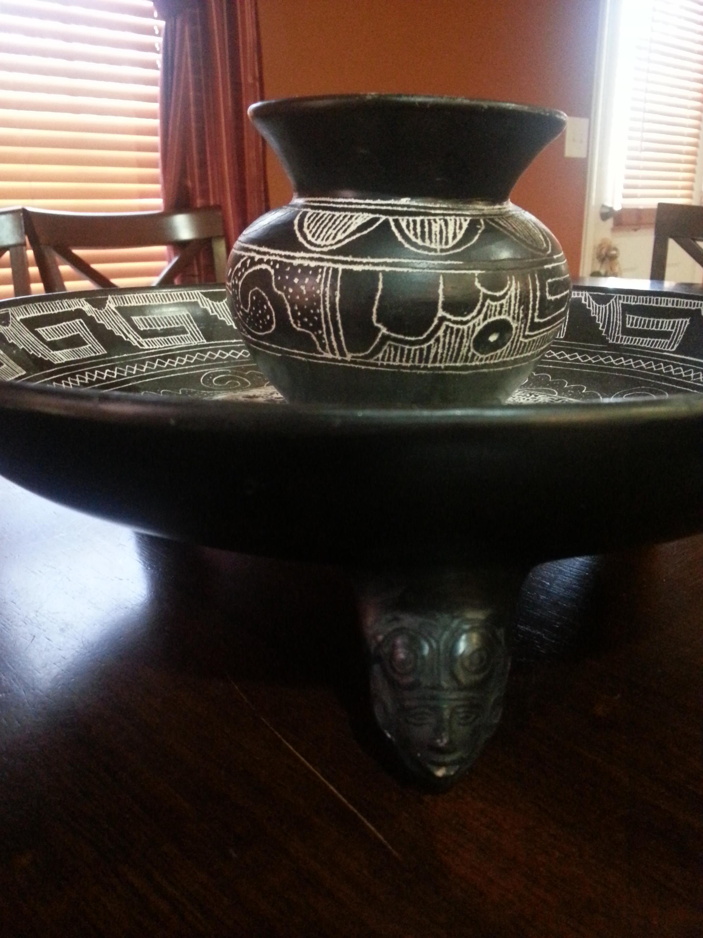 Two piece vase and bowl set. Possibly from Africa. It stands approximately 8-10 inches tall.