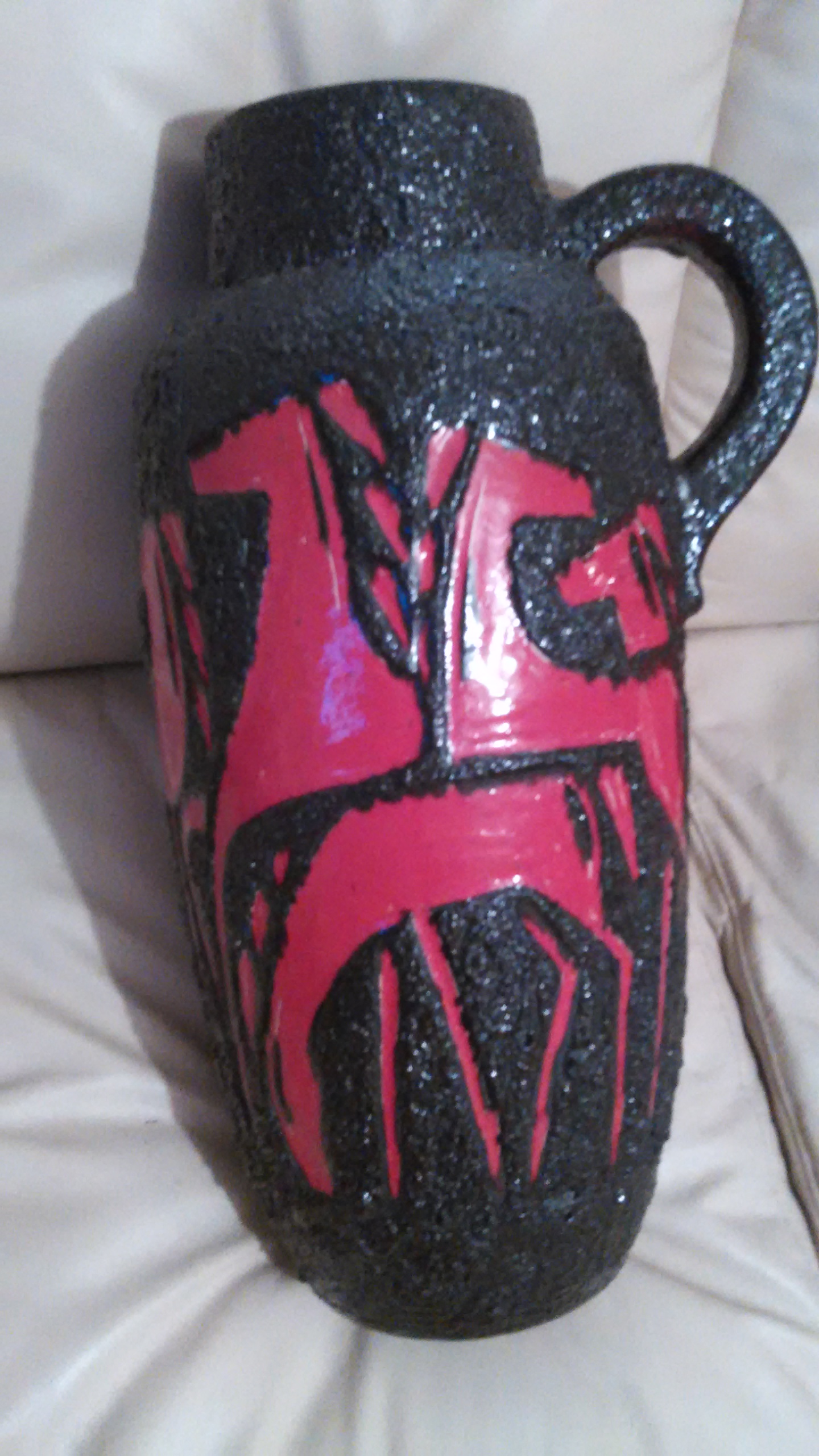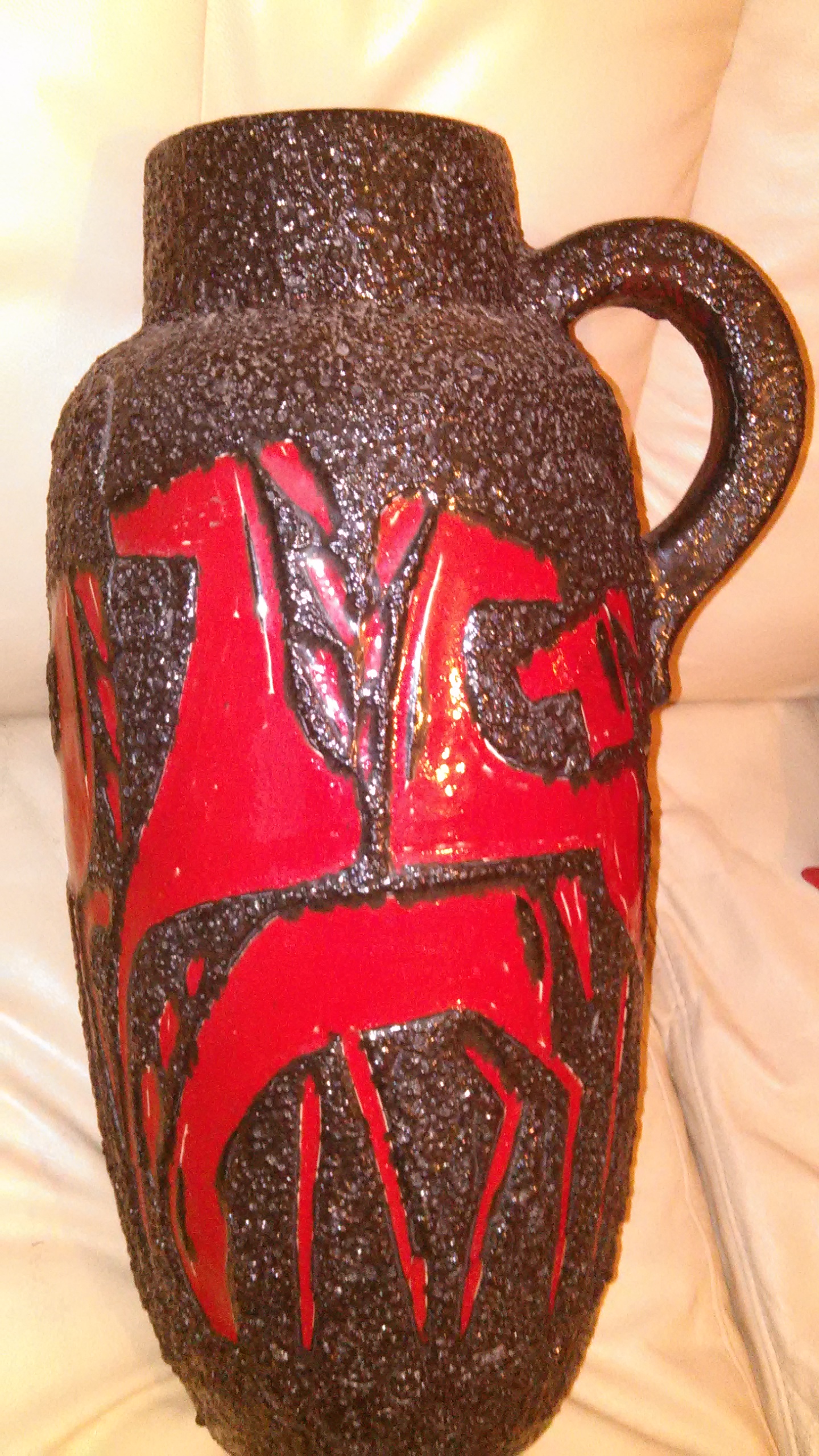 Description I bought this large vase wit a handle. Is dark brown and it has red gacels cut ins . it has the # 420-54 on the bottom. I will like to know what it is and who made it.