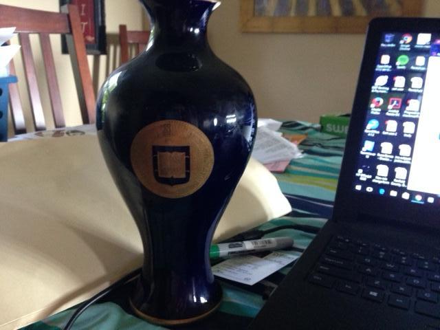 Dark blue vase with gold inlay.    SIGILL:COLL:YALEN:NOV:PORT:NOV::ANGI: IS IN A GOLD CIRCLE ON THE VASE...Inside in gold is ET on top : Veritas on right side:lux on left side inside circle.