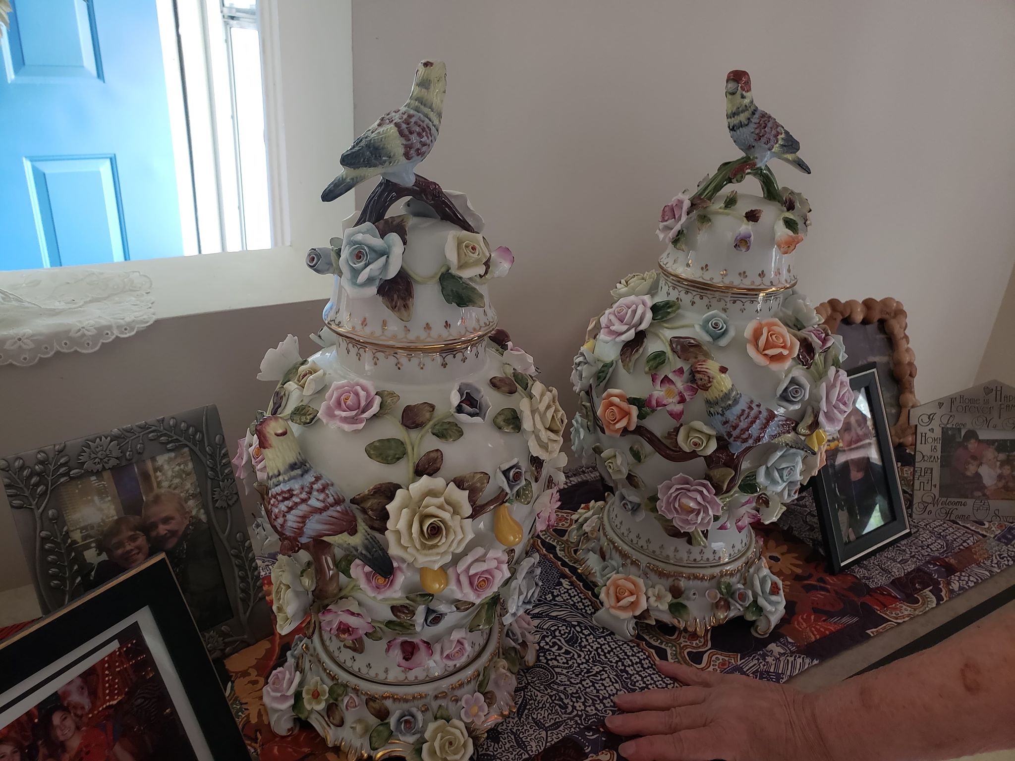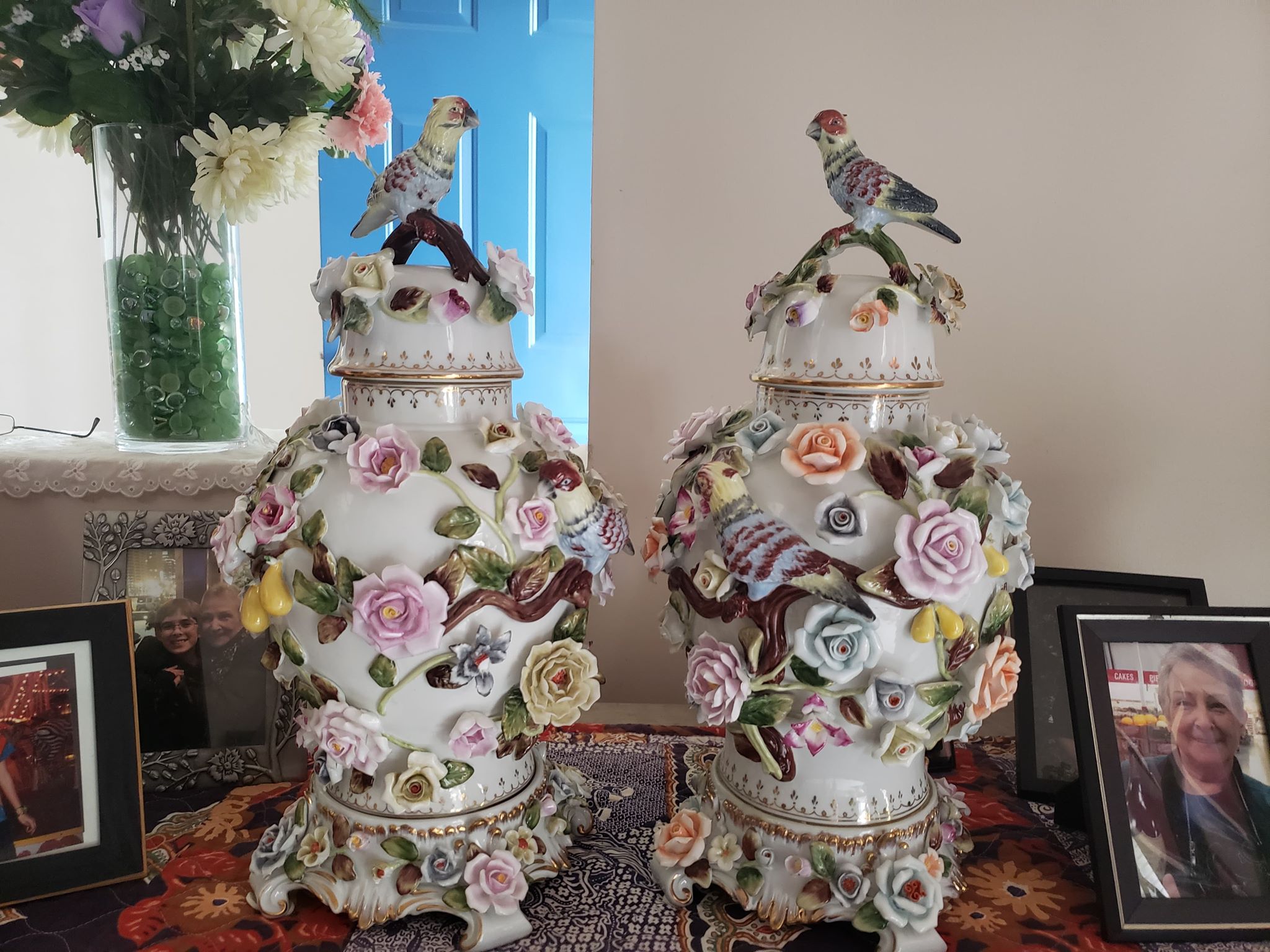 There are two of these vases in perfect condition. They are about a foot tall and are very heavy. There is an S stamped at the bottom of both (see in pictures).