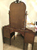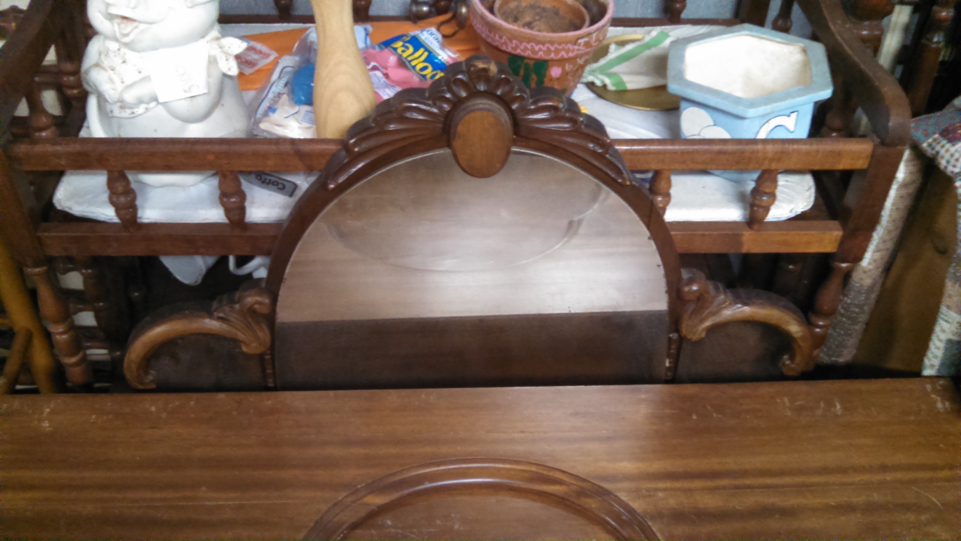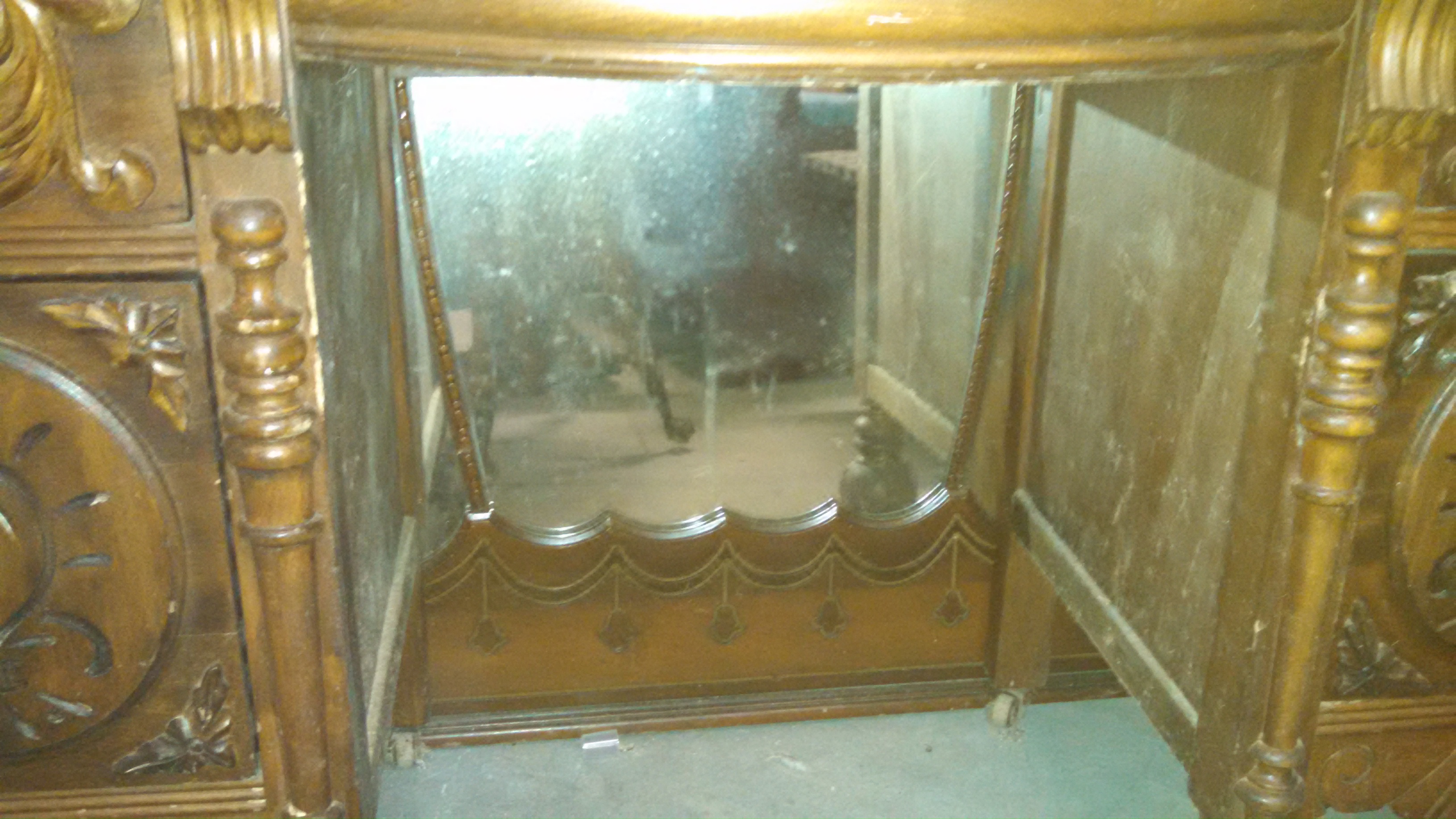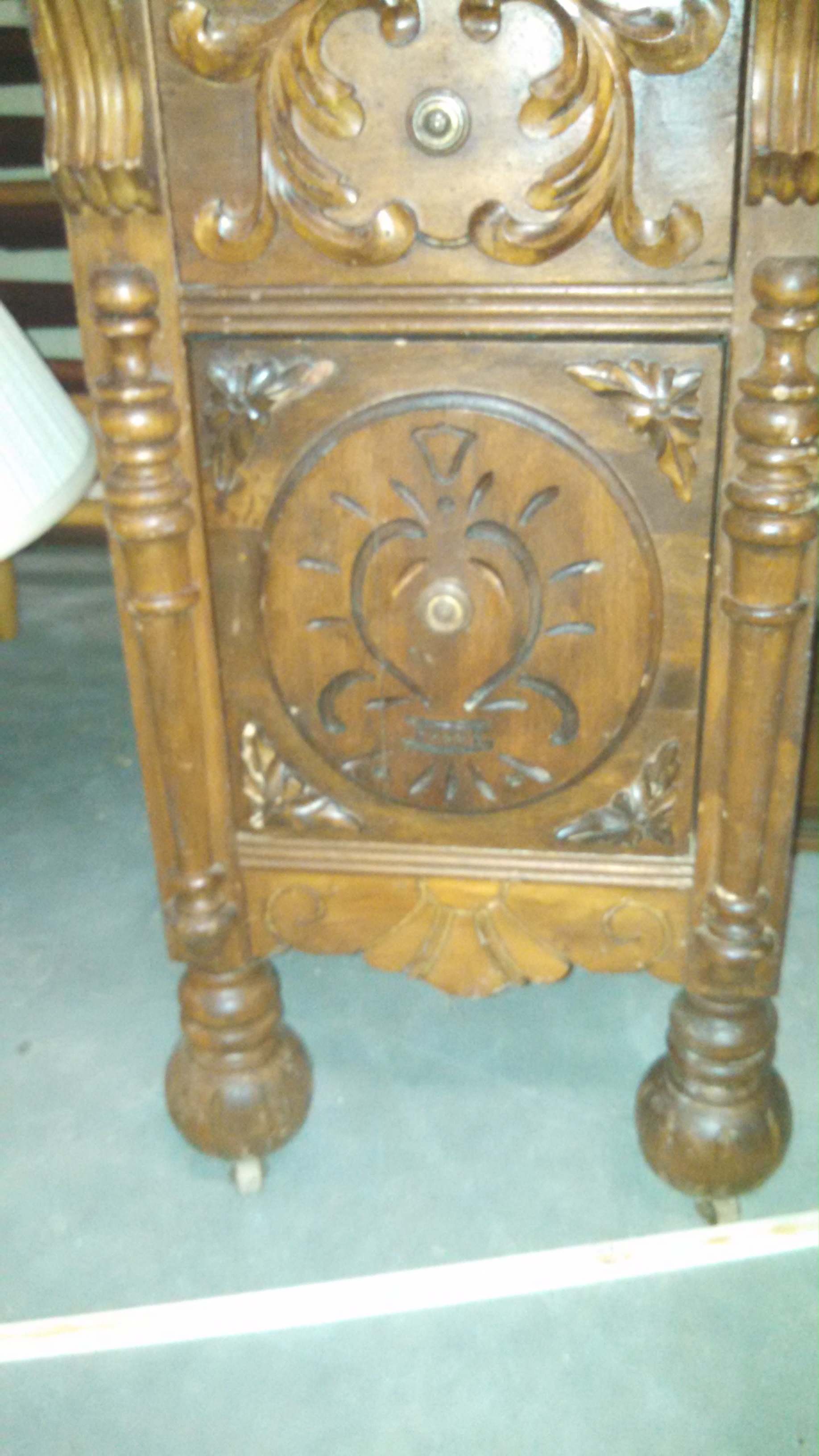 Trying to find out who made the table and how much it is worth. It also has a mirror that looks like a 3 way with carved bells along the bottom. Attached is a partial picture of the bottom of the mirror. 3rd pic is top of mirror. 4th pic is of carving on doors