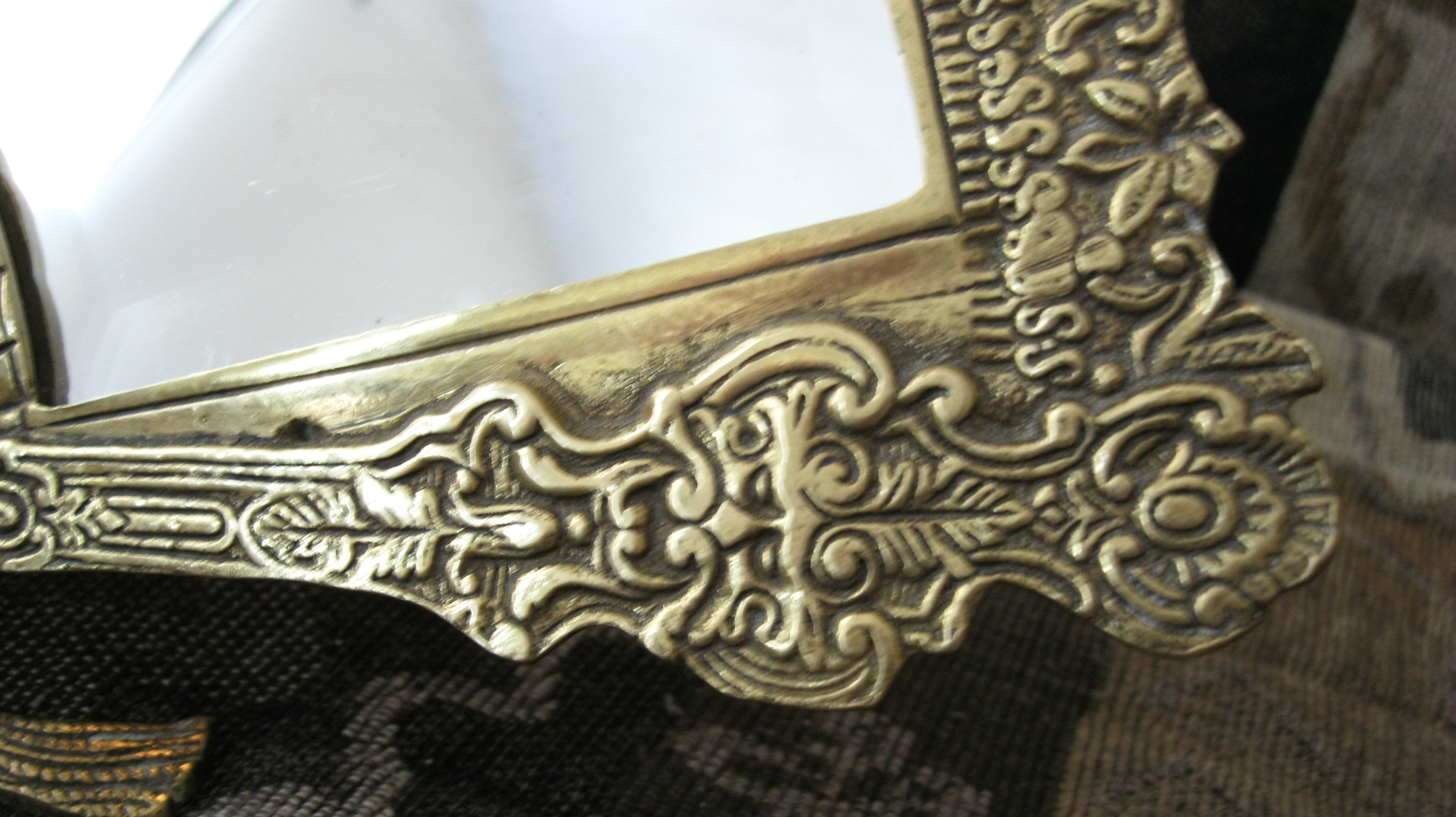 Antique Victorian solid brass fan mirror with beveled glass and stand in excellent condition