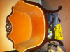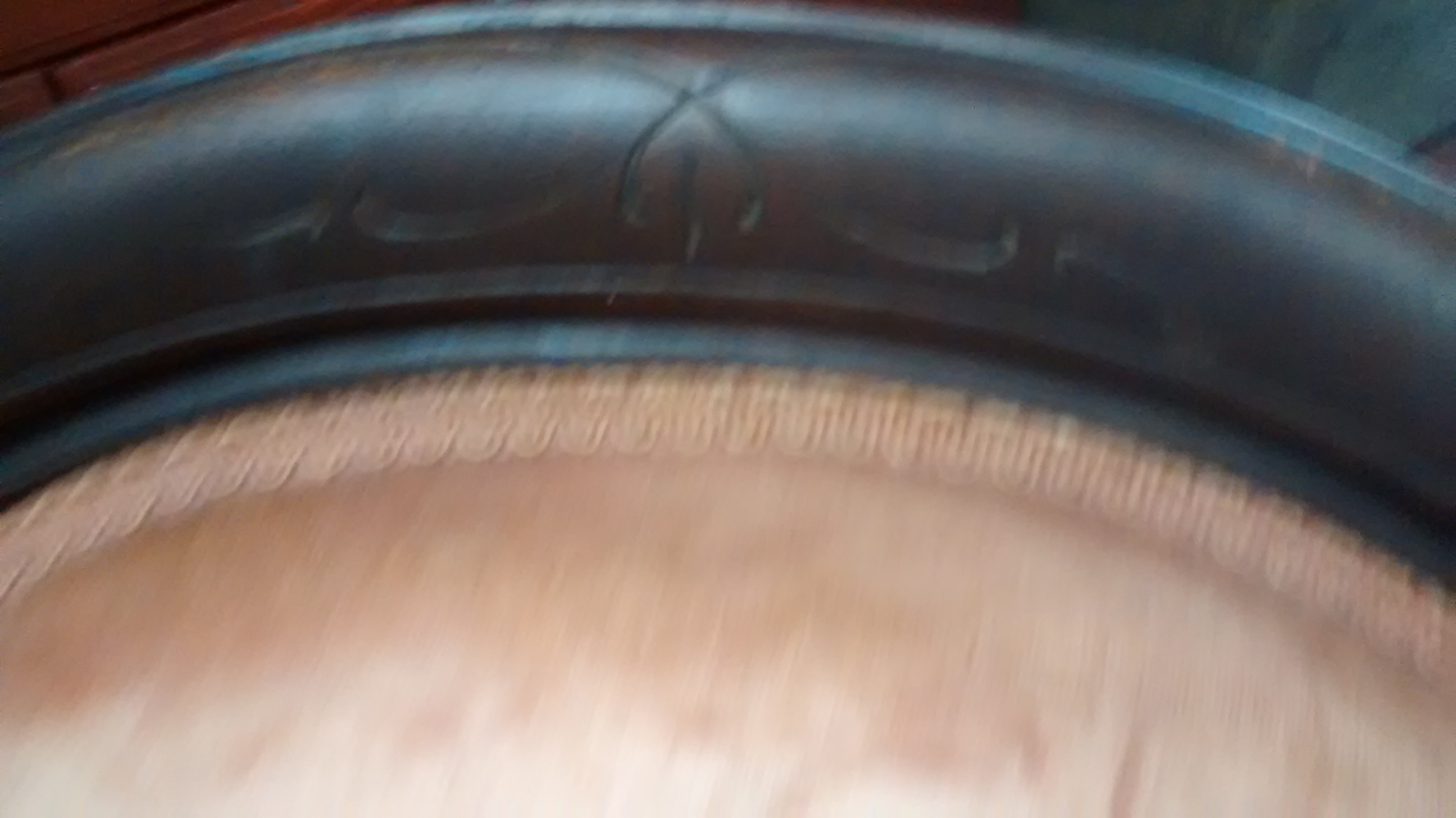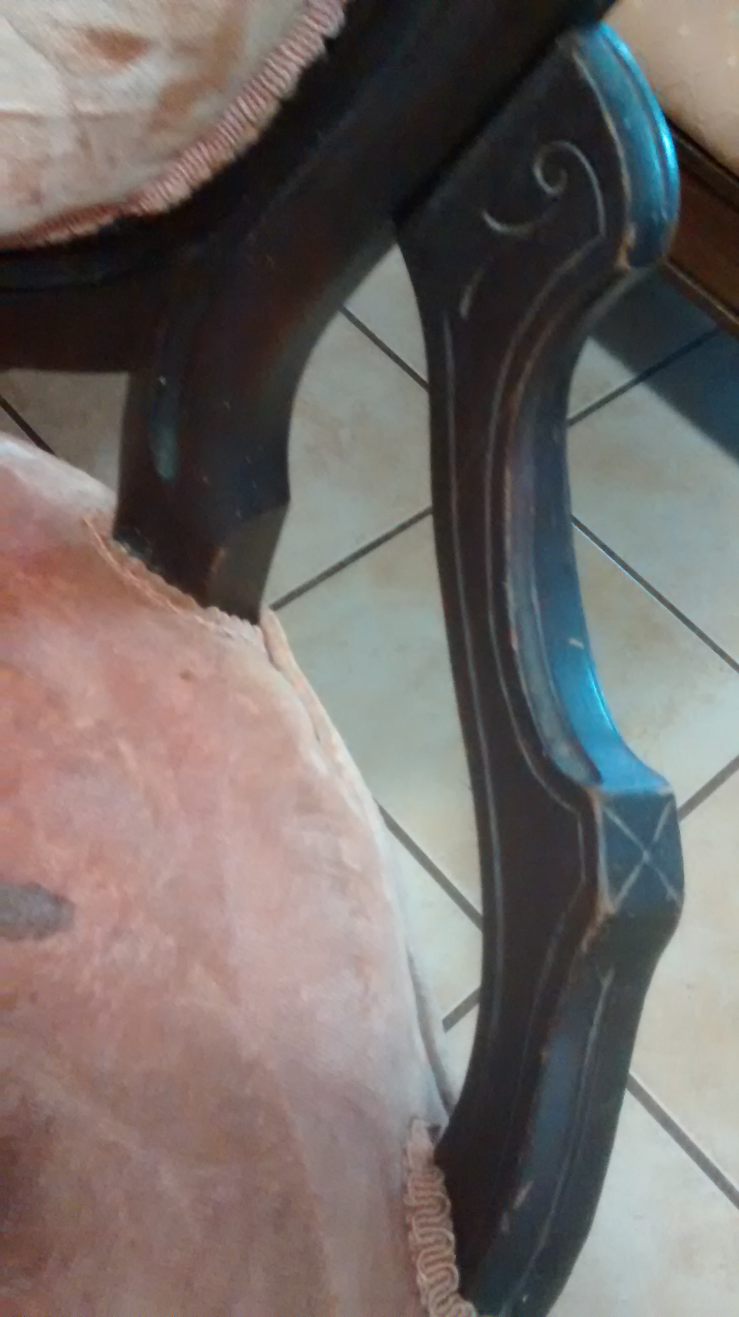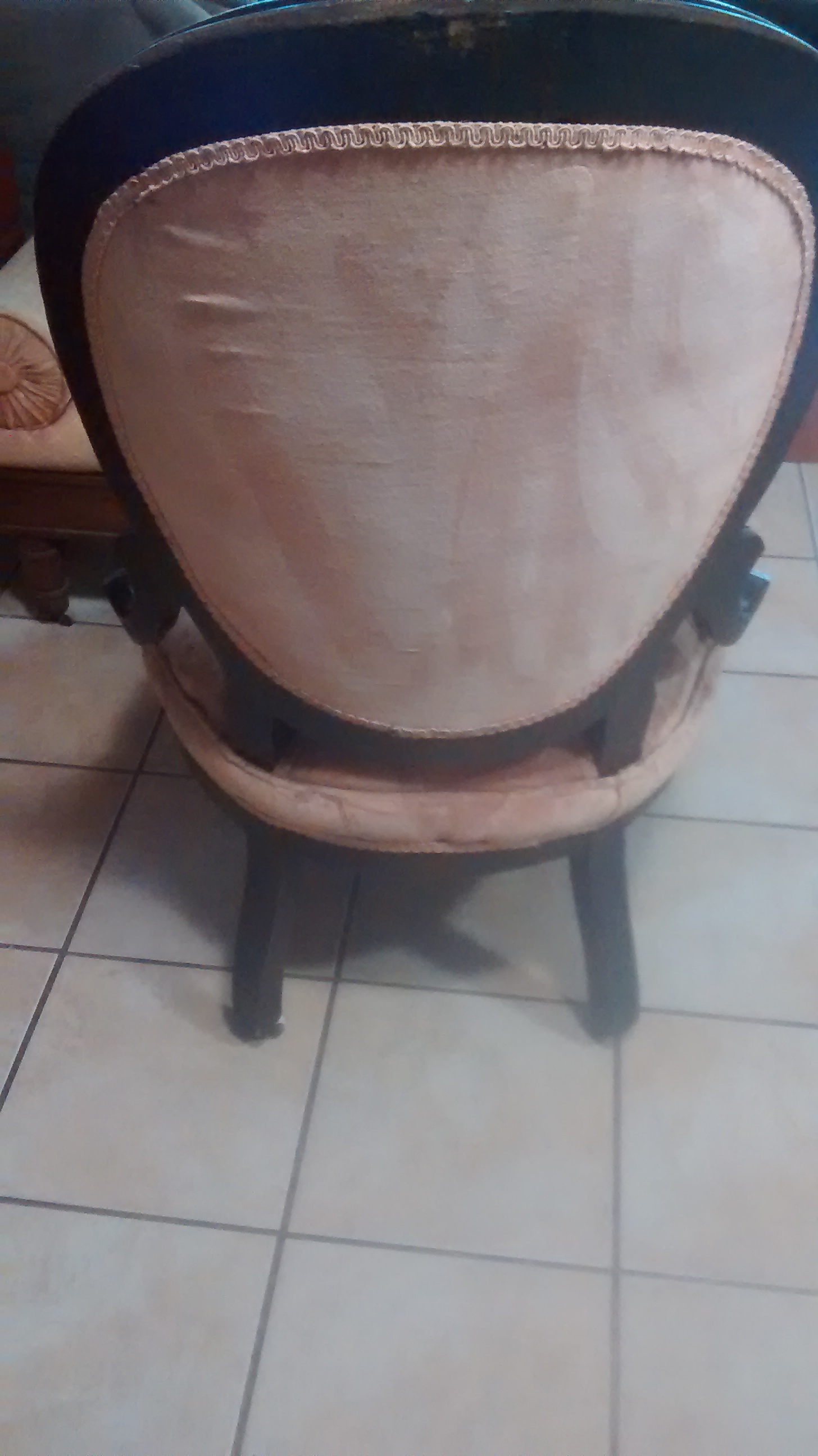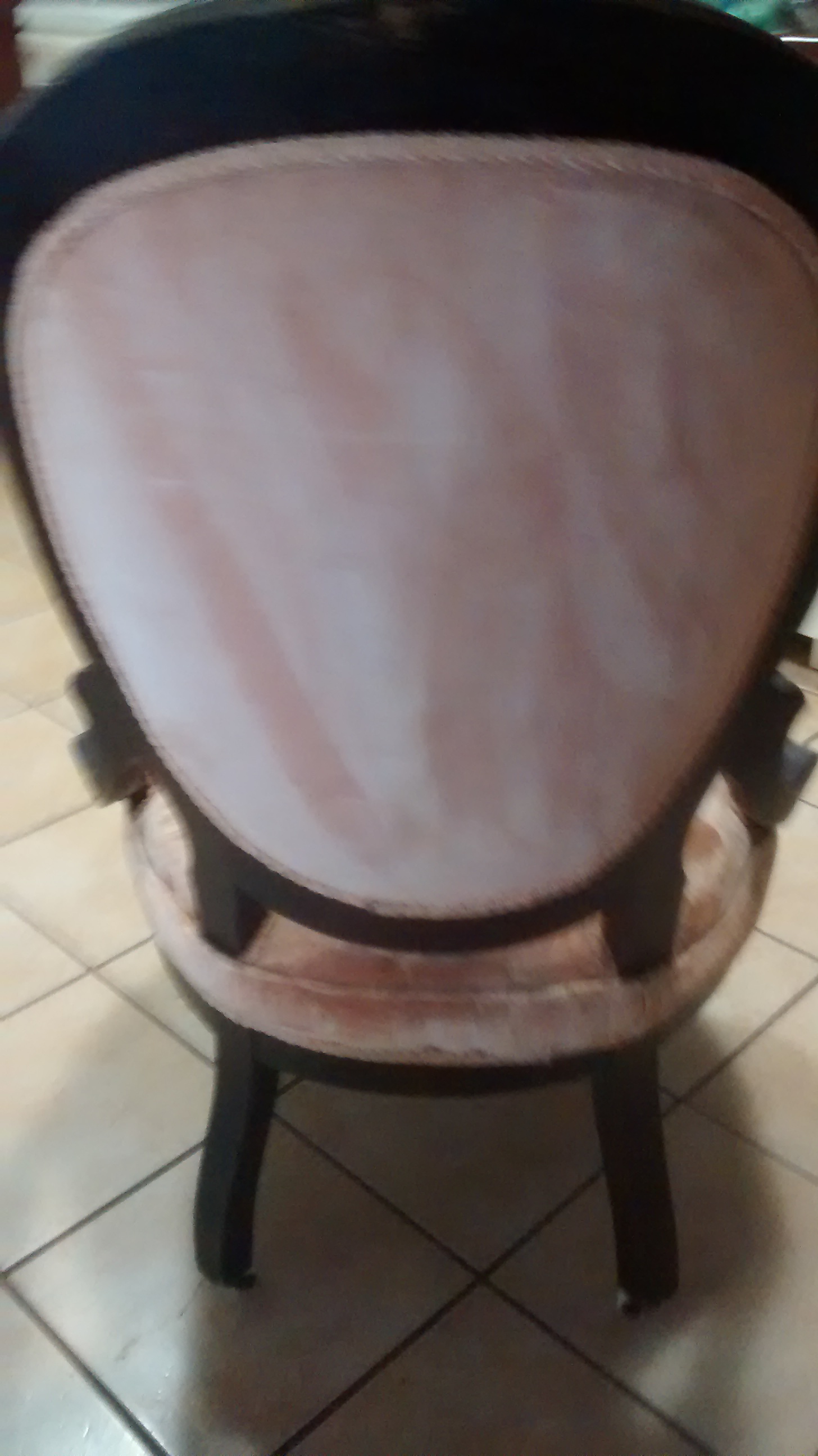 Wood with fabric and white wheels .This chair was given to me so I dont know much if anything about it except that its old.