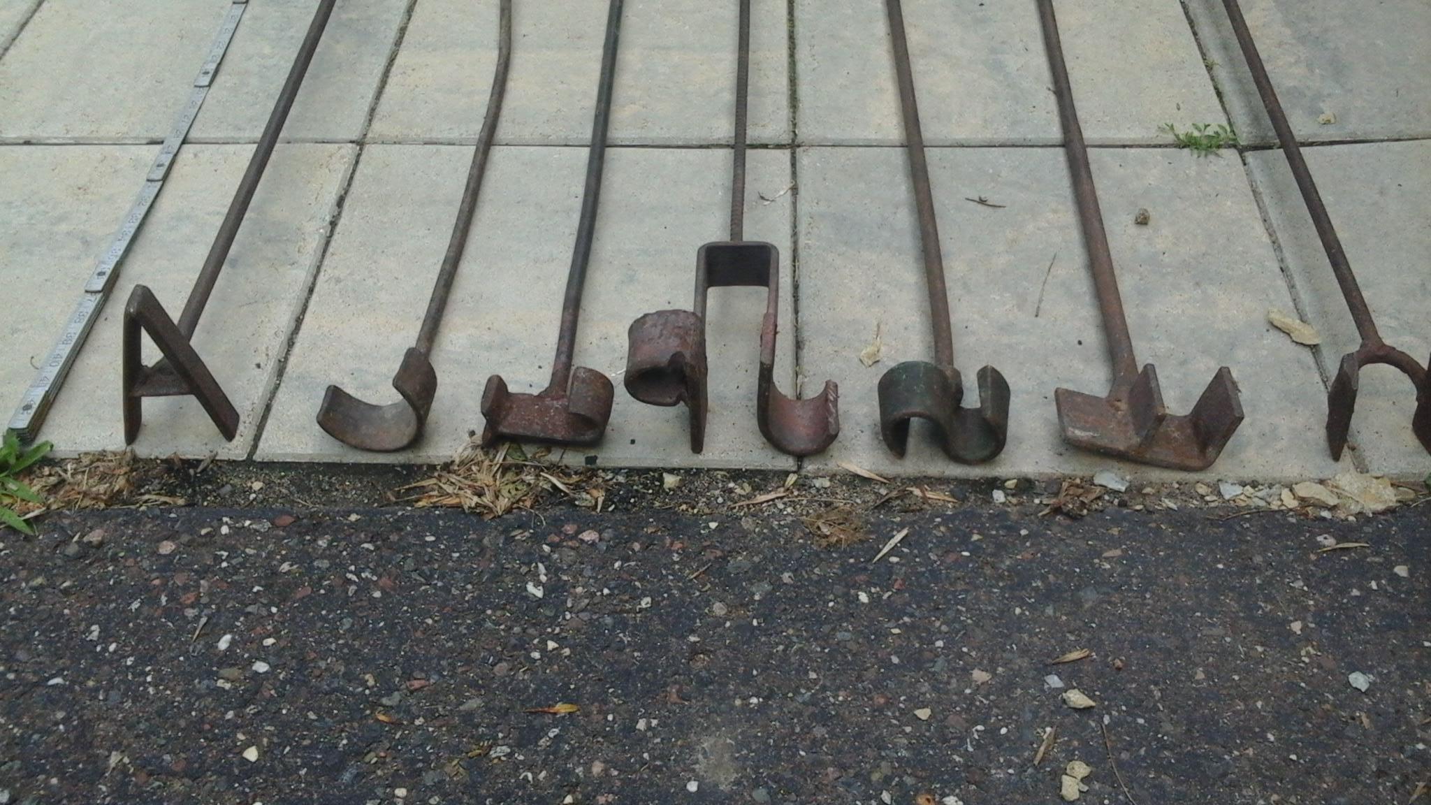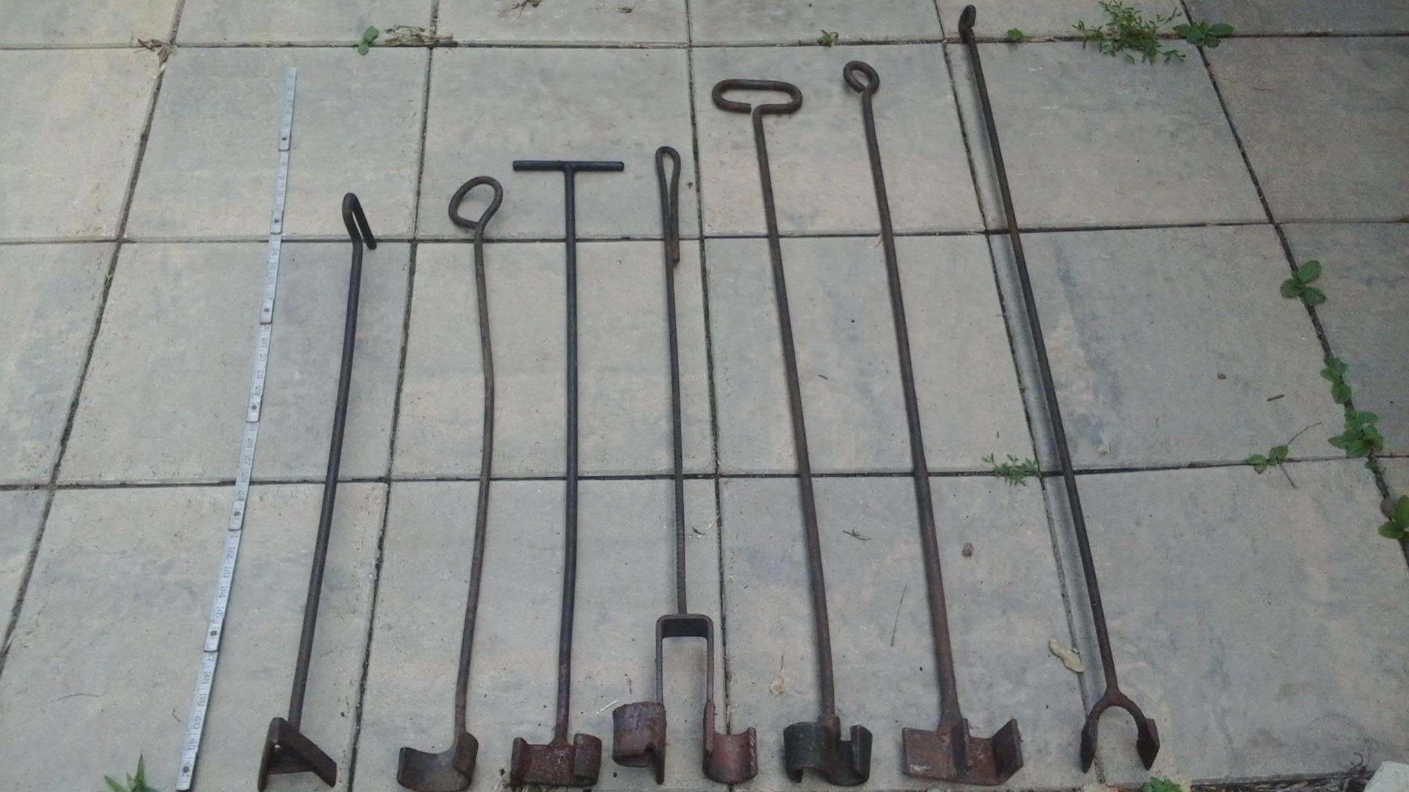 Here is a lot of 7 vintage/antique branding irons. "A" is 29.5 in., "C" is 33 in.and seems to me  to be very old. "J" with a v on top is 35 in. "JP" is 36 in (old), "S" is 41.5 in and seems to be the only one that is not hand made, "F" 42 in and the "Double Bar" is 46 in. All have significant aging.  Any info would be very helpful.  Thx,  Michael.