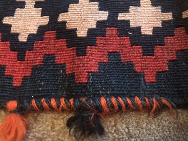 Bought from a thrift store for $5 in Omaha Nebraska. Approximately 9’ 6” x 5’ 2”. Rather nice and clean condition. Slightly dusty. Some pulled wear to edges. Wondering age? Is it hand woven? Is it Native American? Of any value? Material? Any info appreciated.