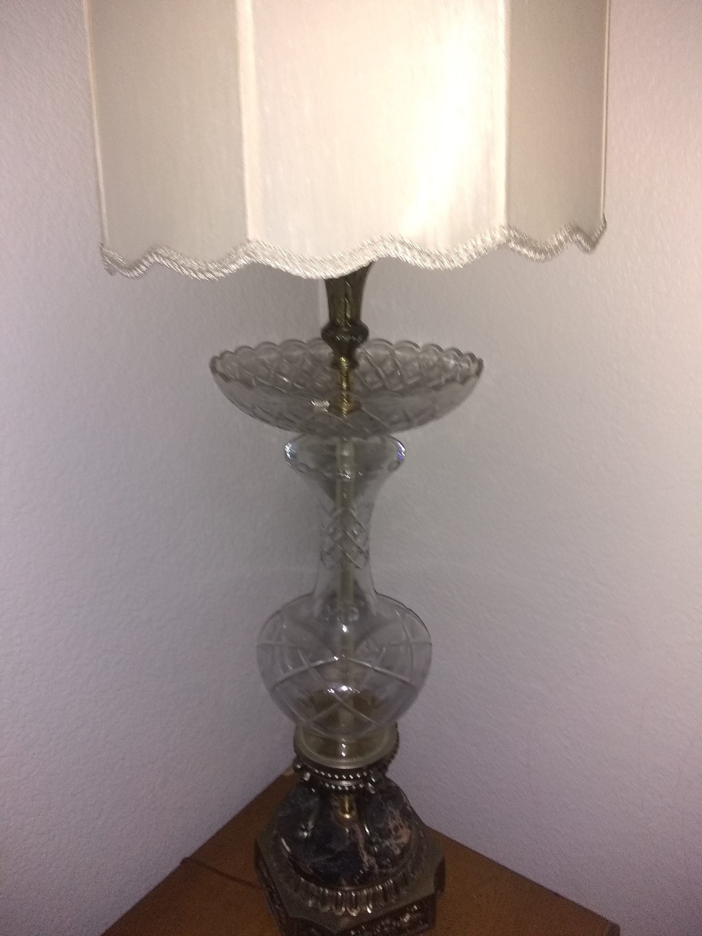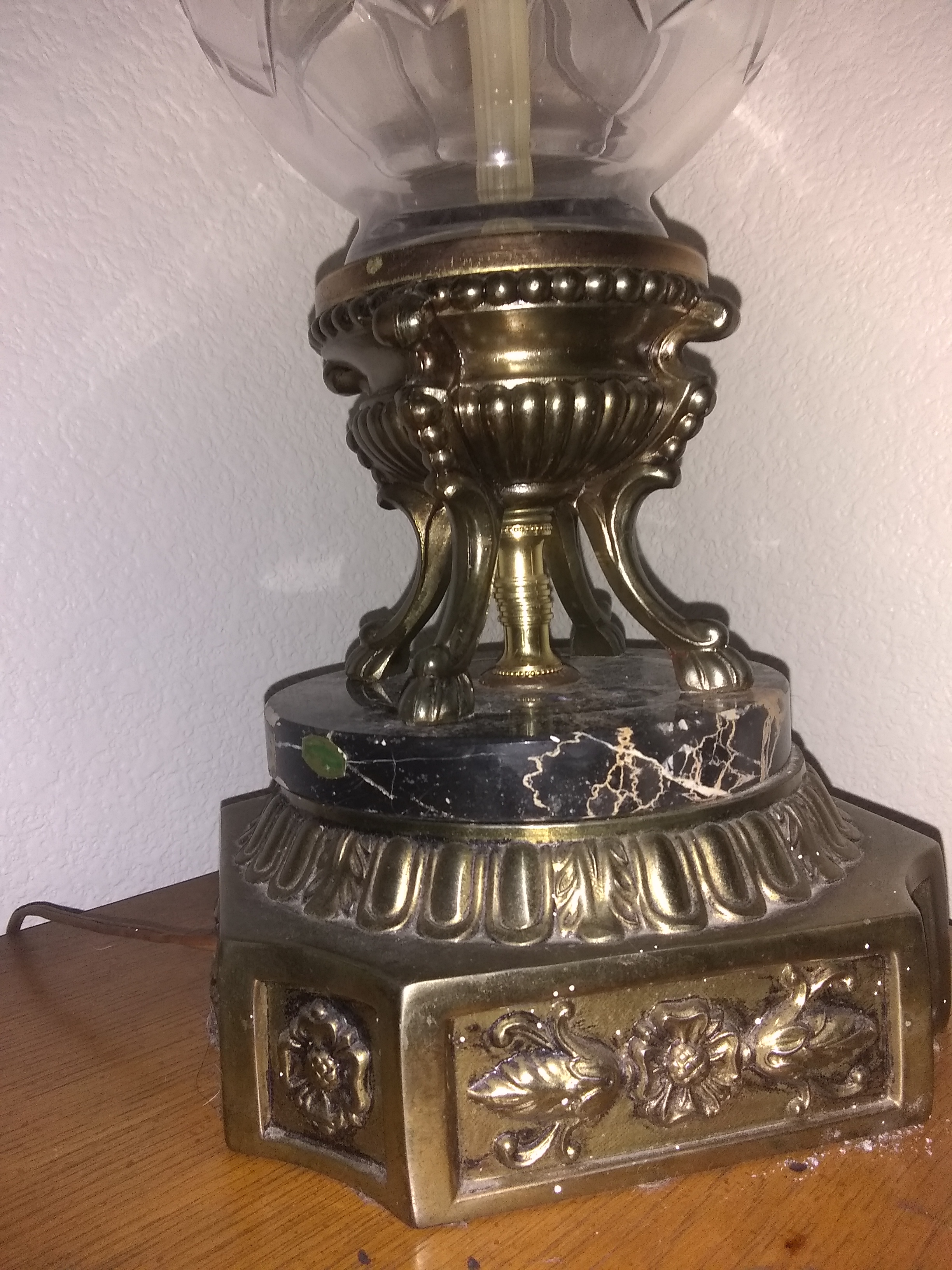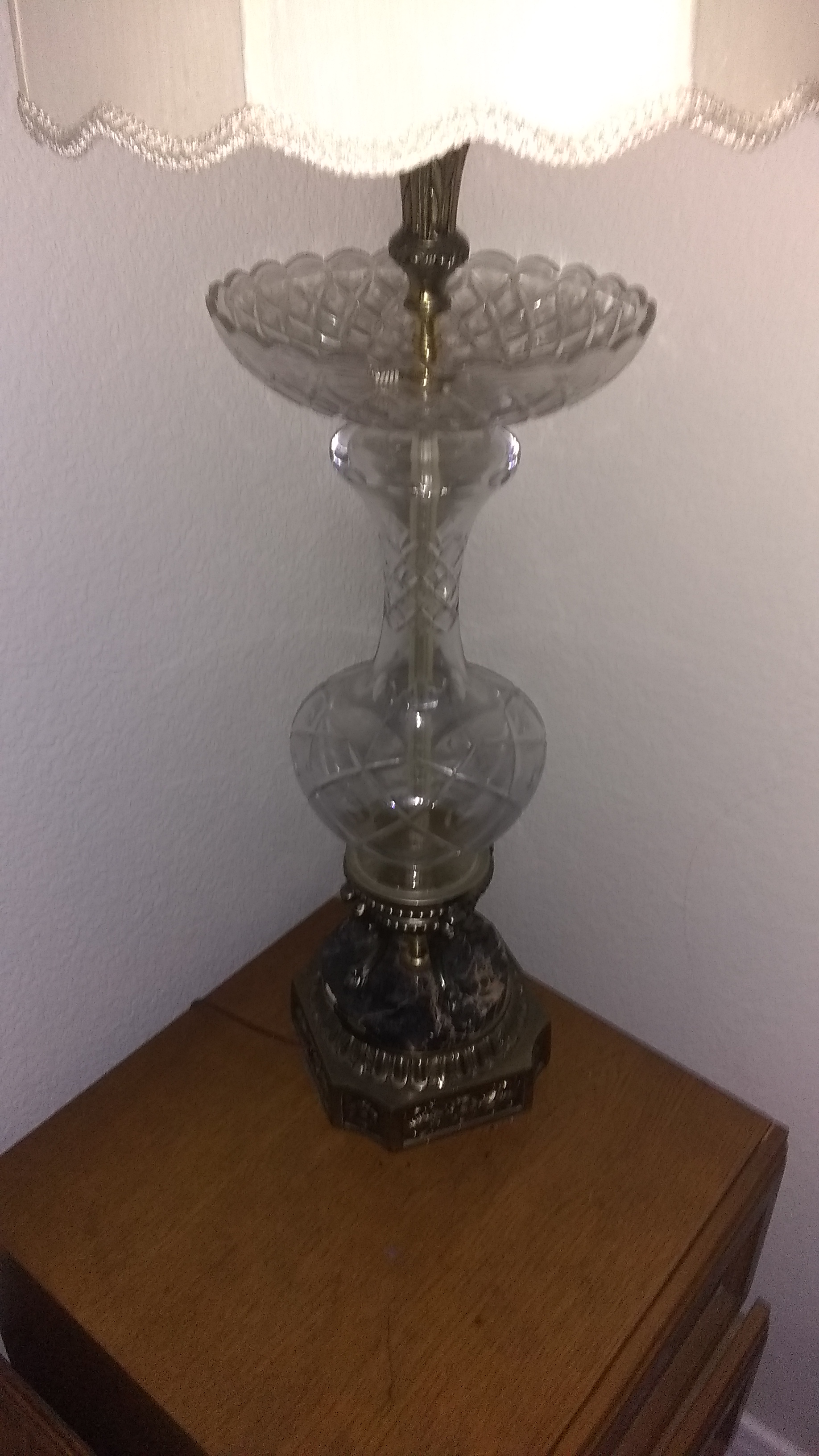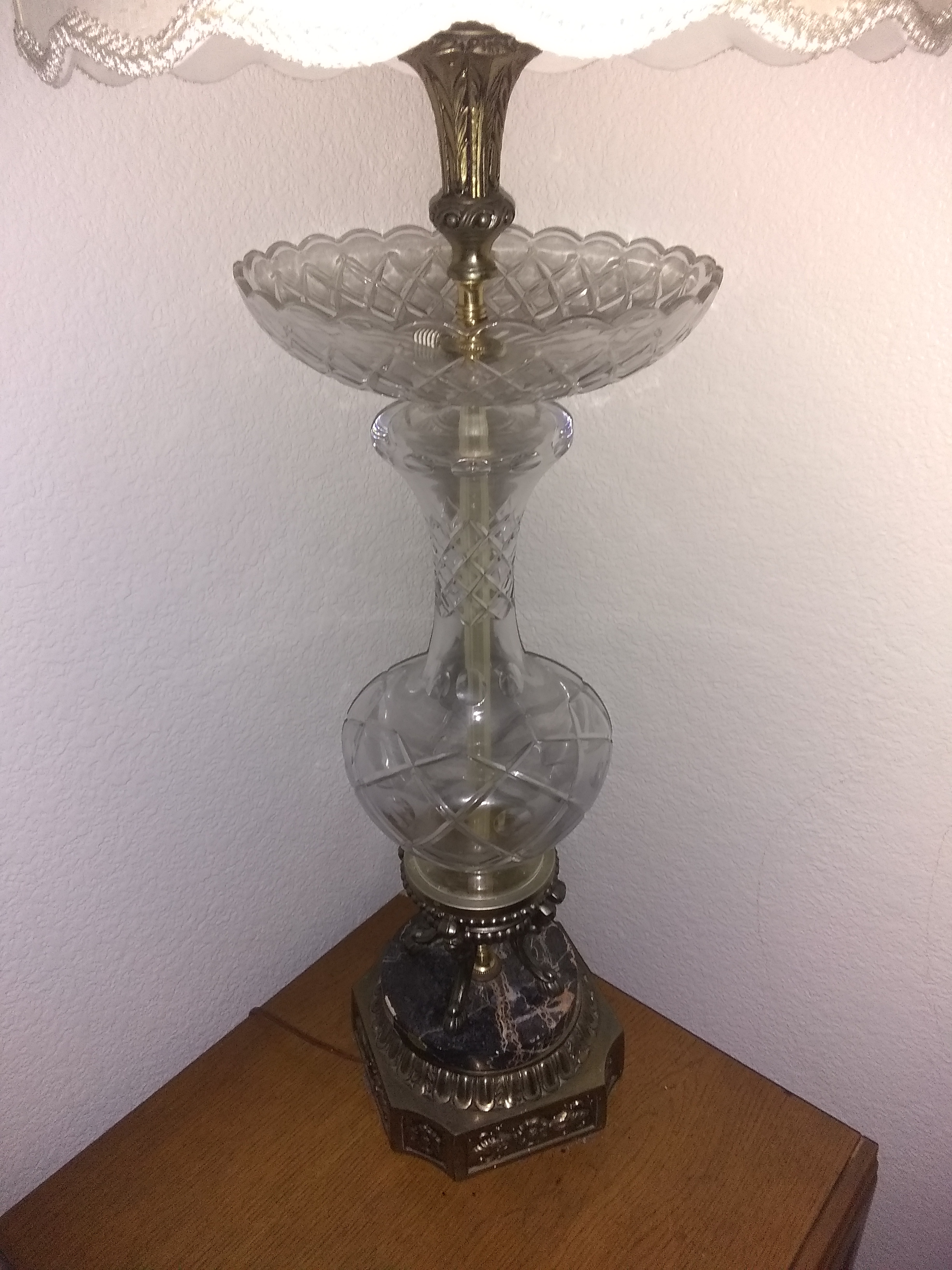 This electrical lamp is about 3 feet tall made out of crystal glass the base is genuine Carrara marble with brass right below with beautiful flower design.