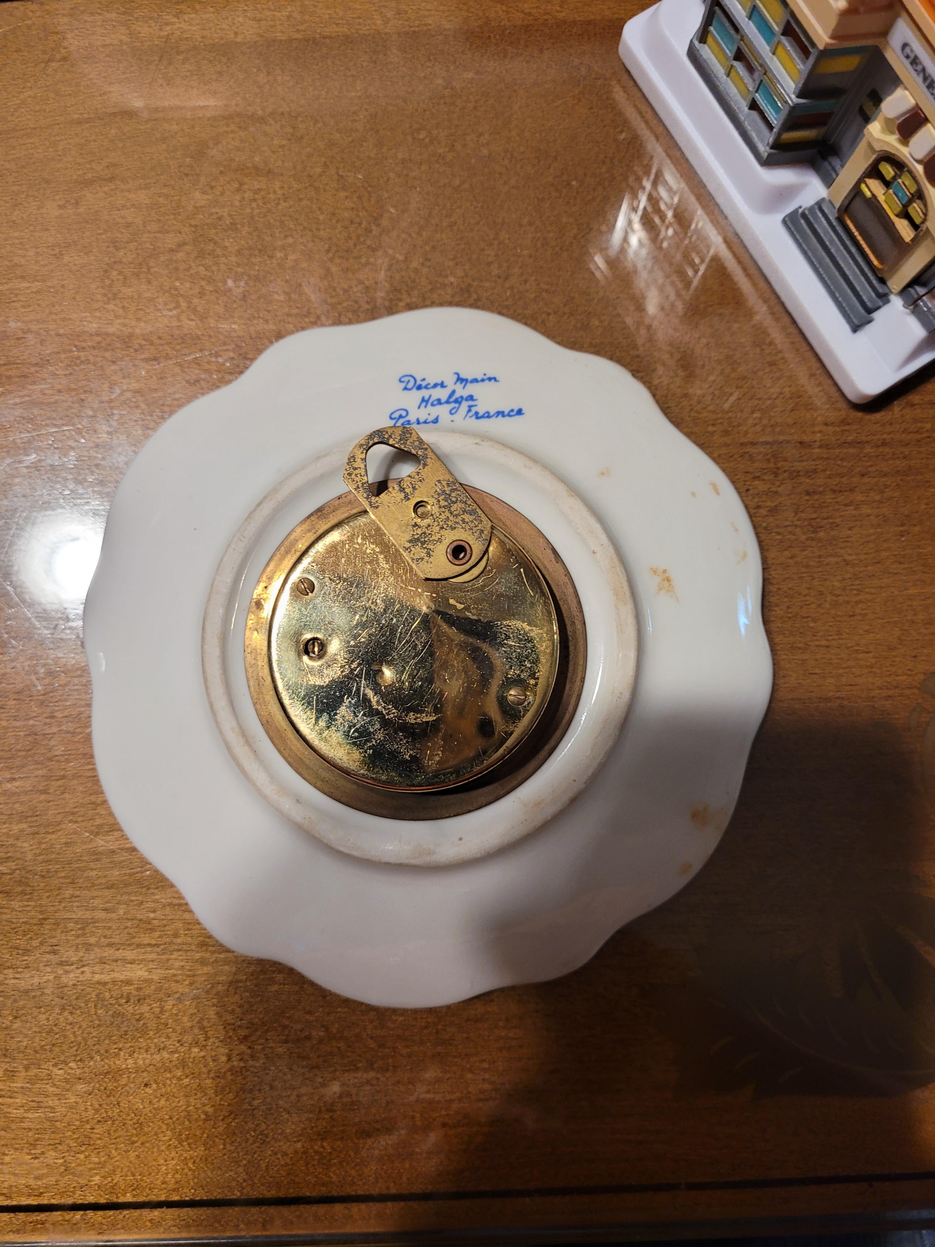 The item is a small China plate, about 5 inches in diameter. Tbere is a barometer/thermometer in the center. The back has the markings "Decor Main Halga Paris, France". There are no other markings.