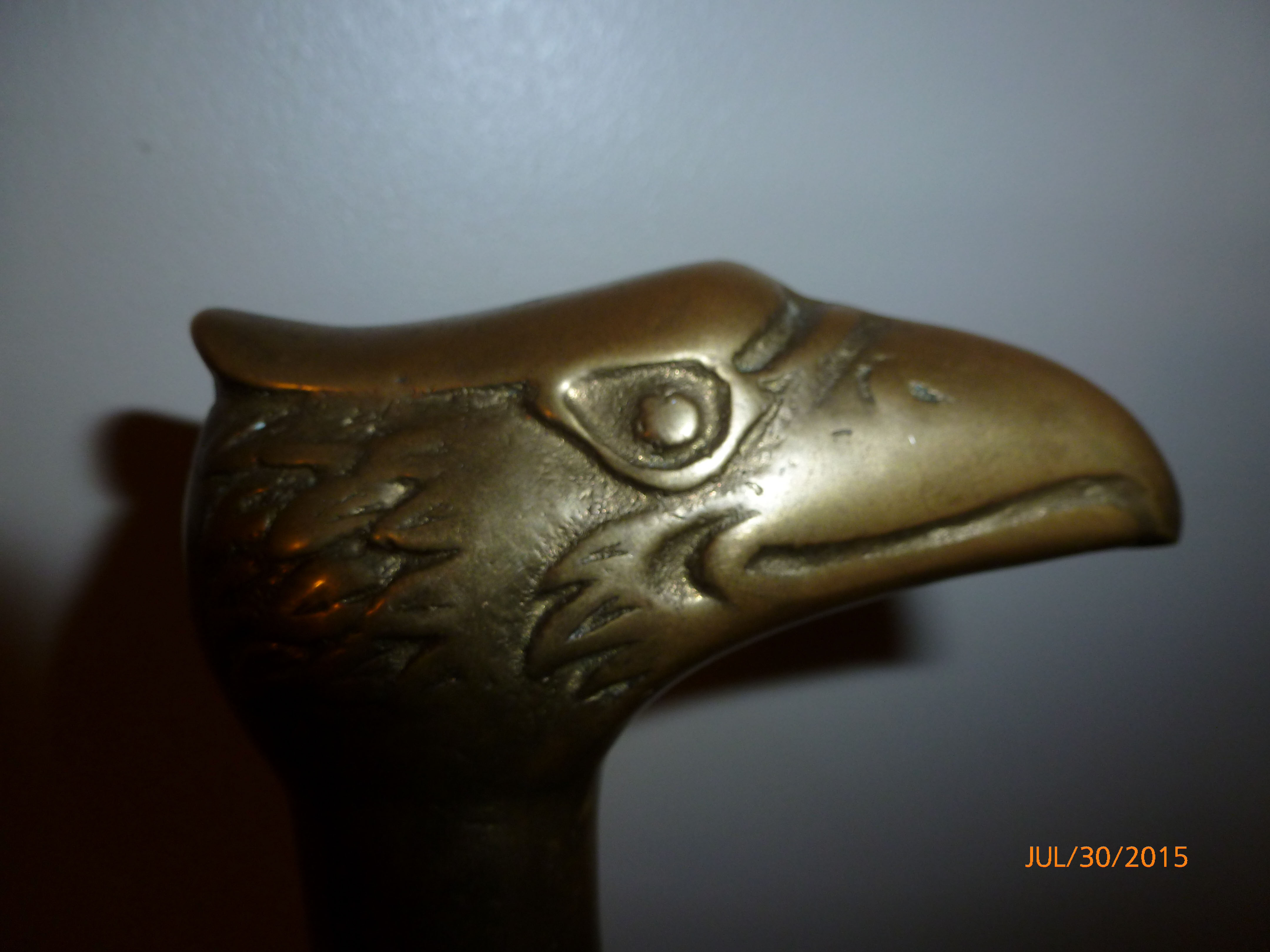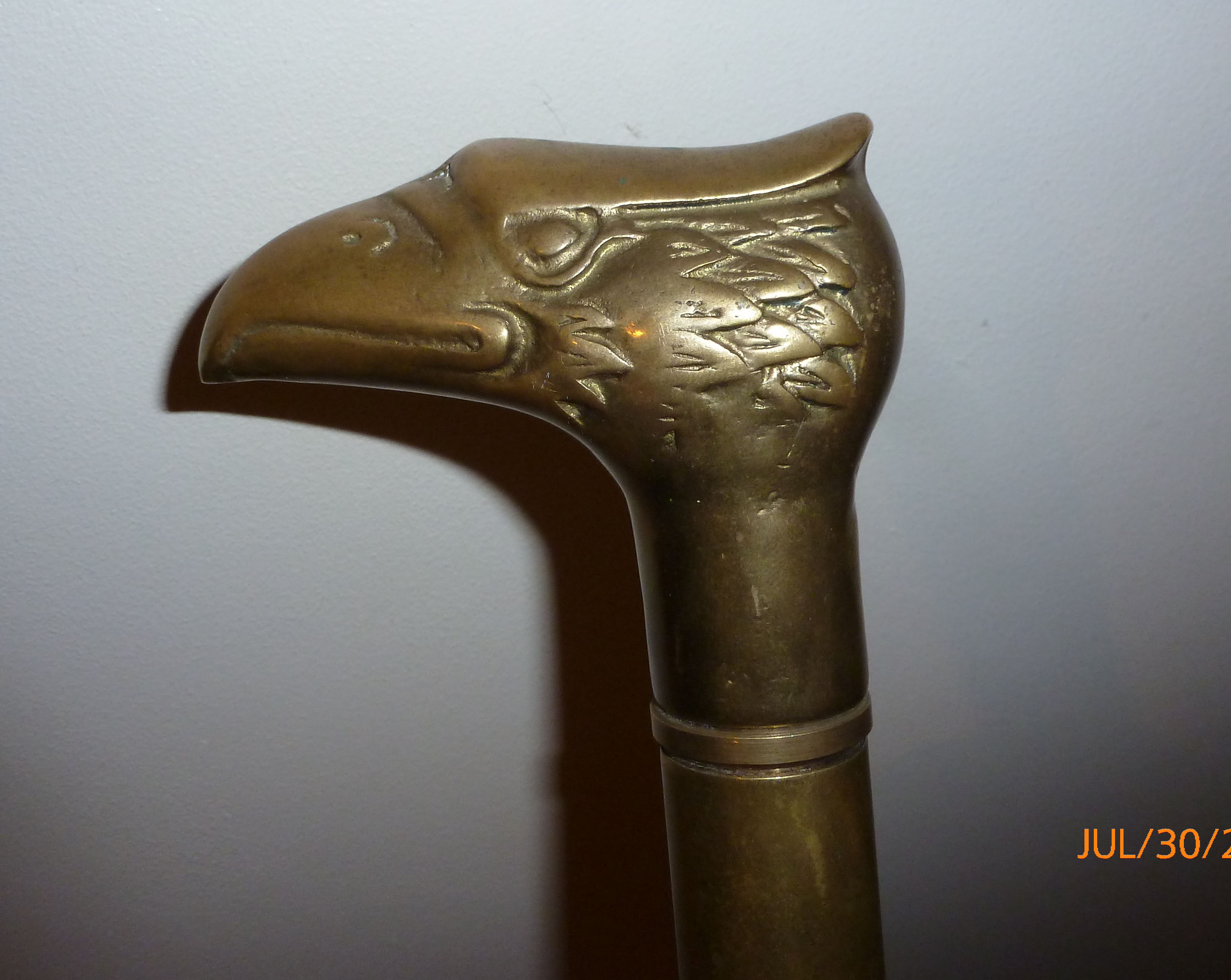 It has a brass handle and a silver tip on the end; it is made of bamboo.