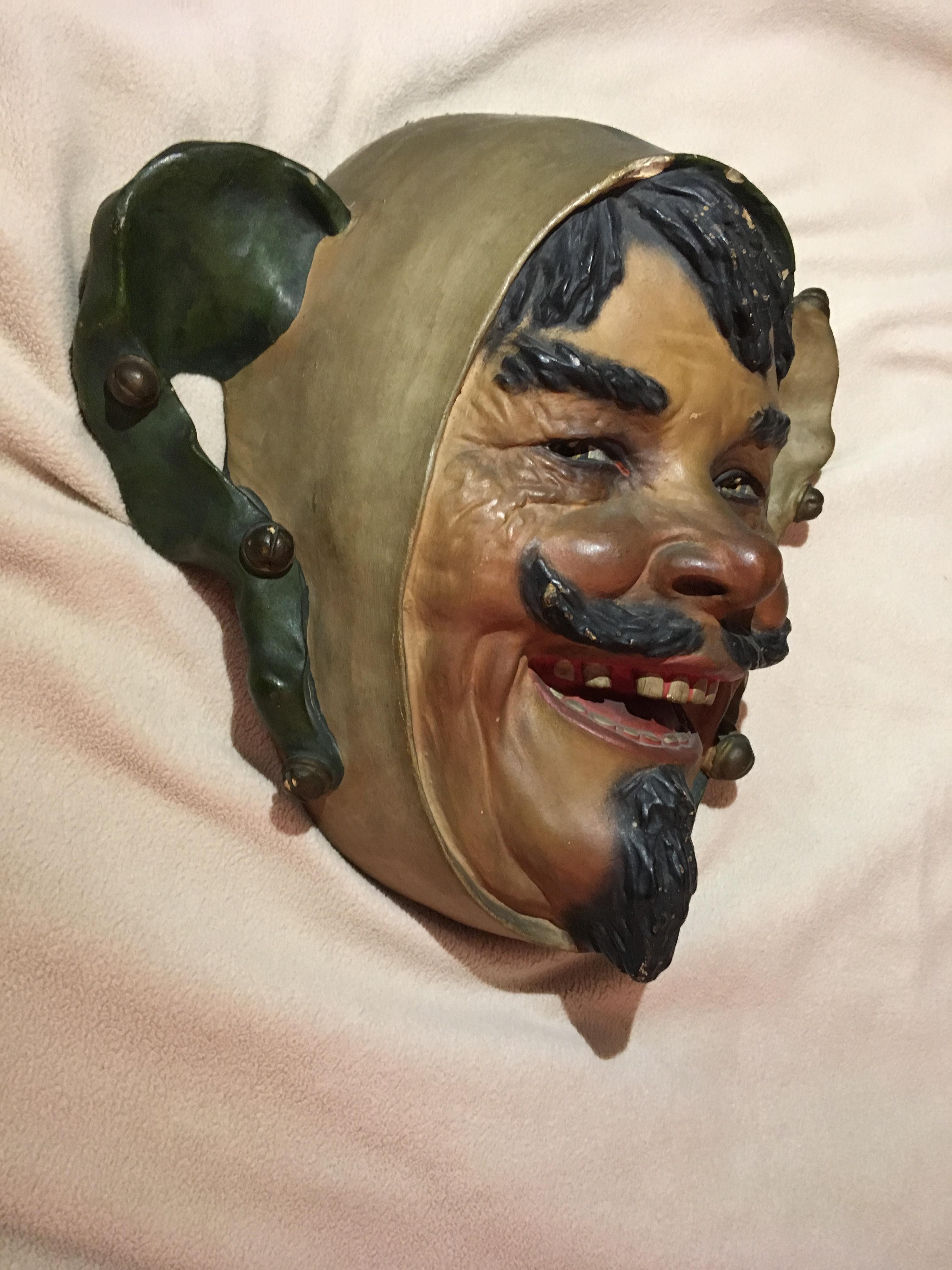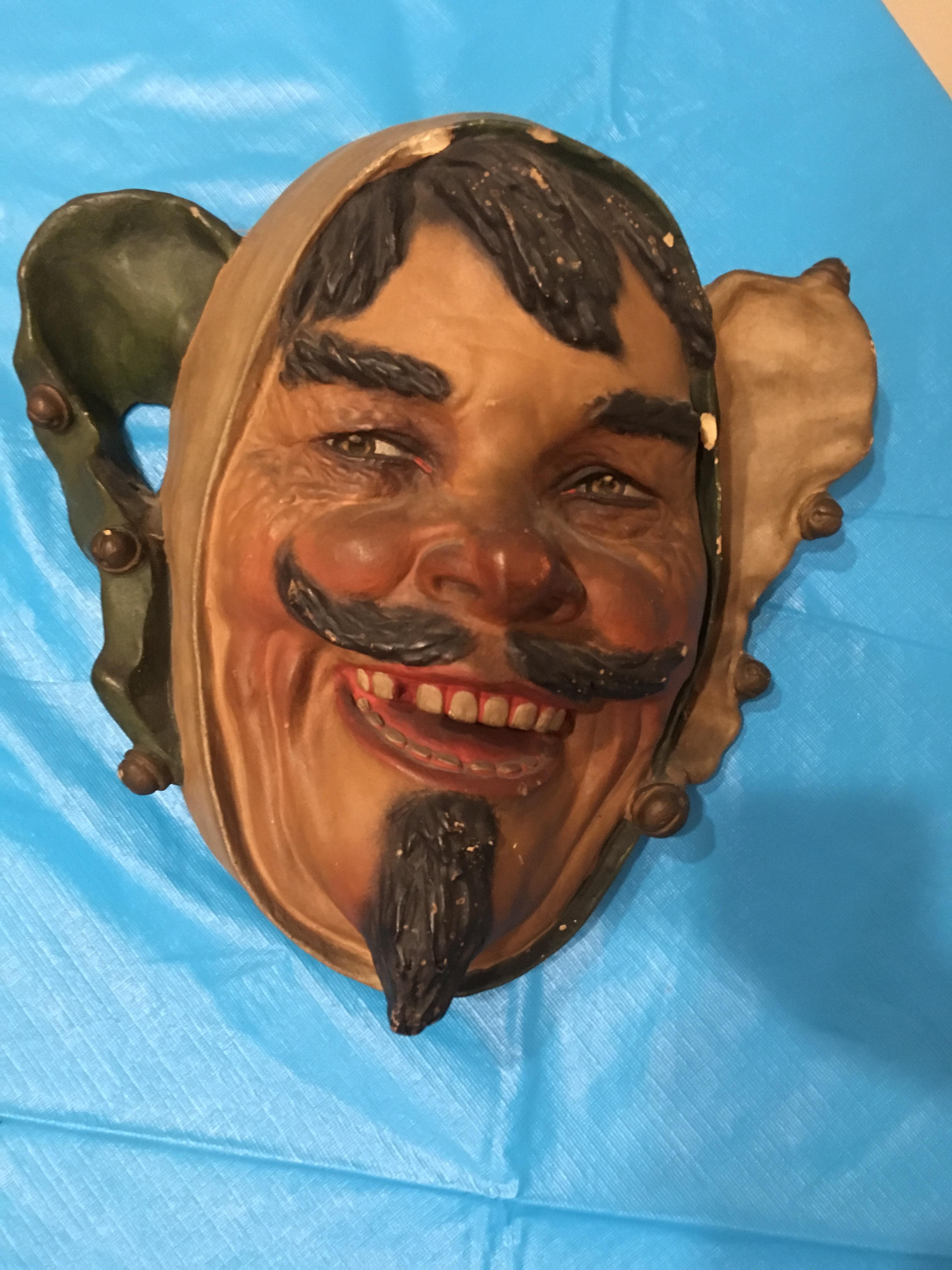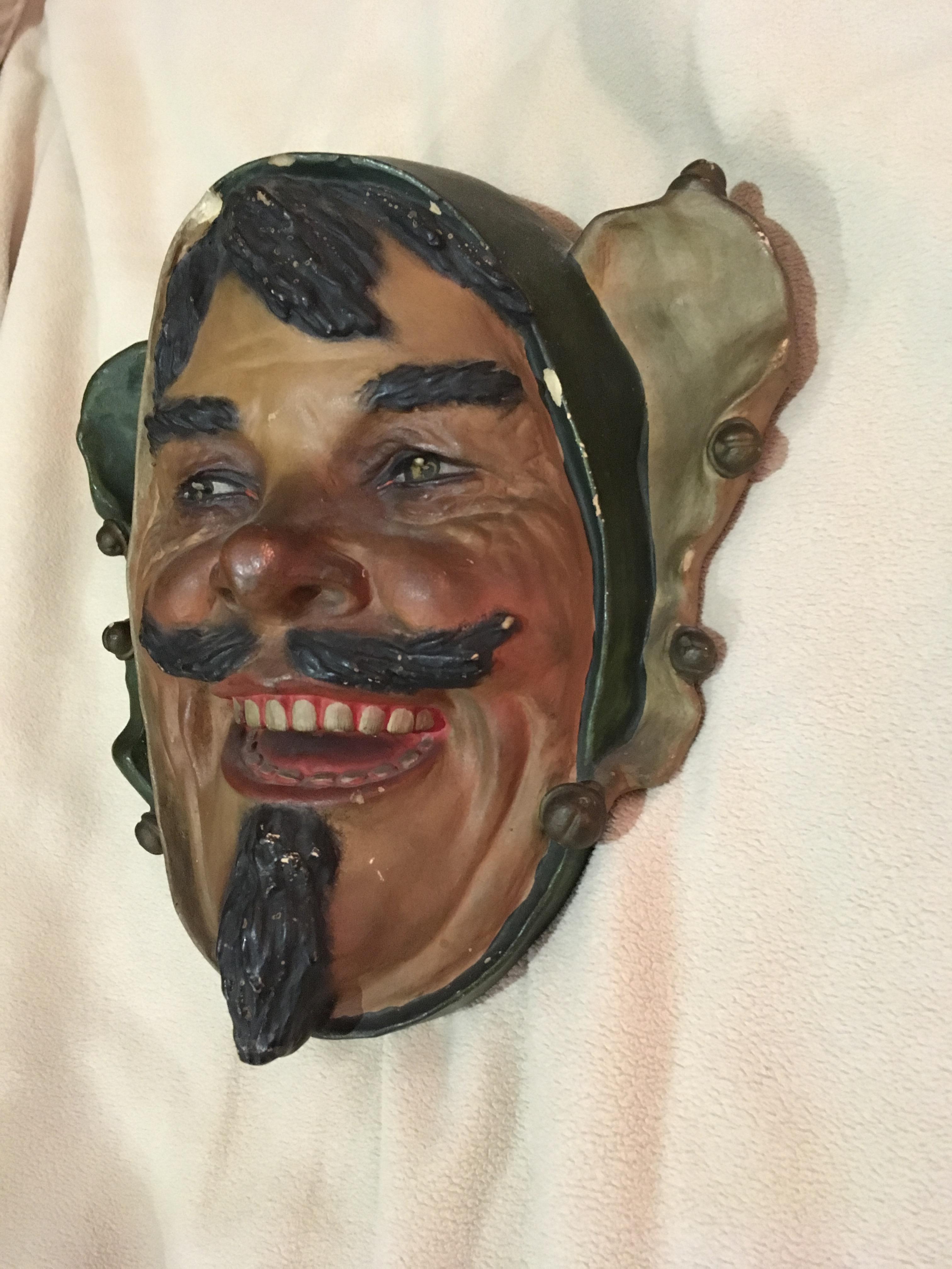 This head has been in our family for years. My grandmother is moving and wants me to check its value before getting rid of it. It is about the size of a real head. It is a three dimensional creation of a man laughing.