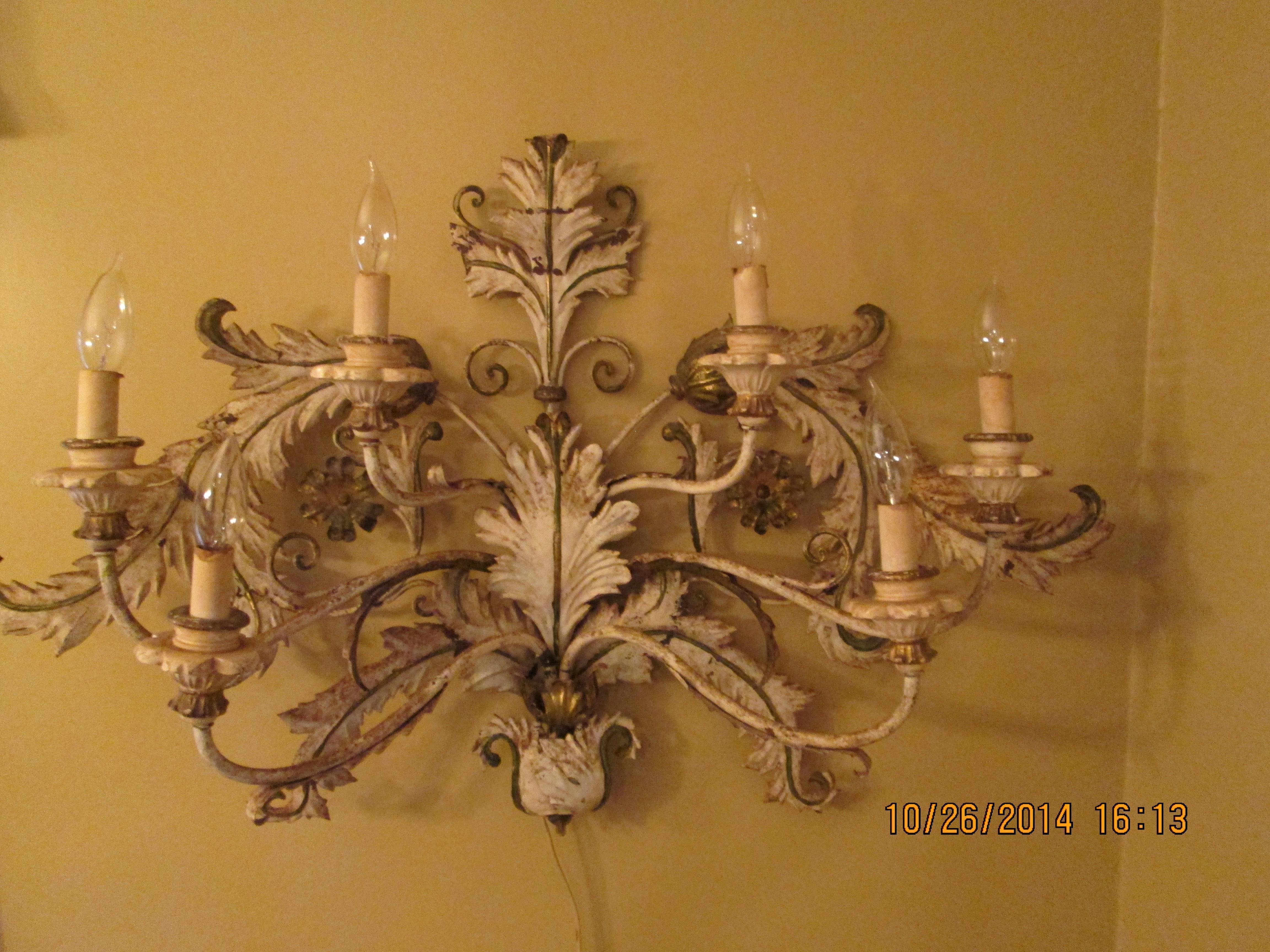 The sconce belongs to my mother and is old but I don't know how old. She purchased it about 15 years ago. It is approx 28 inches across and 21 inches high. It is electric and all the lights work. It has 6 candleabra lights and they all work. It is a heavy metal maybe brass or bronze but with ivory colored paint on parts of it.. Each one of the candleabras have 'Made in Italy' imprinted on it.