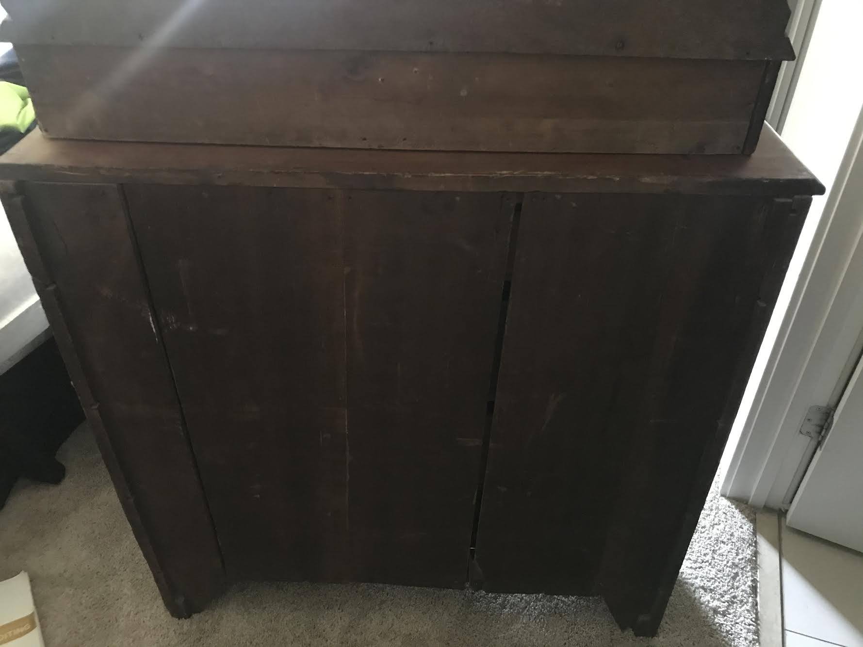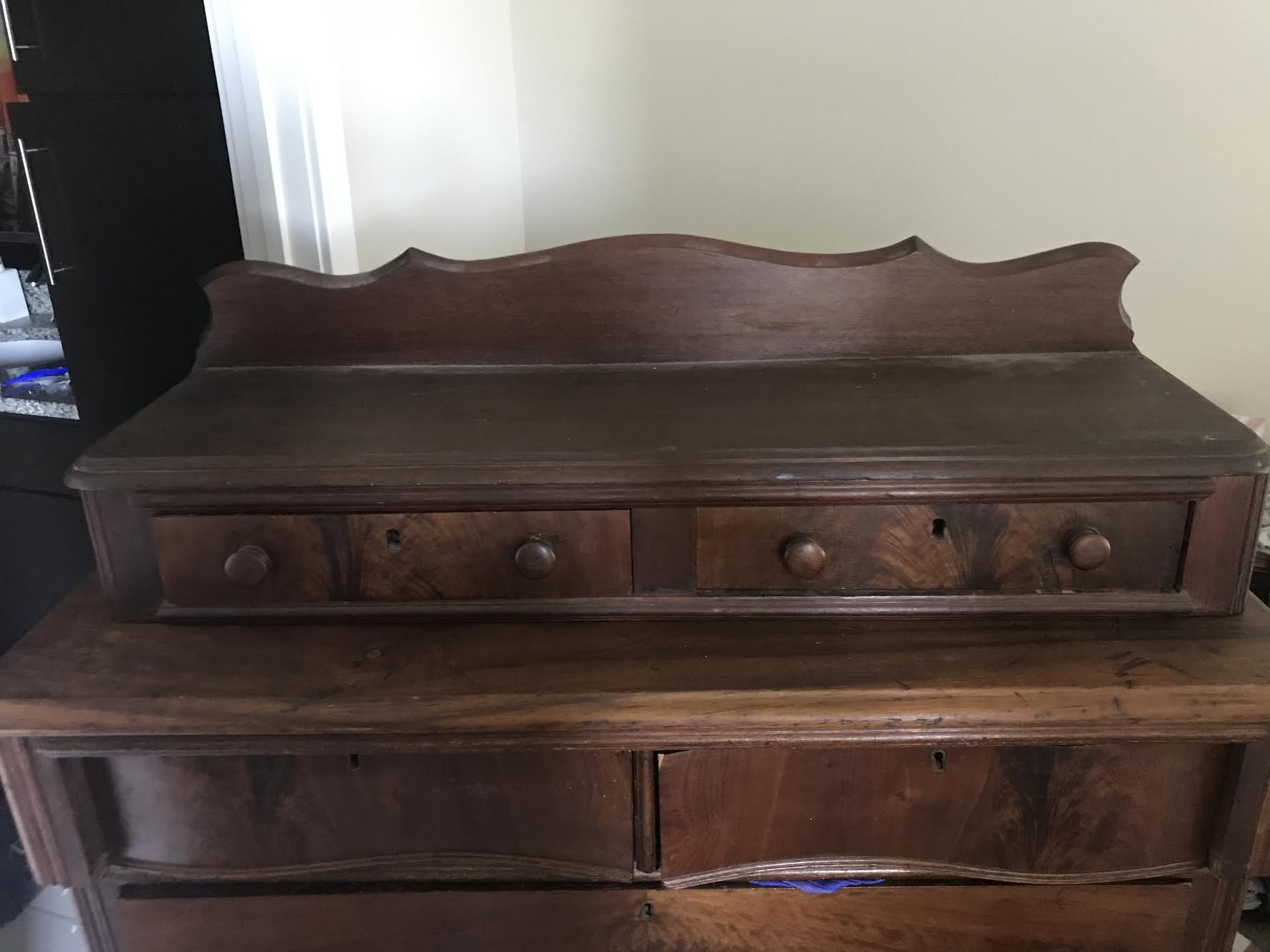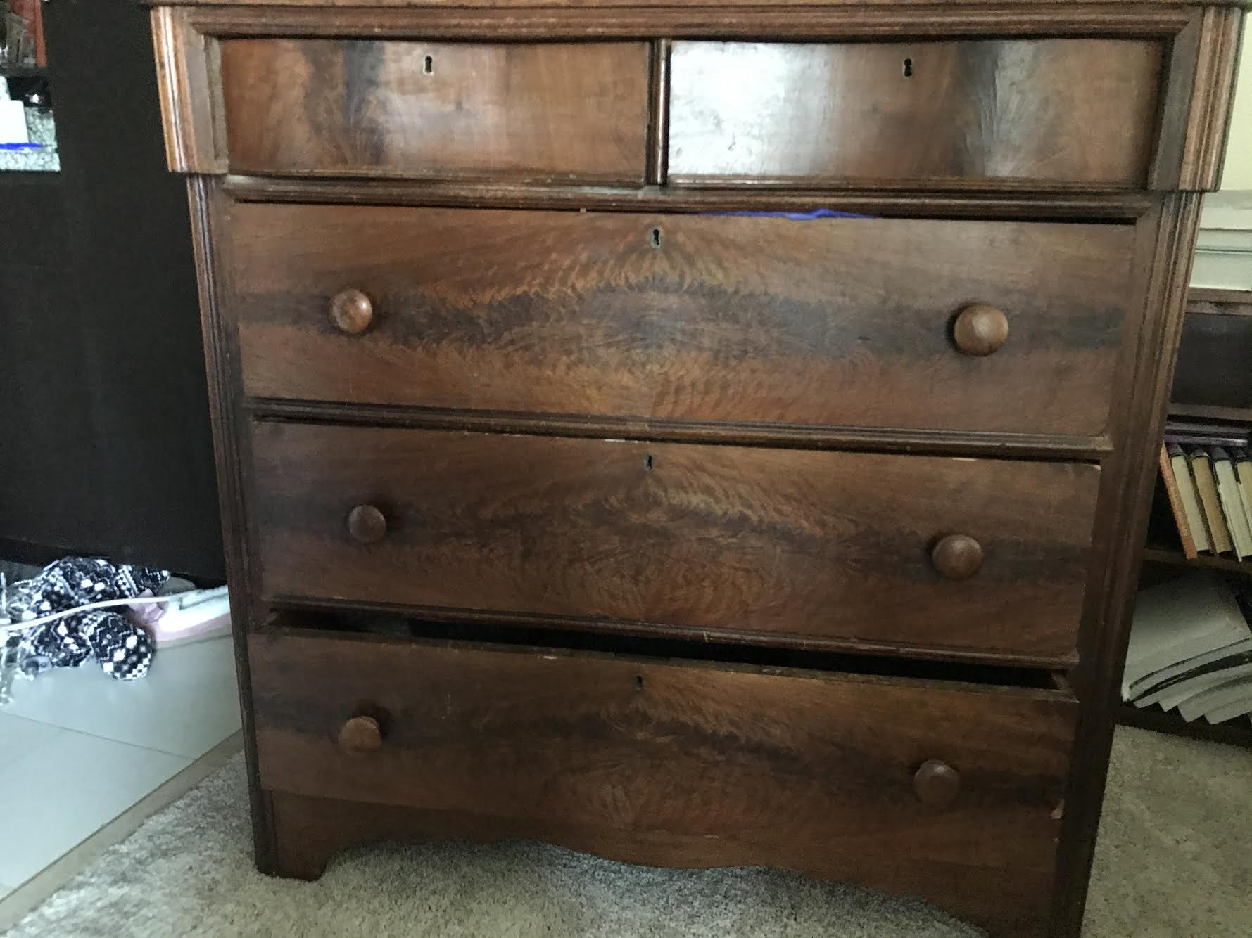 This dresser was my great grandparents and it's at least 100 years old. I think it's walnut wood. The top 2 small lingerie drawers are detachable.