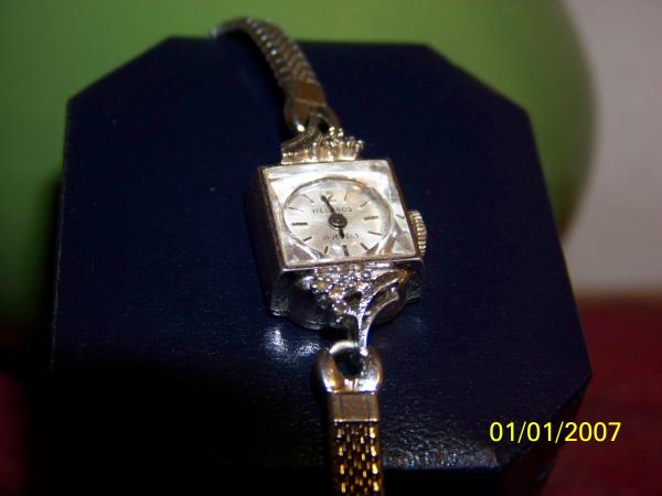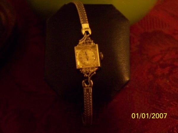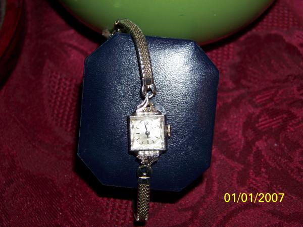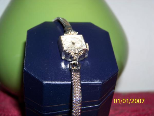 it is a womans watch with 4 diamonds at the top and 4 diamons on the bottom in    wave formation 21 jewels inside still in excellant condition with the weave bracelet   and chain clasp