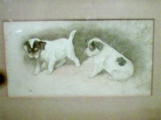 What appears to be a 1907 black and white water color painting with the initials CBU of two black and white puppies. Framed and matted. Wood frame with glass front.