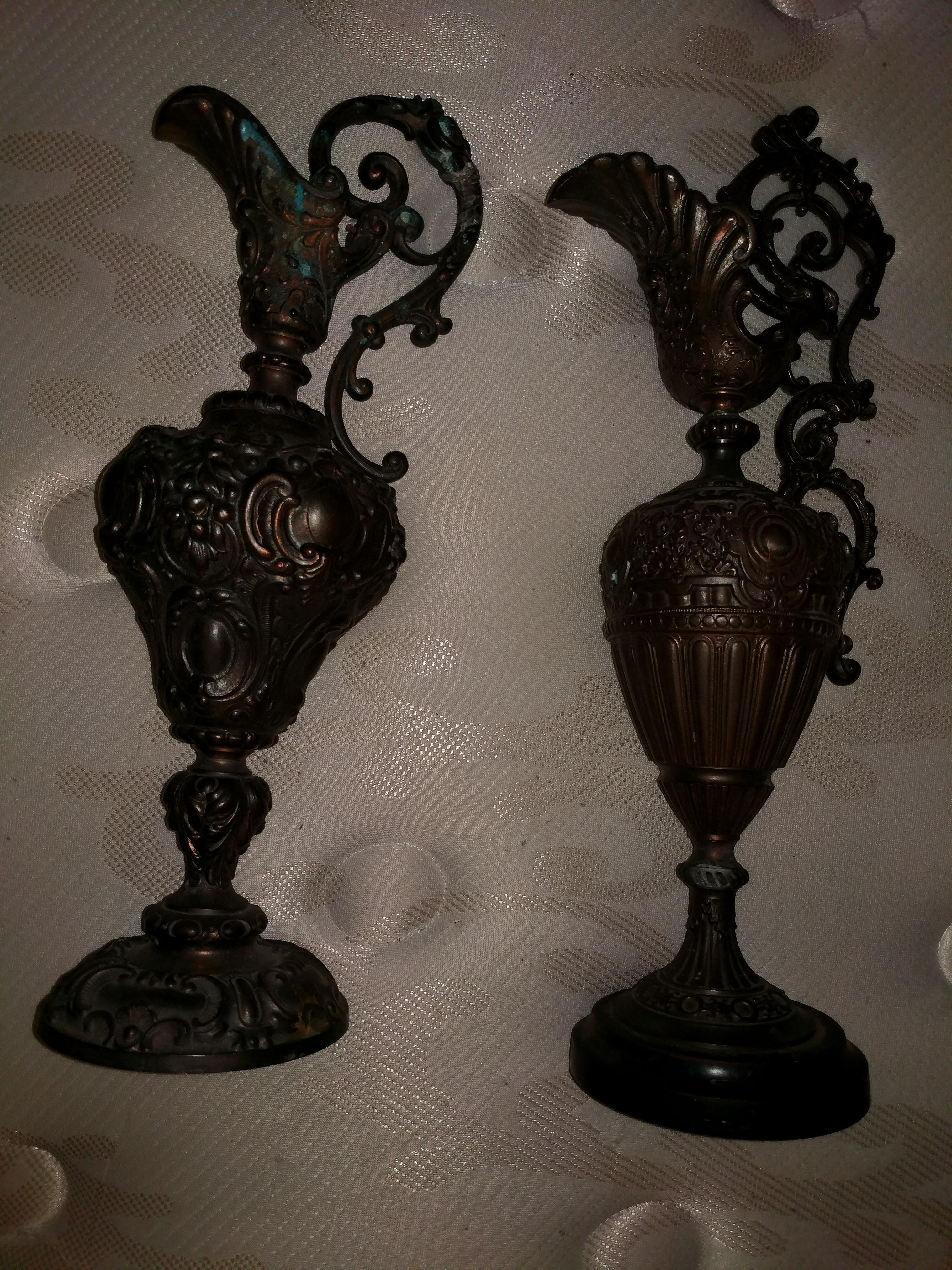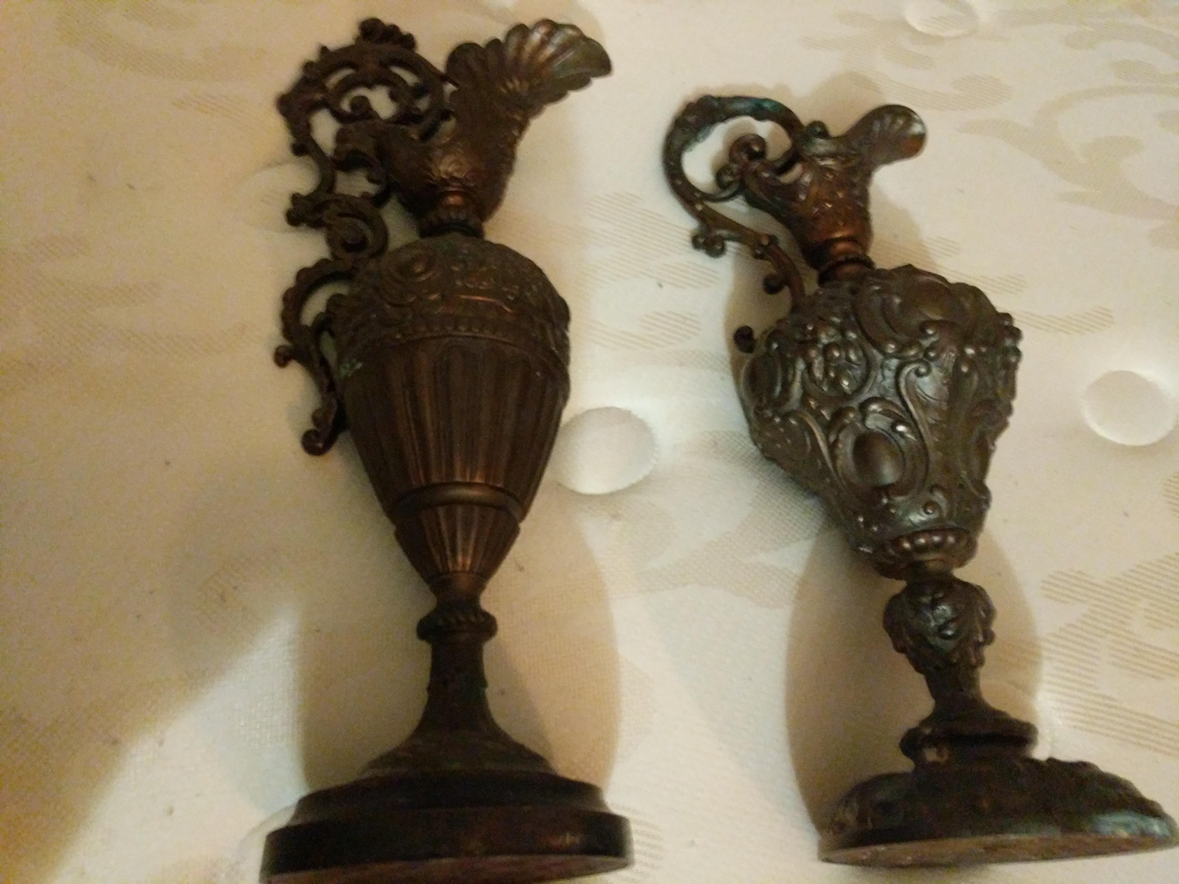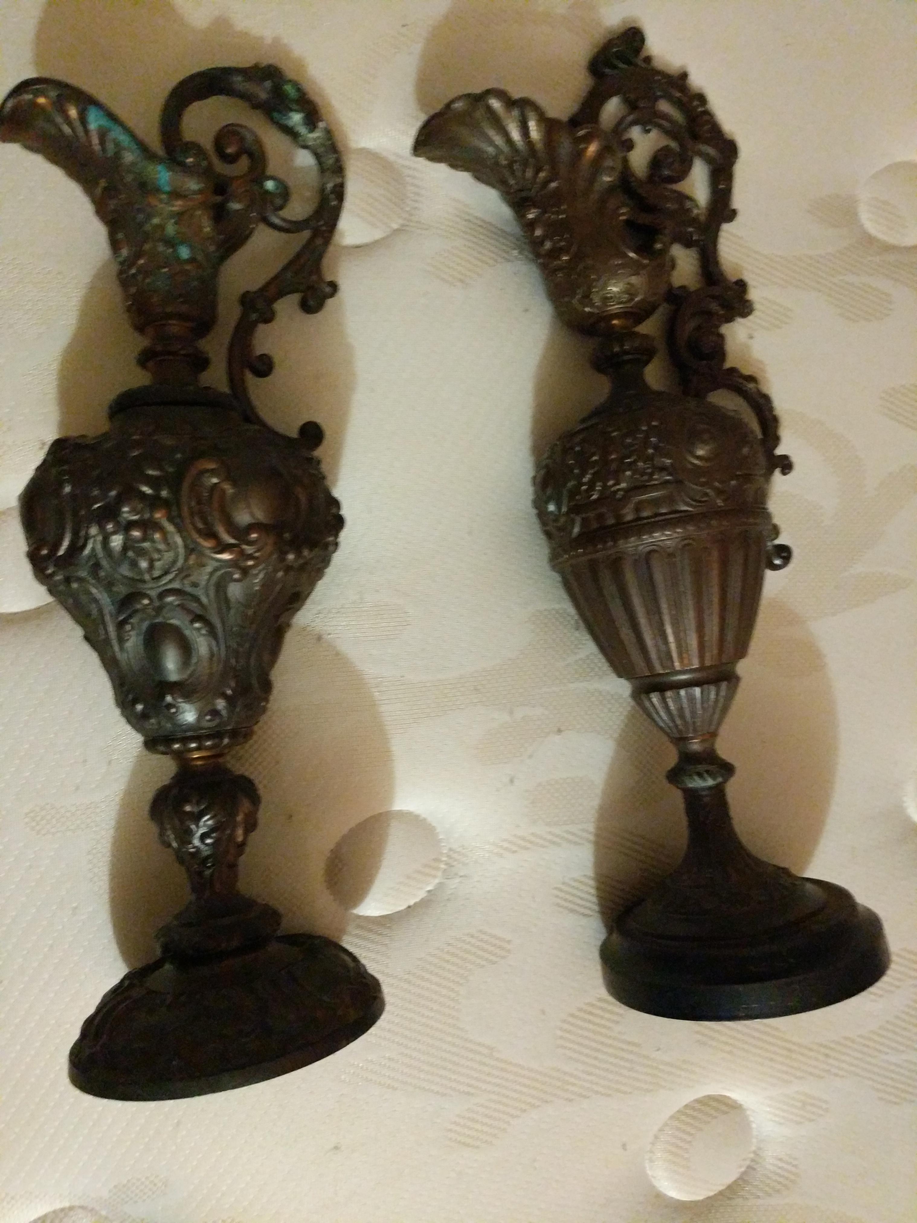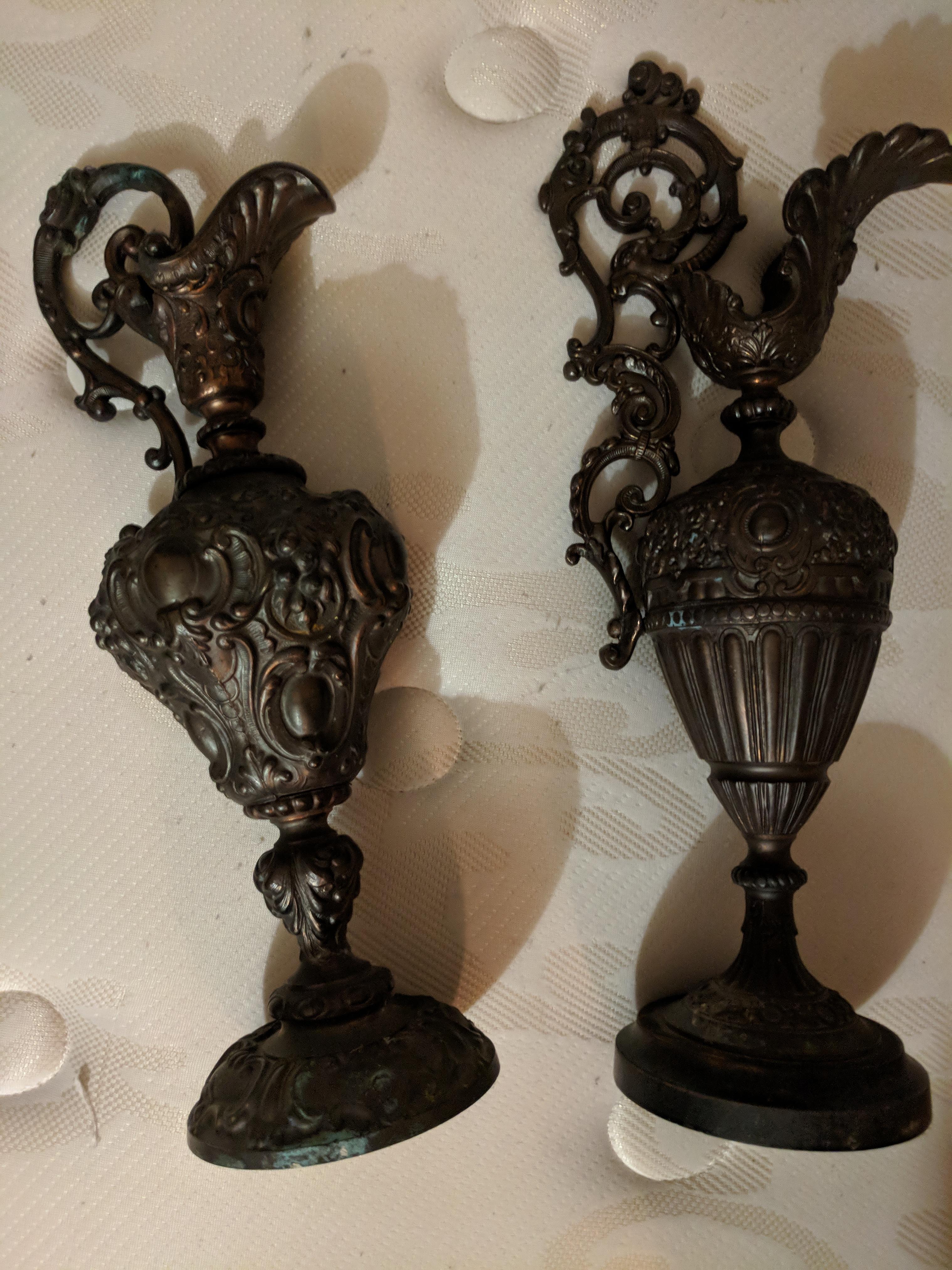 Set of antique water ewers, the face of a cherub on the ornate handle of one & a Ram on the handle of the other. Both made of the same material, solid brass I think or maybe bronze. They have a Grape clusters design on both although slightly different. Both have round bases & almost the same size, measuring 15 3/4 & 17 1/4 inches tall.