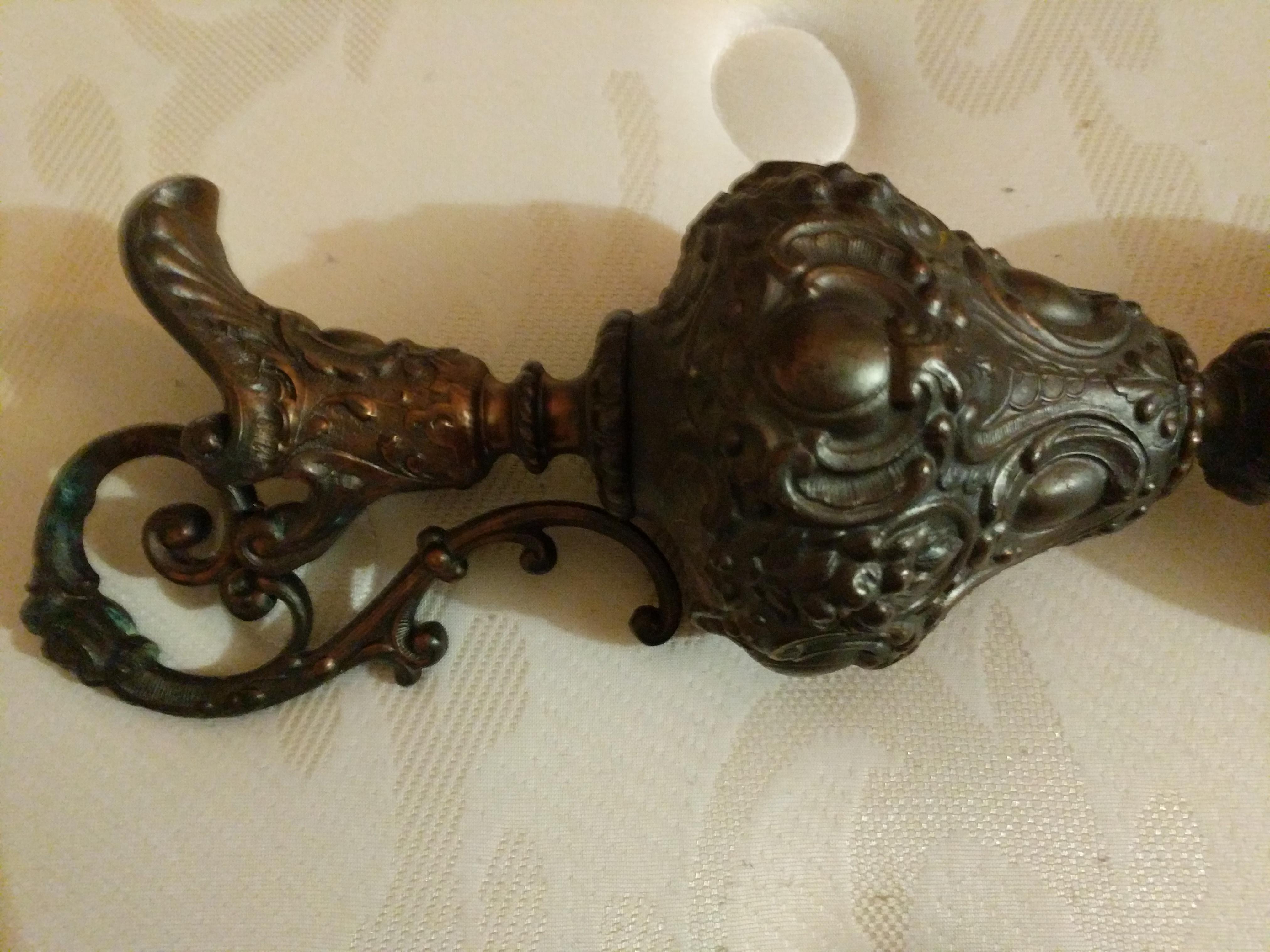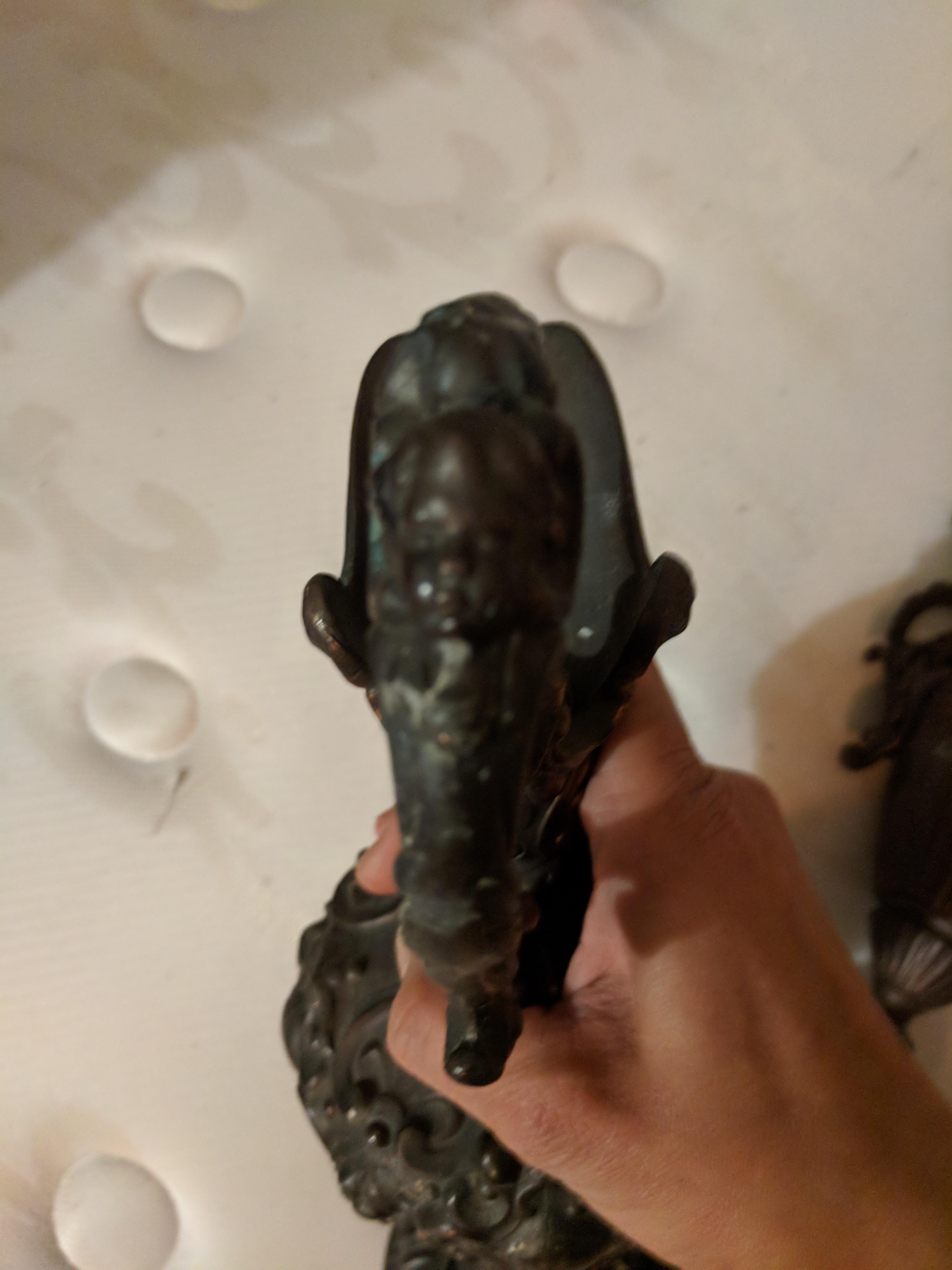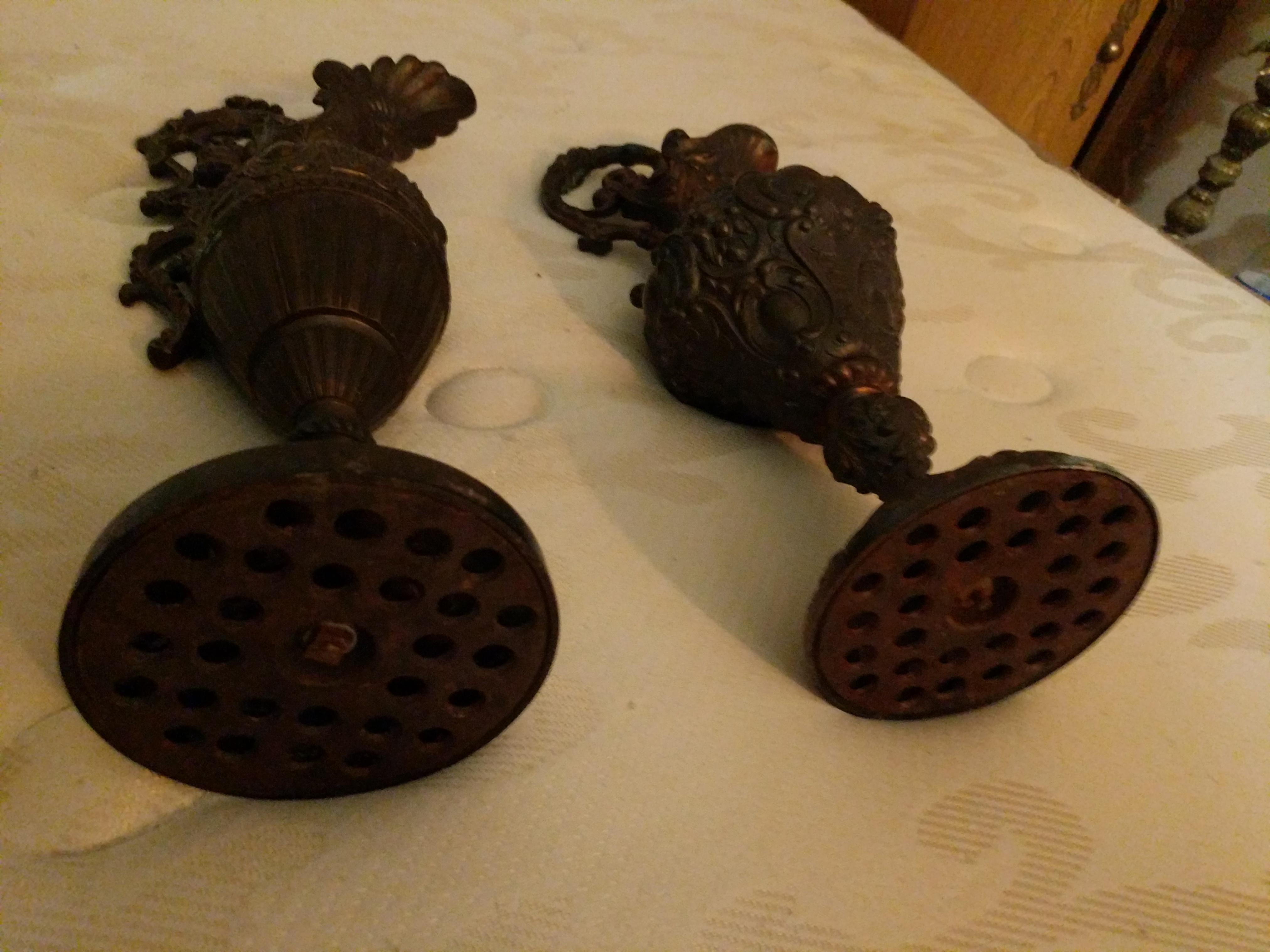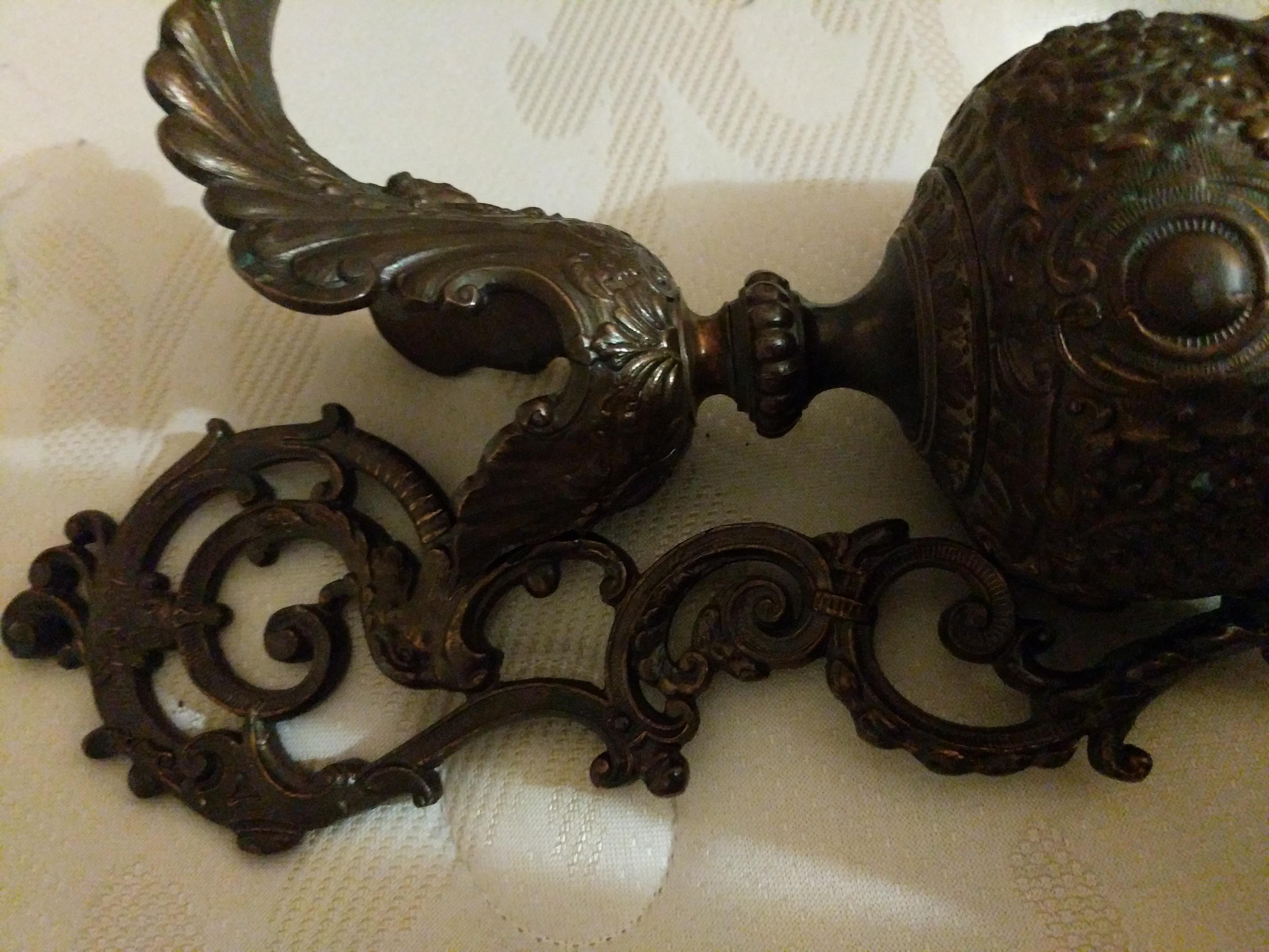 Set of antique water ewers, the face of a cherub on the ornate handle of one & a Ram on the handle of the other. Both made of the same material, solid brass I think or maybe bronze. They have a Grape clusters design on both although slightly different. Both have round bases & almost the same size, measuring 15 3/4 & 17 1/4 inches tall.