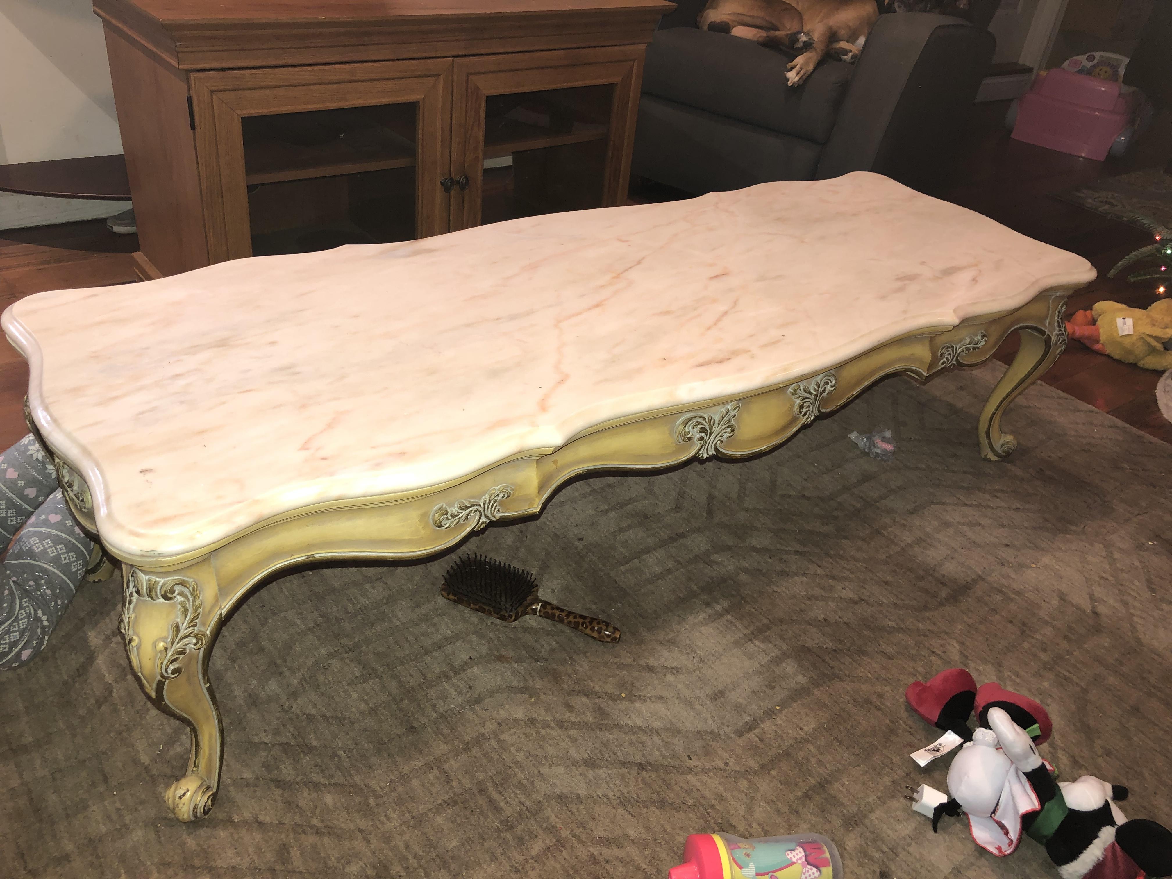 This is a Weiman table. It has a real marble top and is longer than a modern coffee table. It has a mark on the table base that says Weiman Quality Tables 505-3306. I also have two end tables that I got with it that have a marble inlay on top and the Weiman mark with stamp that says heirloom. I can post pics of those if anyone knows anything about these tables! Thanks so much!
