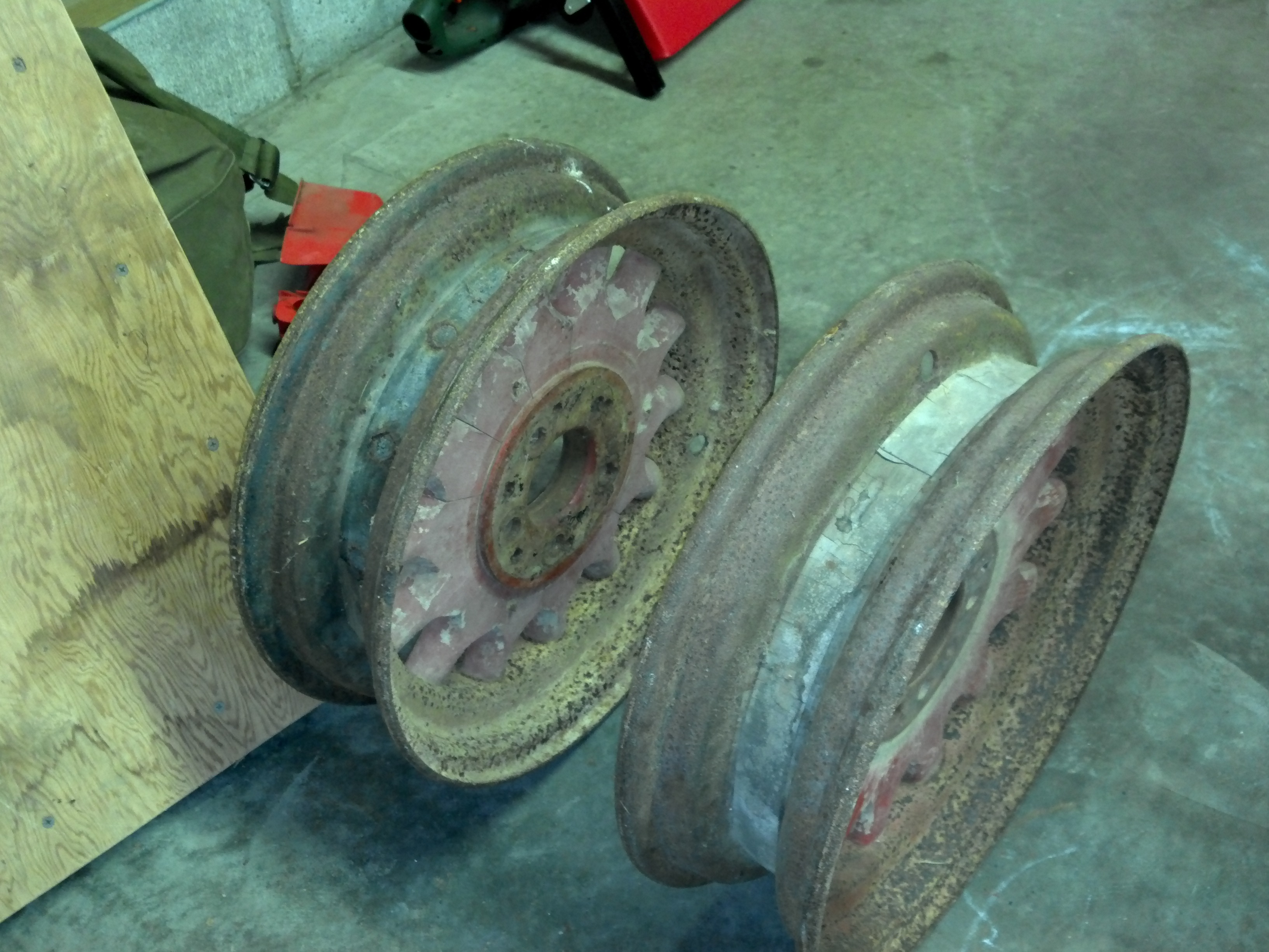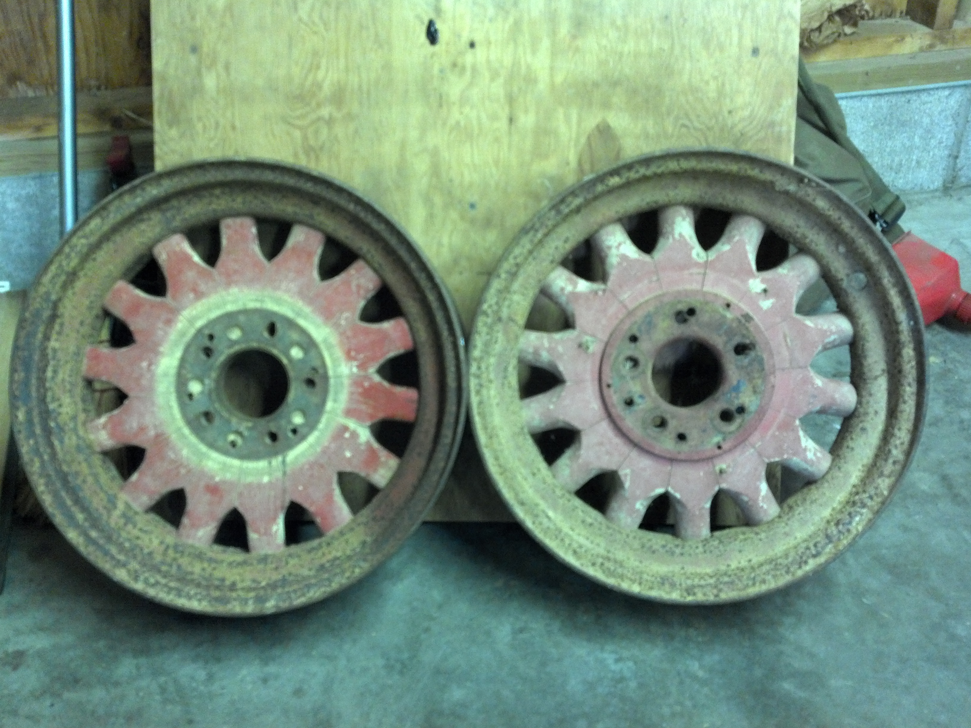 Found these wheels in my house when we moved in. They have red painted wooden spokes with metal outside and rubber strip running along circumference of the wheel.